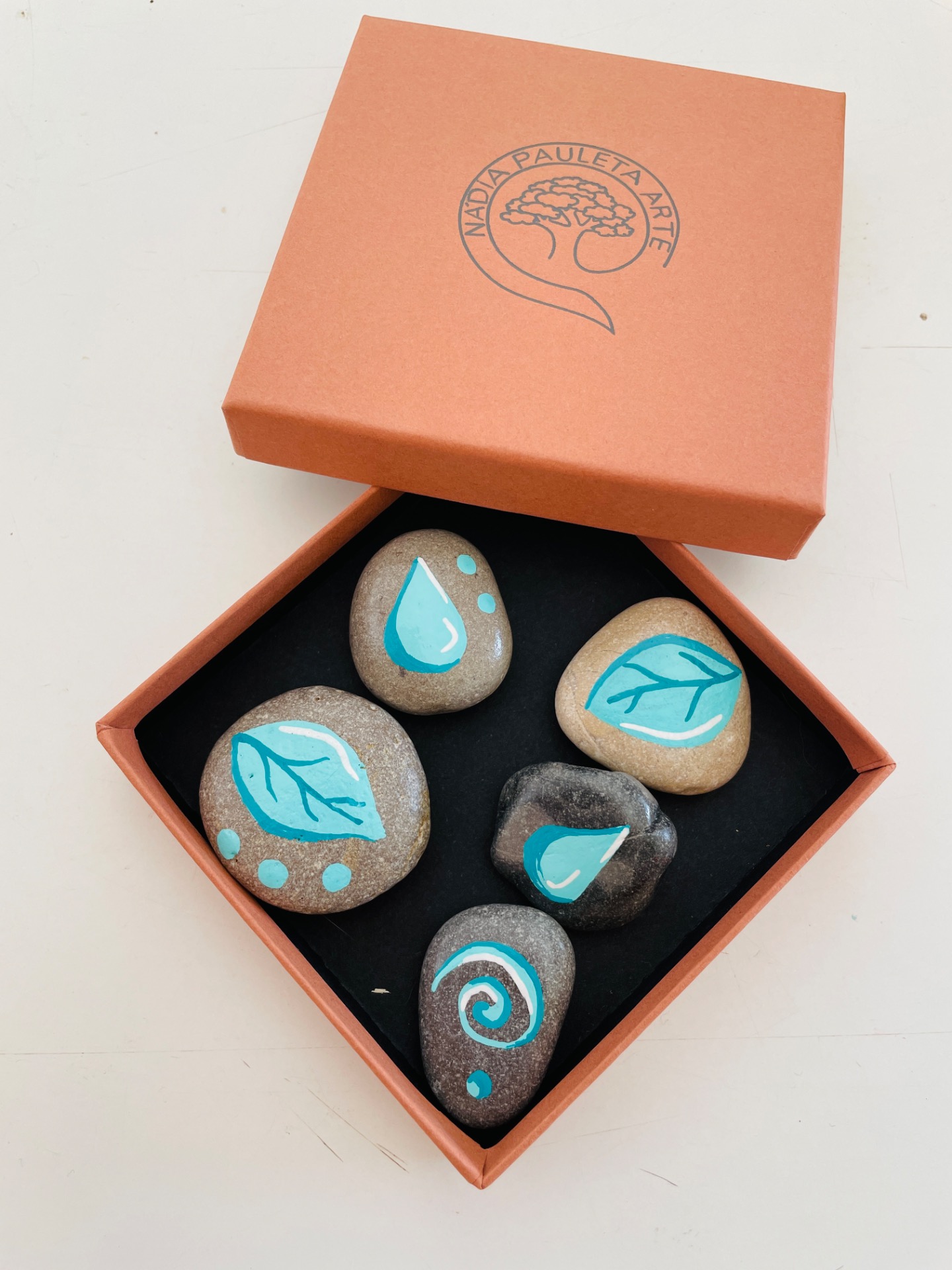 Caixa com cinco pedras pintadas com padrões e desenhos em tons de azul, com uma frase escrita por baixo de cada pedra. As frases são poéticas, de amor próprio, de força e de esperança.