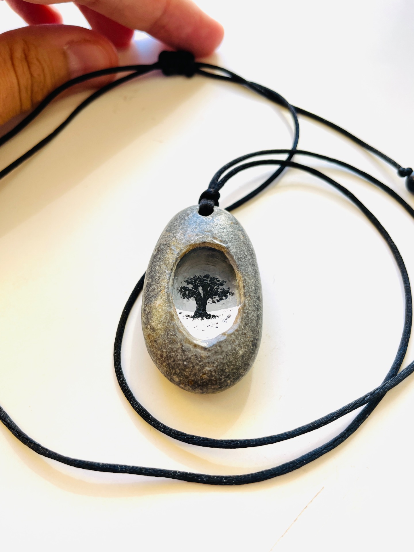 Colar com pedra esculpida e pintada à mão. Com um desenho de uma árvore escondida, como se guardasse um segredo de amor próprio. A parte de trás da pedra, tem escrita a frase “Aqui estou em paz”. Colar regulável com fio de cetim (polyester).
