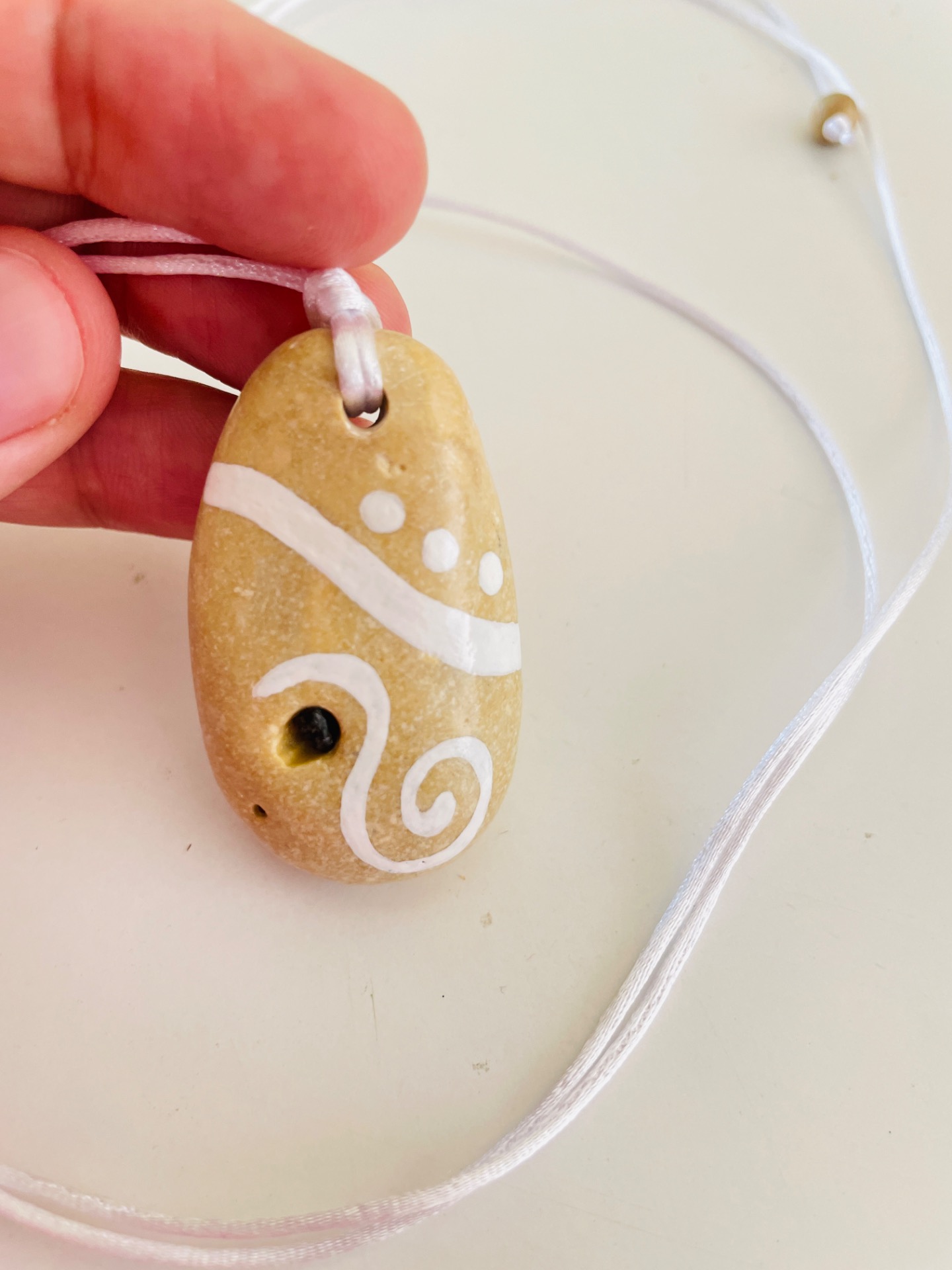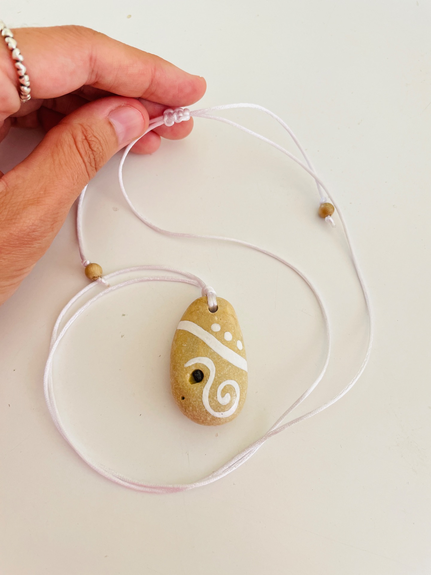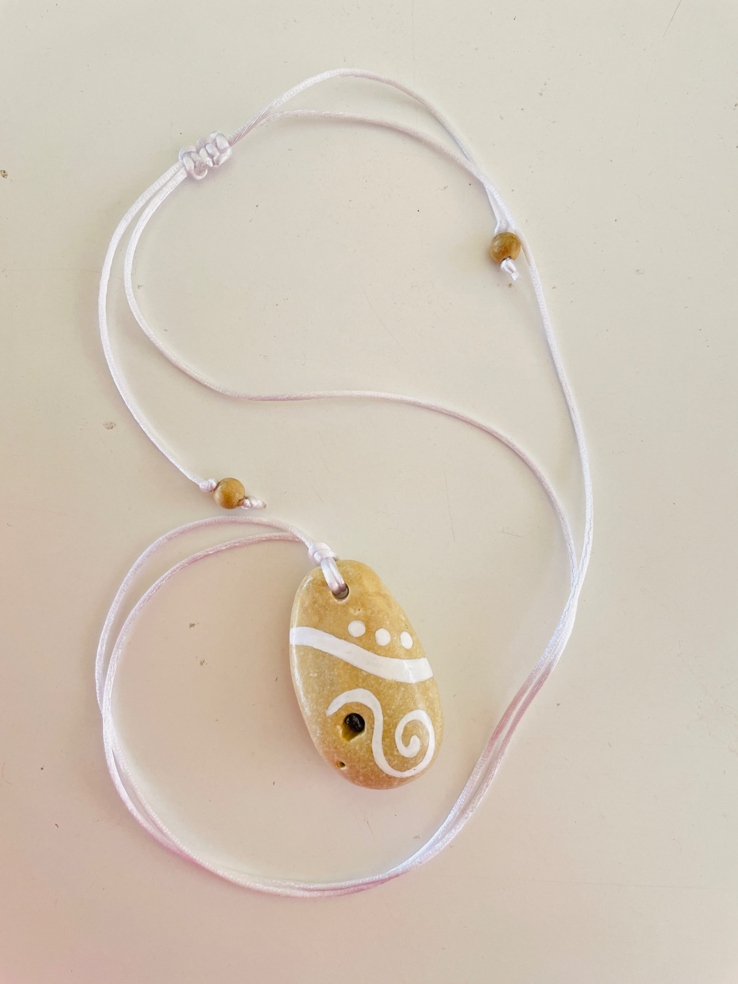 Colar com pintada à mão, artesanal. A pedra apanhada na praia tem uma pequena pedra escura escondida. O desenho envolve a pedra pequena, como uma brisa suave.Colar regulável com fio de cetim (polyester).