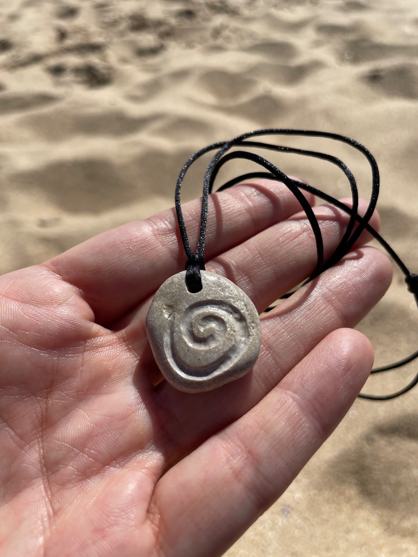 Colar com pedra esculpida à mão, artesanal. A pedra apanhada na praia é um pedaço desta terra onde vivemos. A espiral é mágica, lembra o tronco de uma árvore, a concha de um búzio, o vento a rodopiar, a vida.