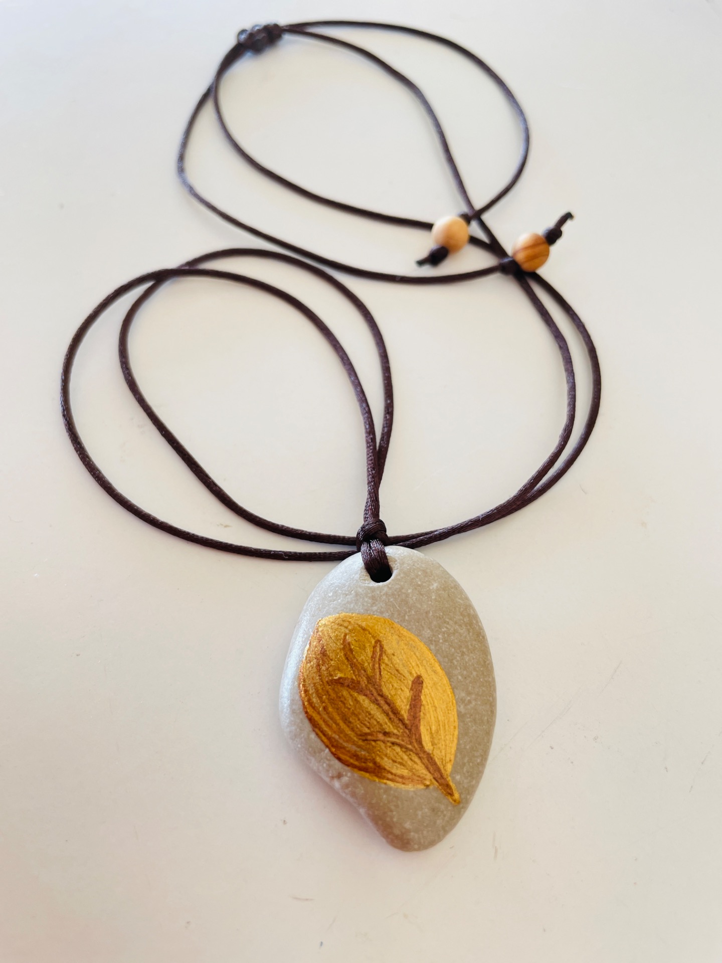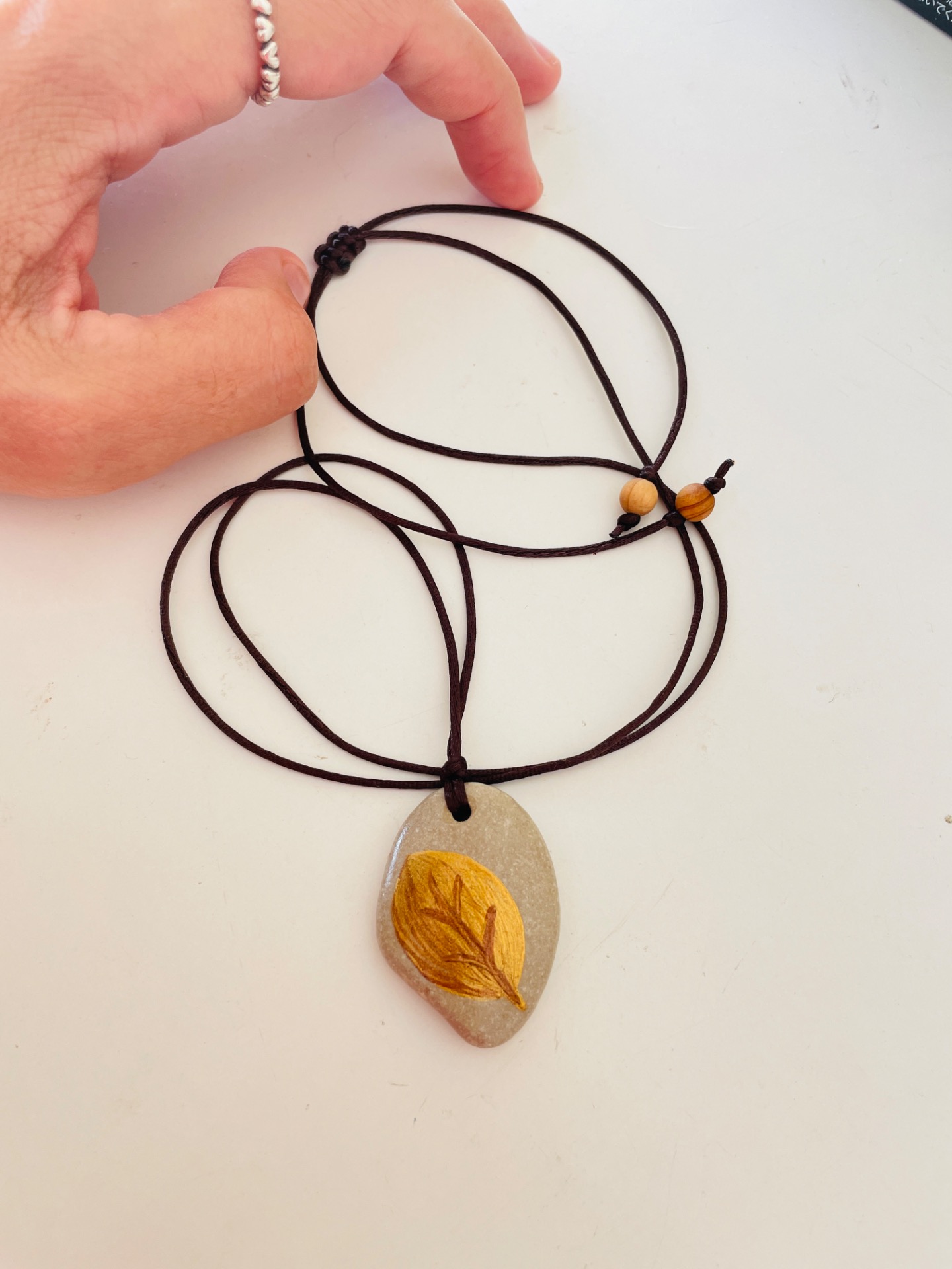 Colar com pedra pintada à mão, artesanal. A pedra apanhada na praia é um pedaço desta terra onde vivemos. O desenho da folha representa natureza, crescimento, vida, liberdade.Colar regulável com fio de cetim (polyester).