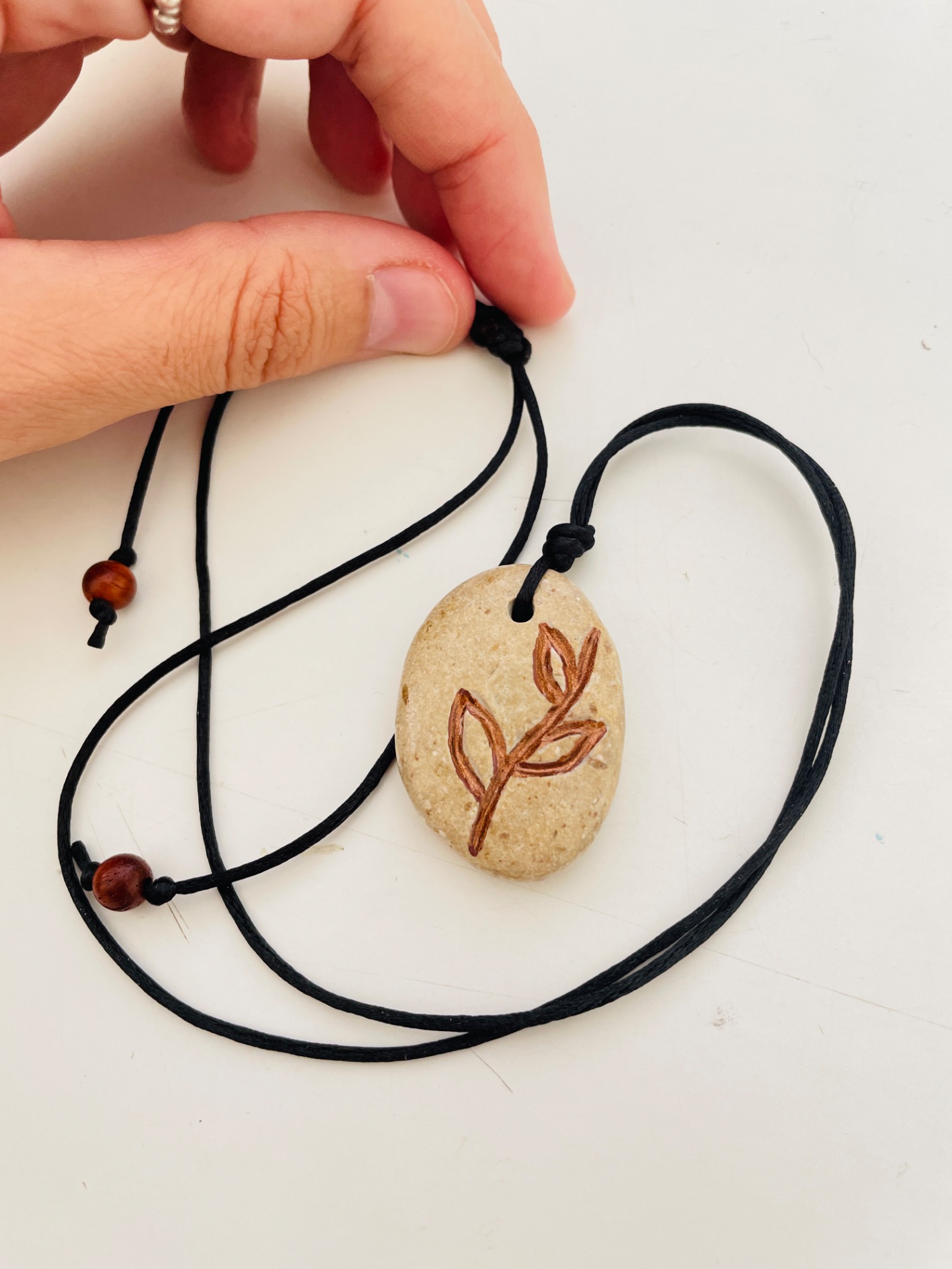 Colar com pedra esculpida e pintada à mão, artesanal. A pedra apanhada na praia é um pedaço desta terra onde vivemos. O desenho das folhas representa natureza, crescimento, vida.Colar regulável com fio de cetim (polyester).