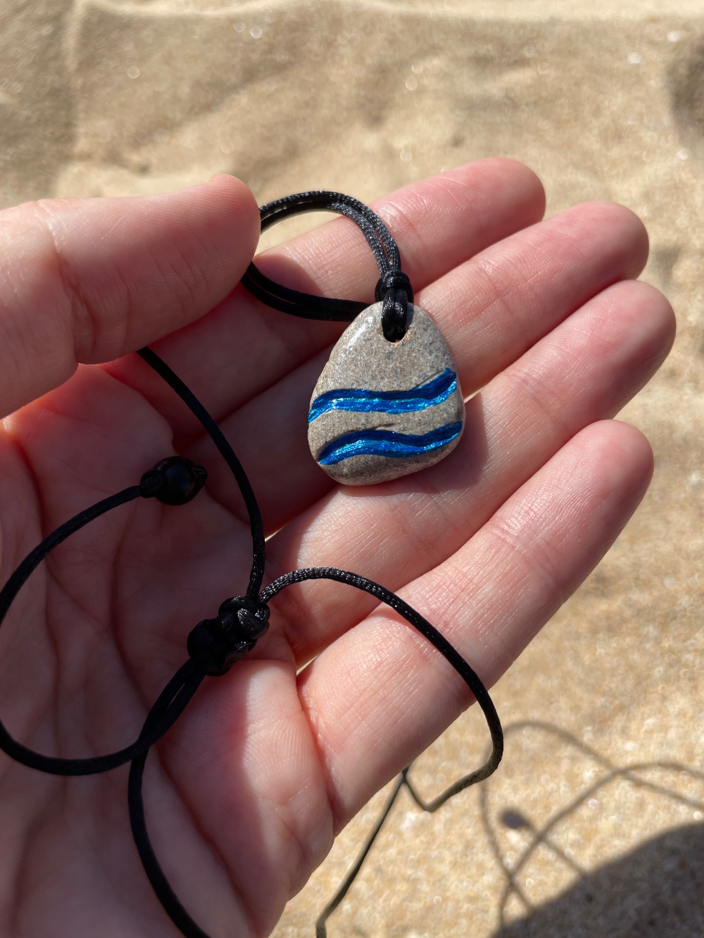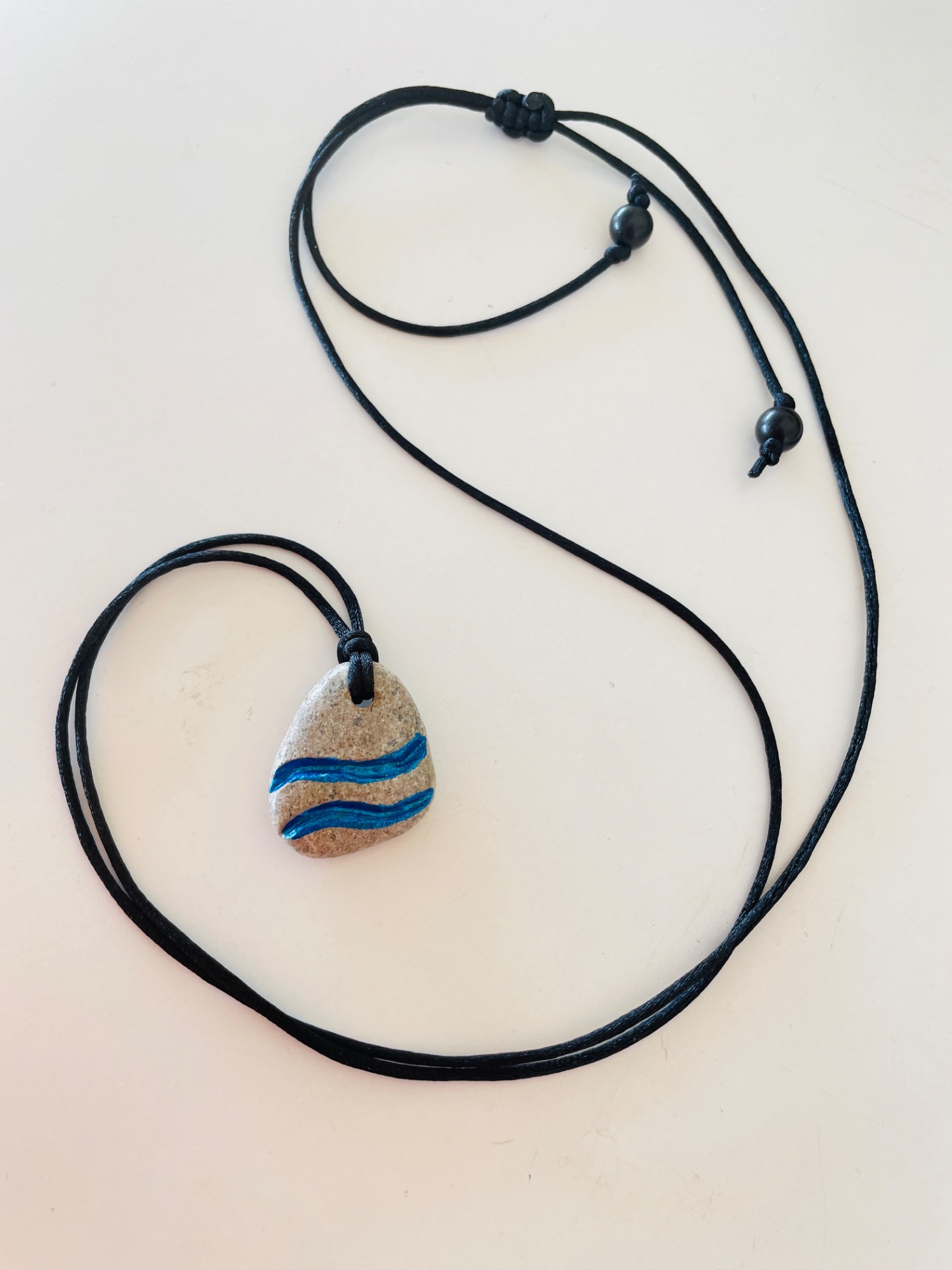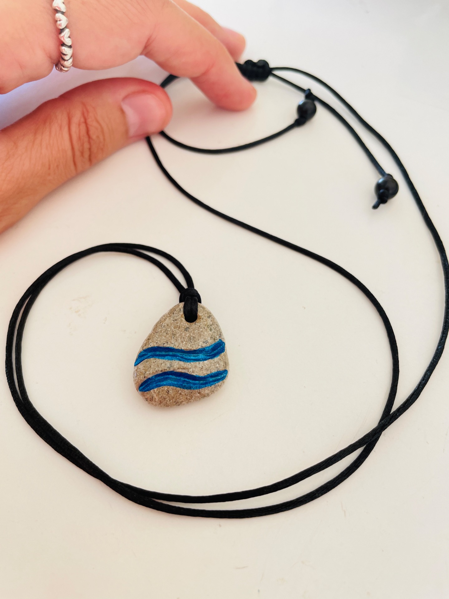 Colar com pedra esculpida e pintada à mão, artesanal. O desenho do mar representa a cadência da vida, como as fases da vida podem ser tão diferentes para cada um de nós. Em tom de azul metálico.Colar regulável com fio de cetim (polyester).