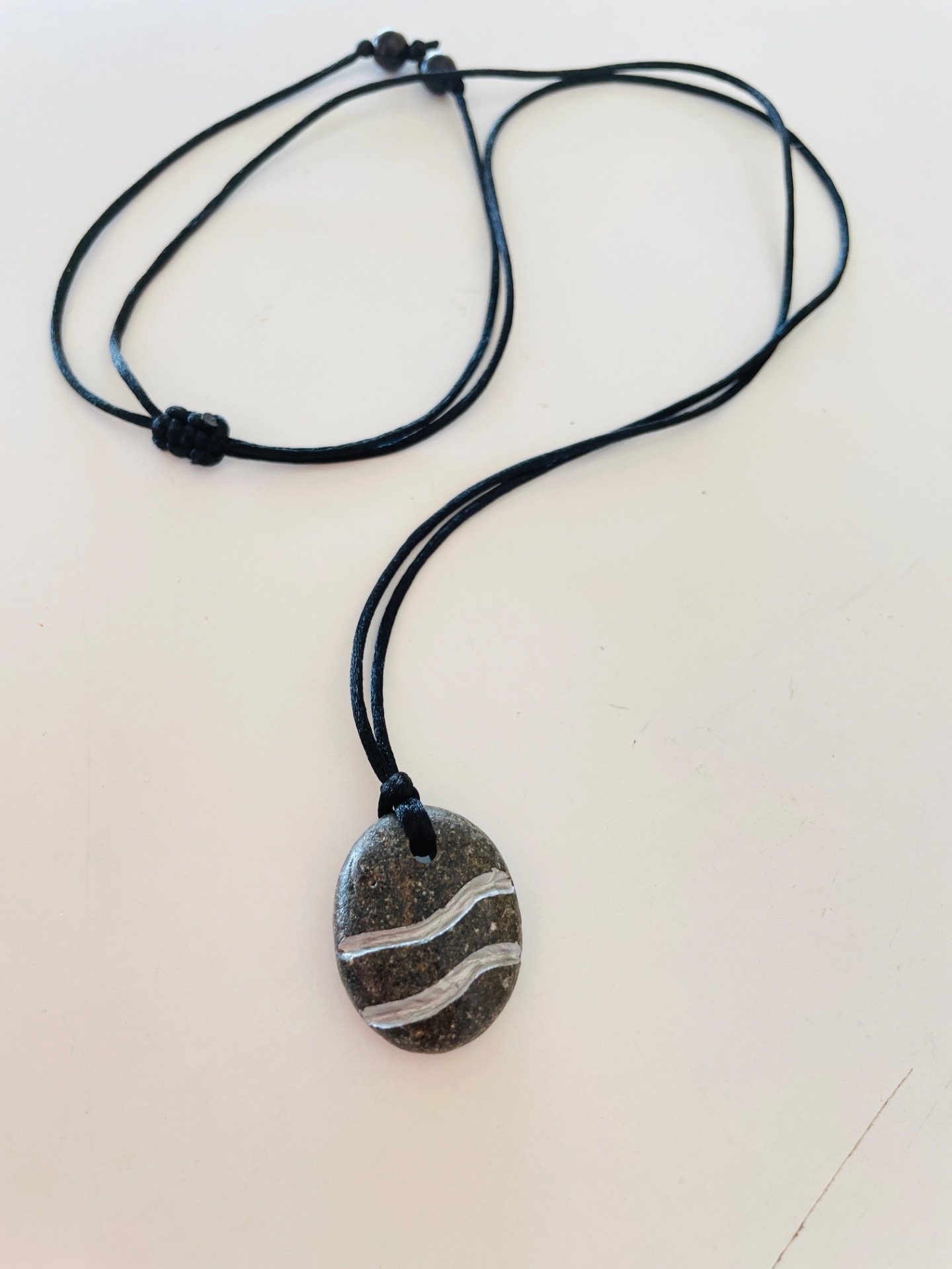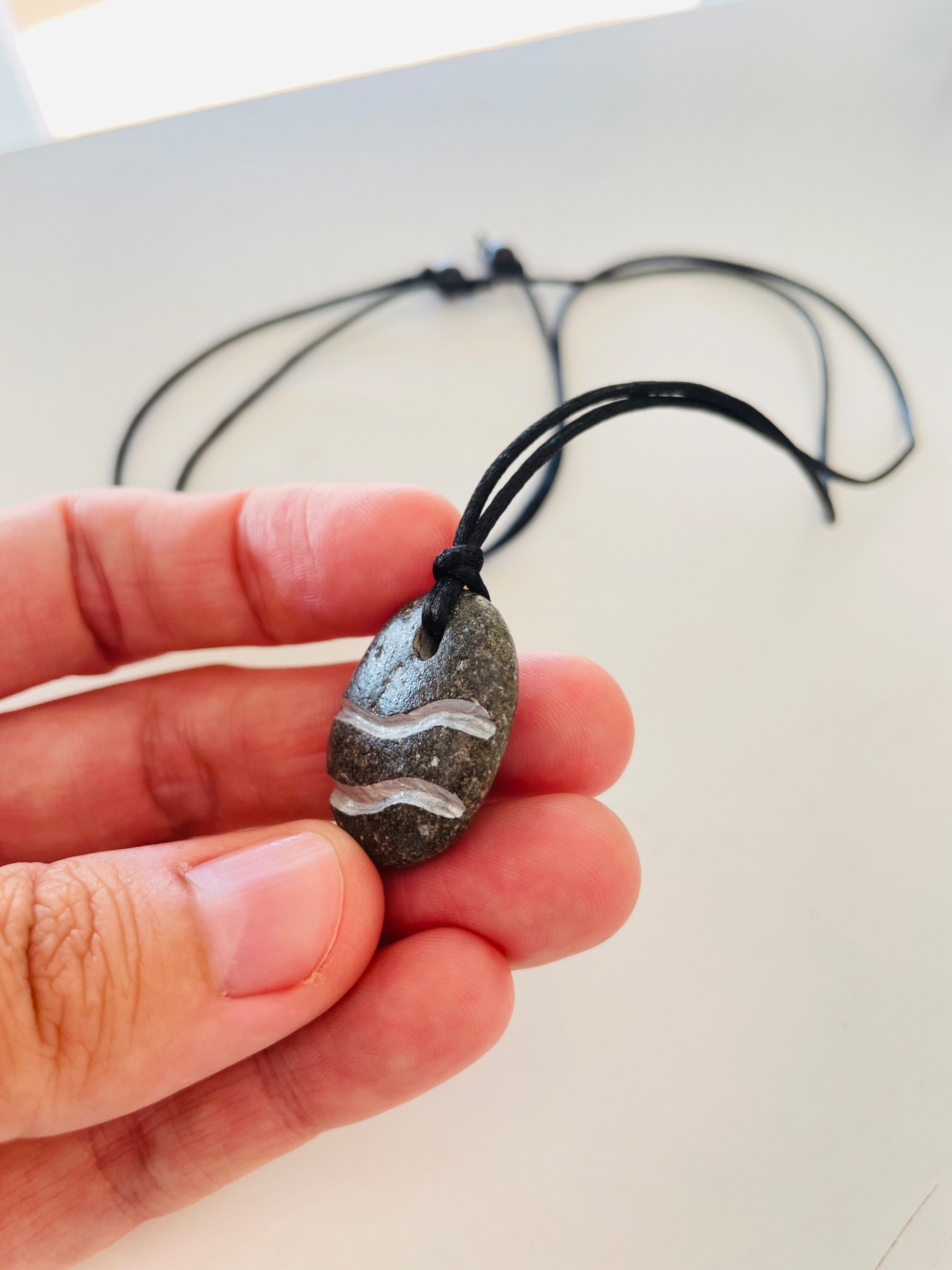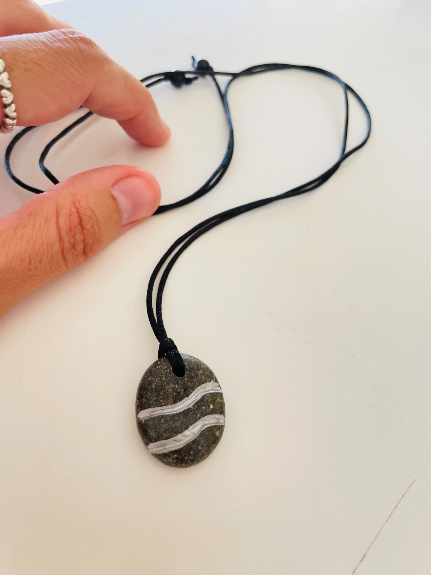 Colar com pedra esculpida e pintada à mão, artesanal. A pedra apanhada na praia é um pedaço desta terra onde vivemos. O desenho do mar representa a cadência da vida, como as fases da vida podem ser tão diferentes para cada um de nós.