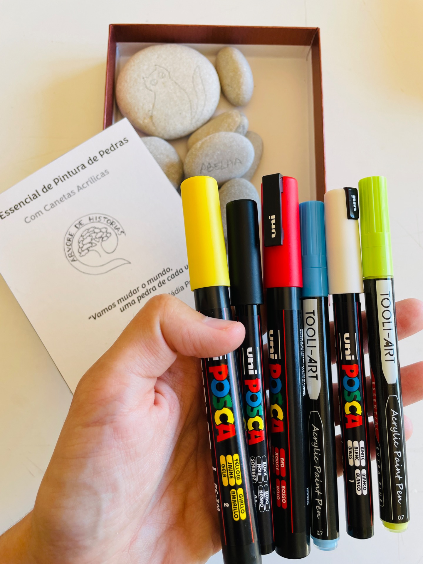 - Um conjunto de 6 canetas acrílicas, da marca Posca e Tooli-Art, de tamanhos diferentes (conjunto de cores básicas Branco, Preto, Amarelo, Vermelho, Azul e Verde).