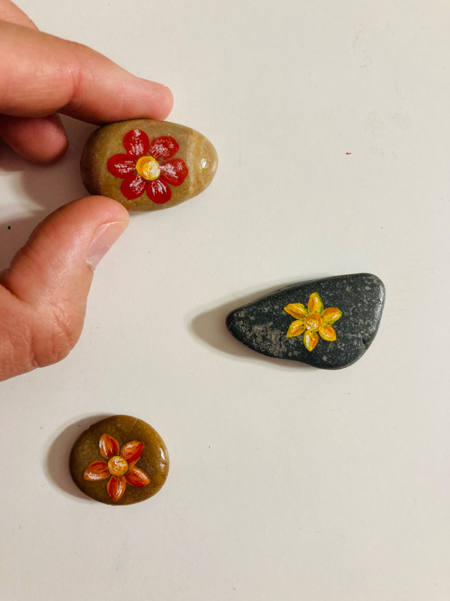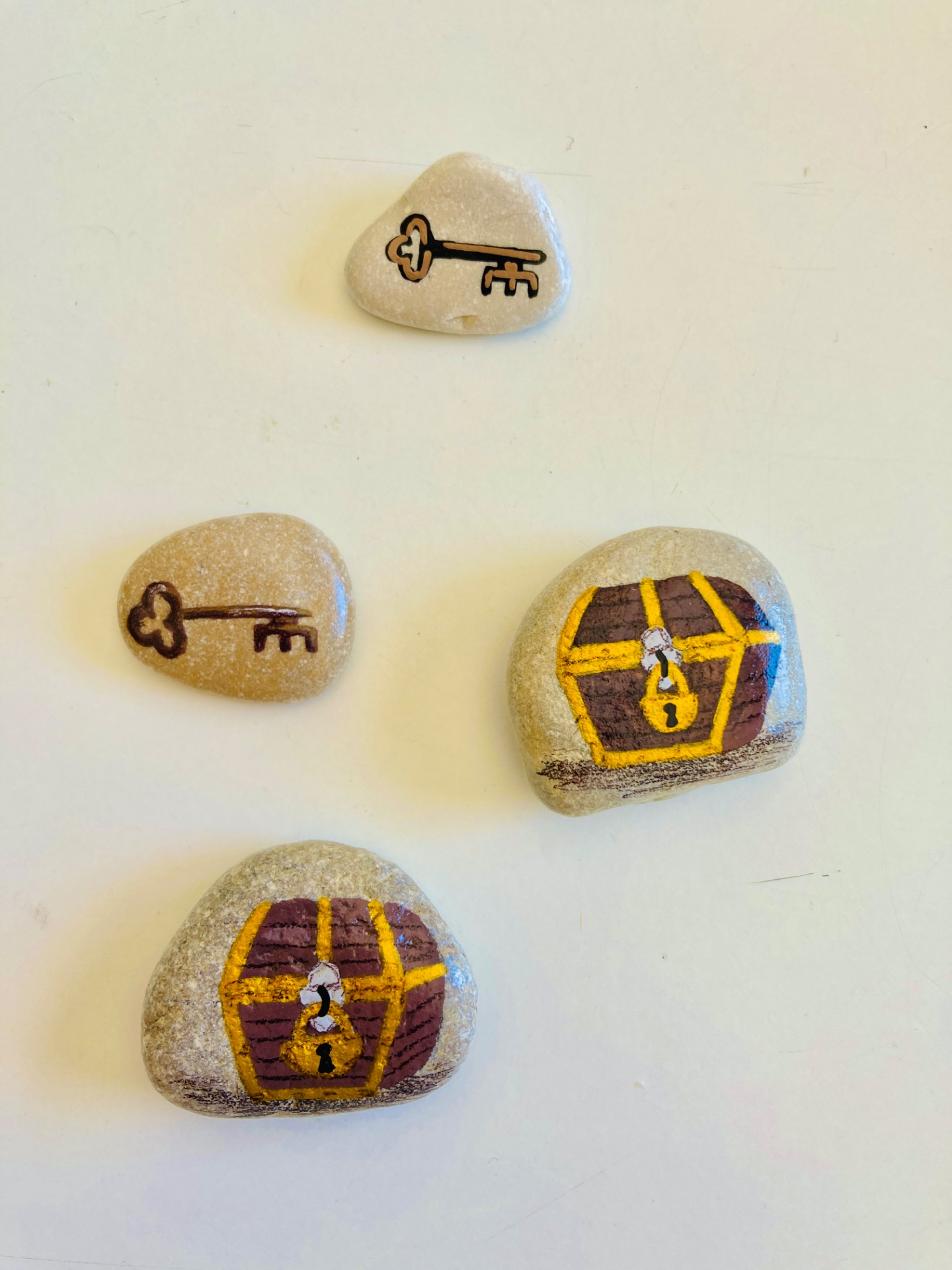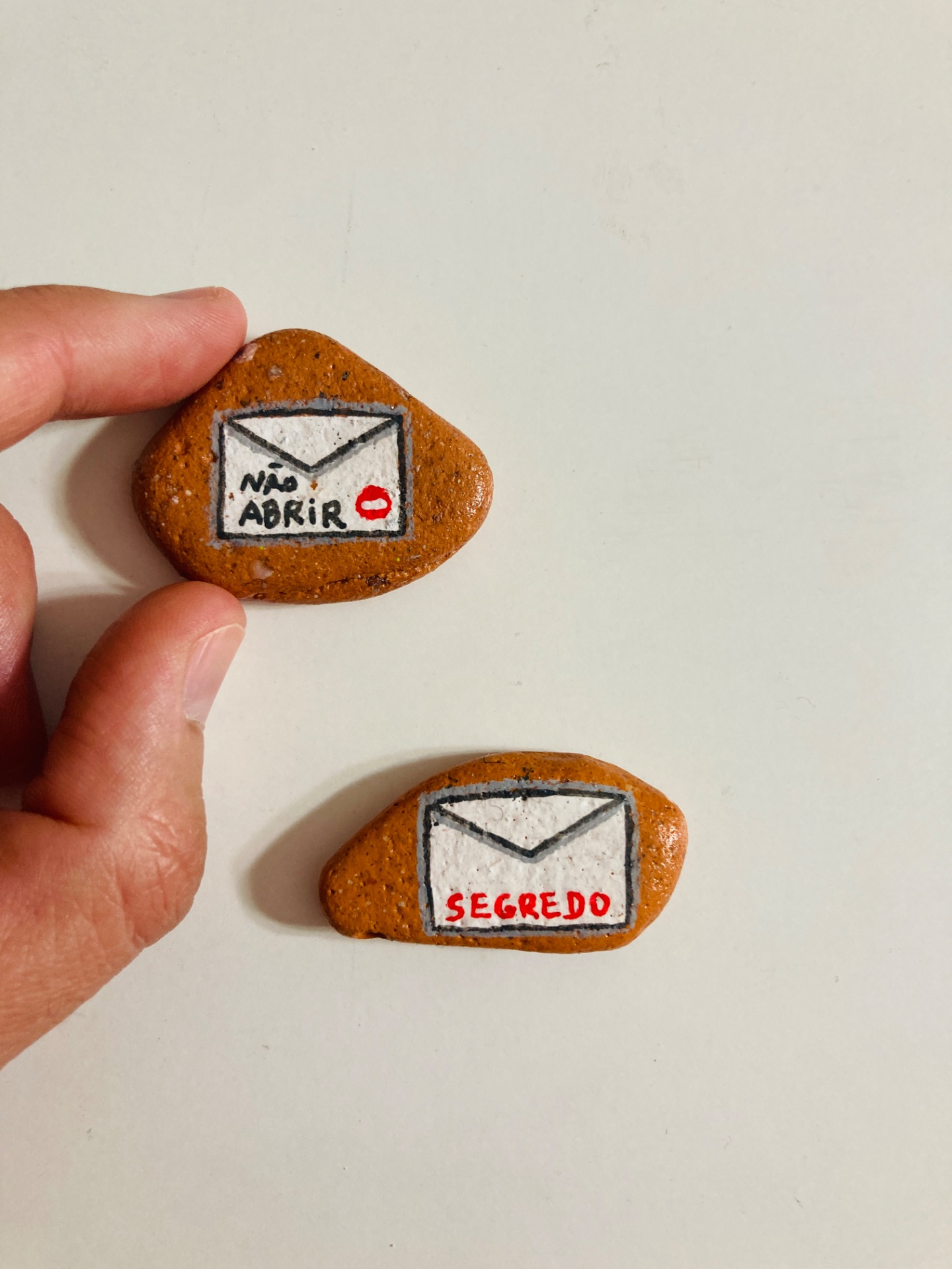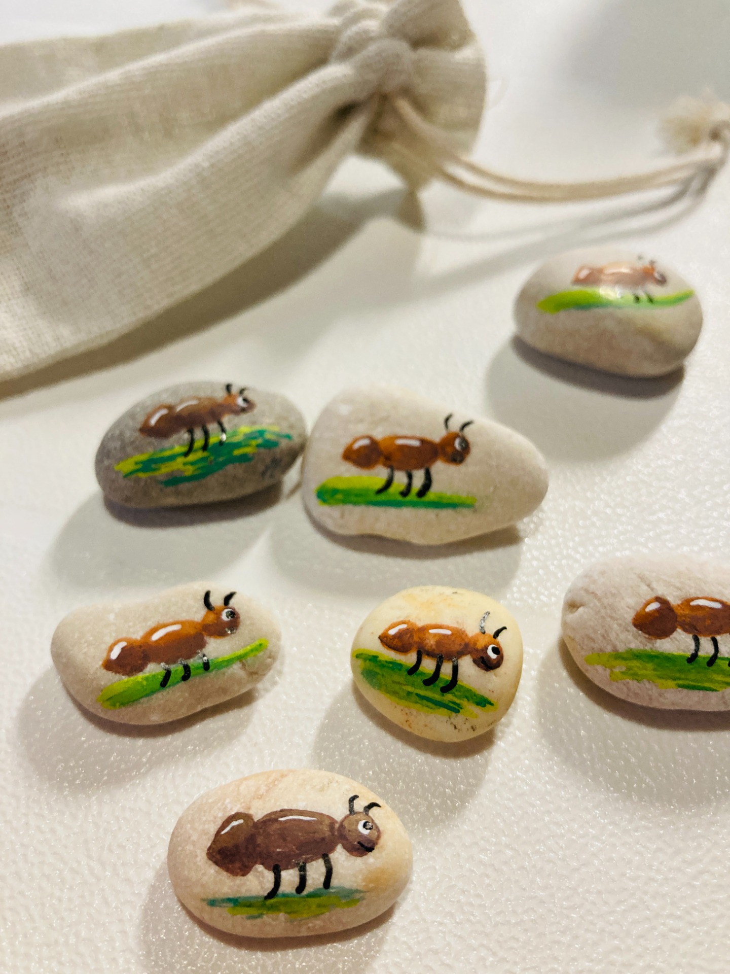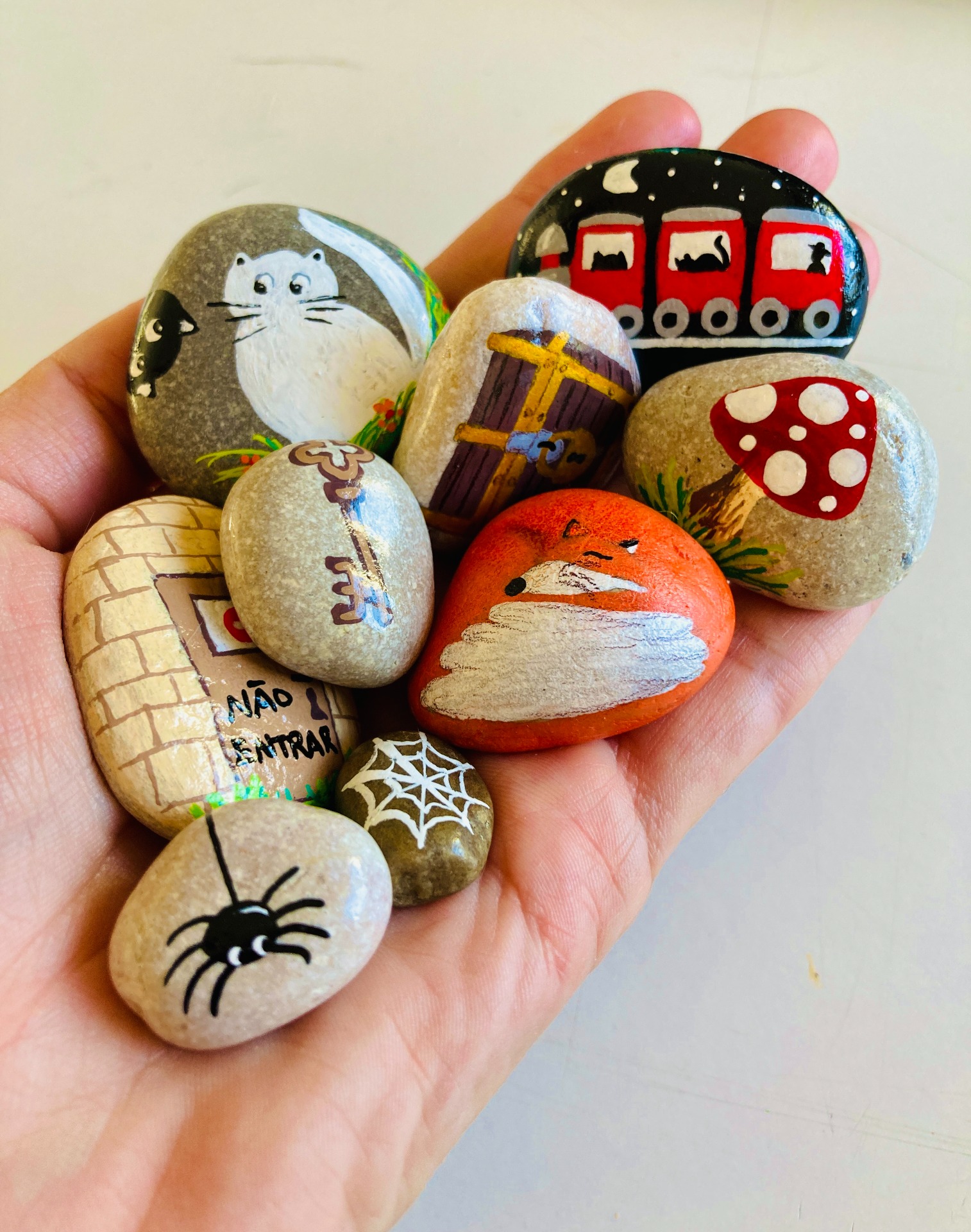 Pedras pintadas à mão com tinta acrílica. O tamanho das pedras varia entre 1 cm e 3 cm de comprimento. Podem ser utilizadas como extra para o jogo Era uma Vez.