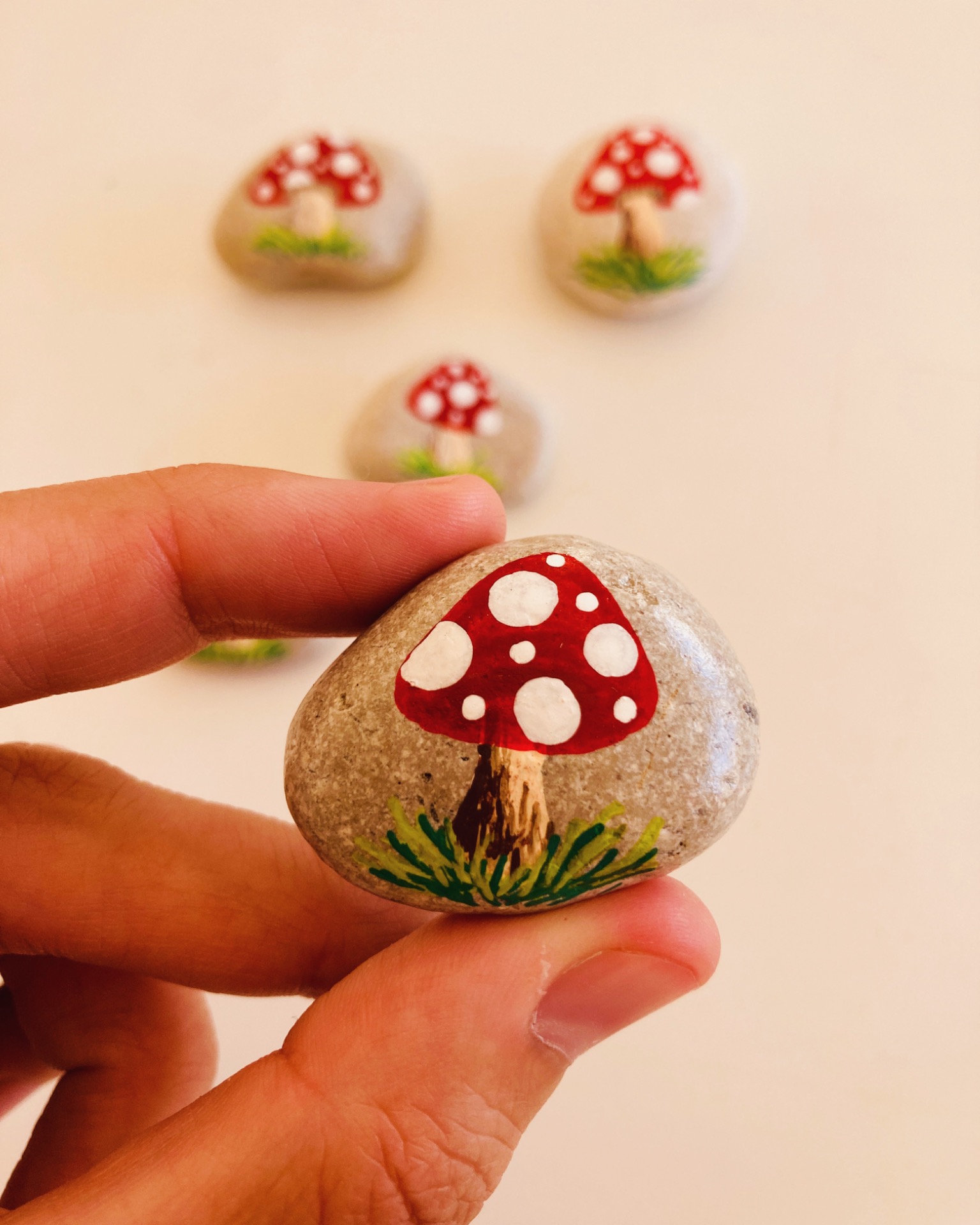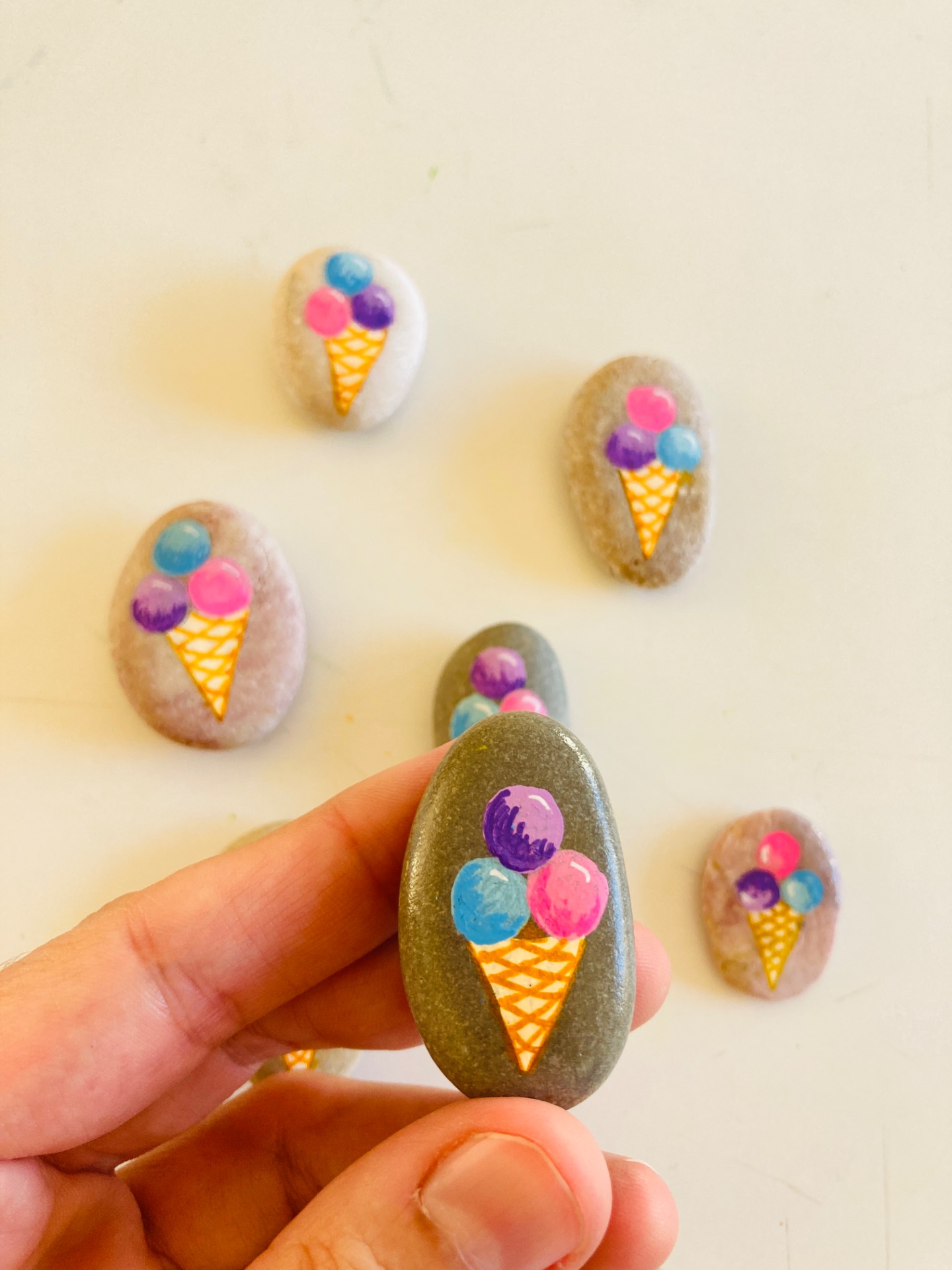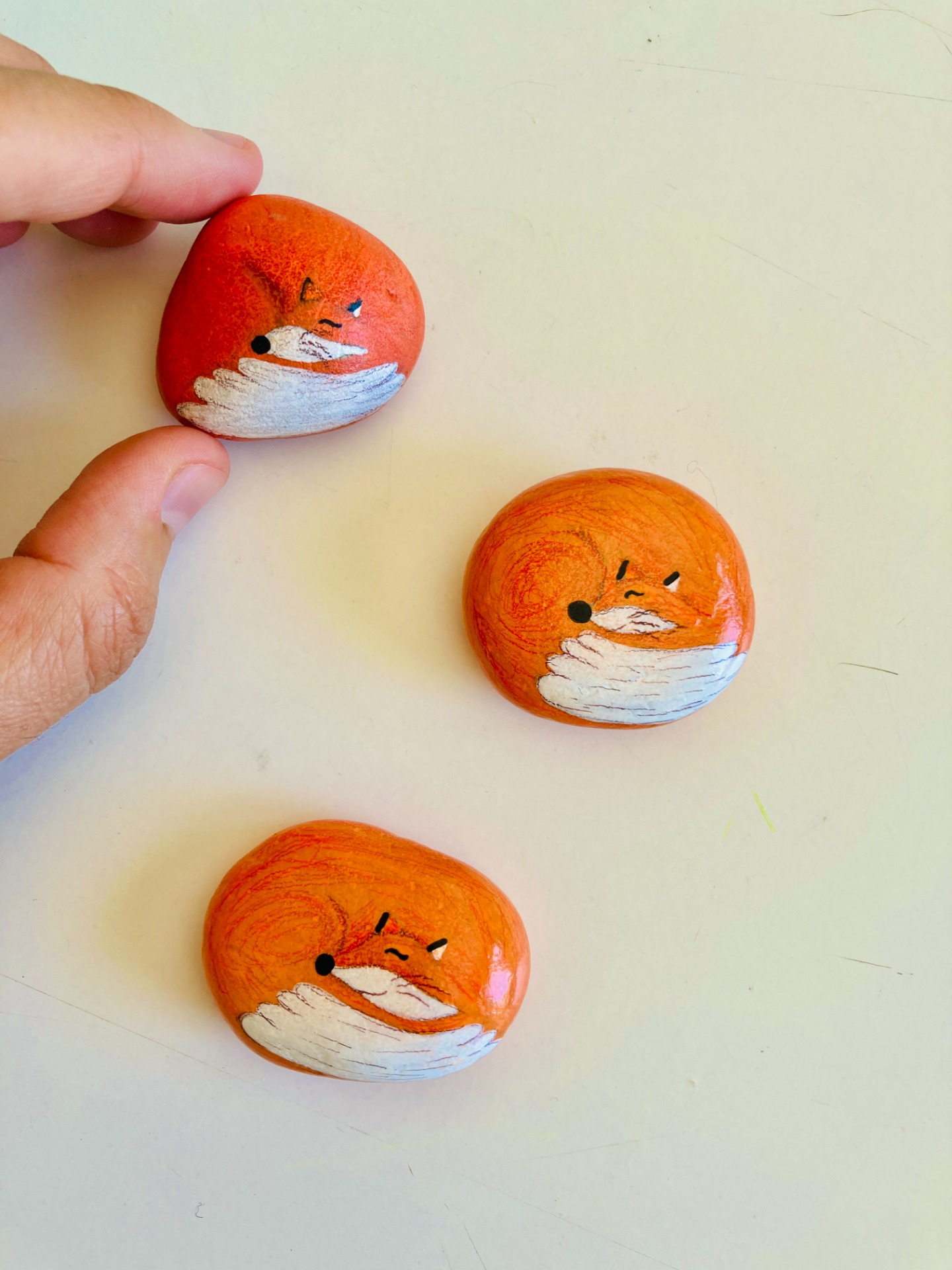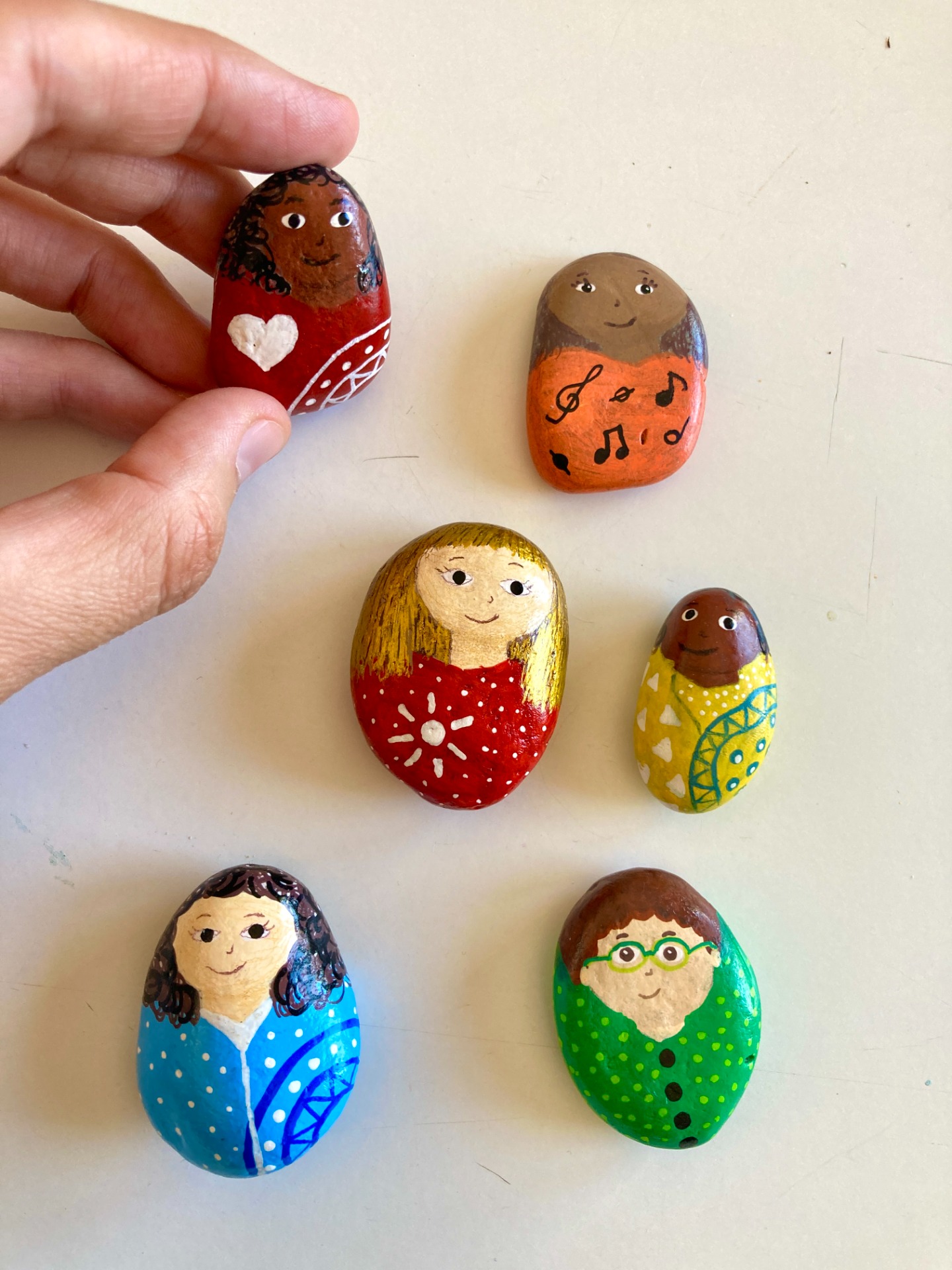 Pedras pintadas à mão com tinta acrílica. O tamanho das pedras varia entre 1 cm e 3 cm de comprimento. Podem ser utilizadas como extra para o jogo Era uma Vez.