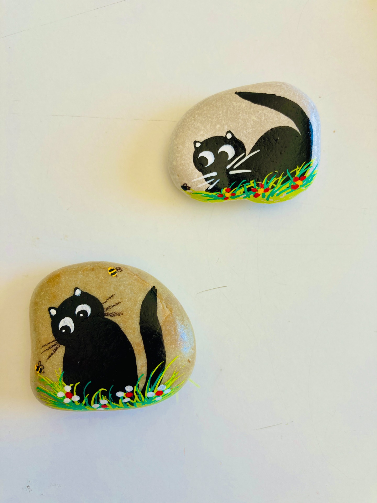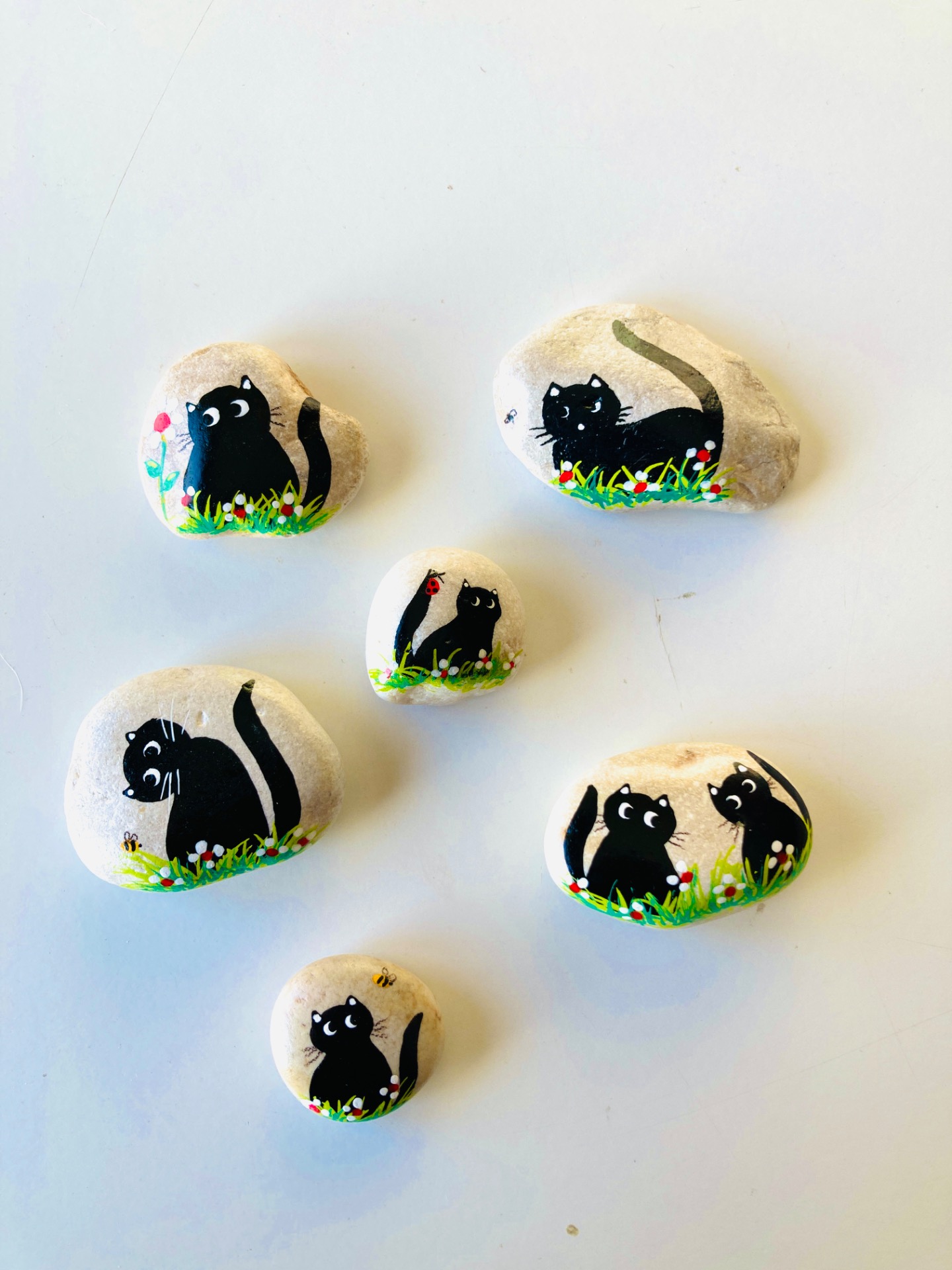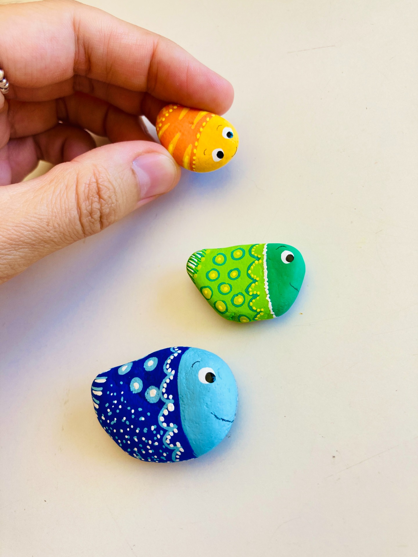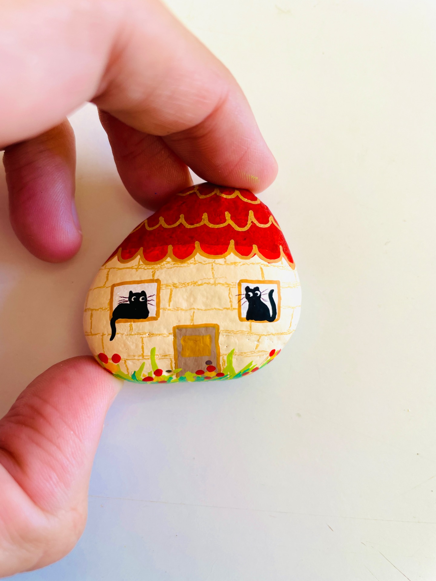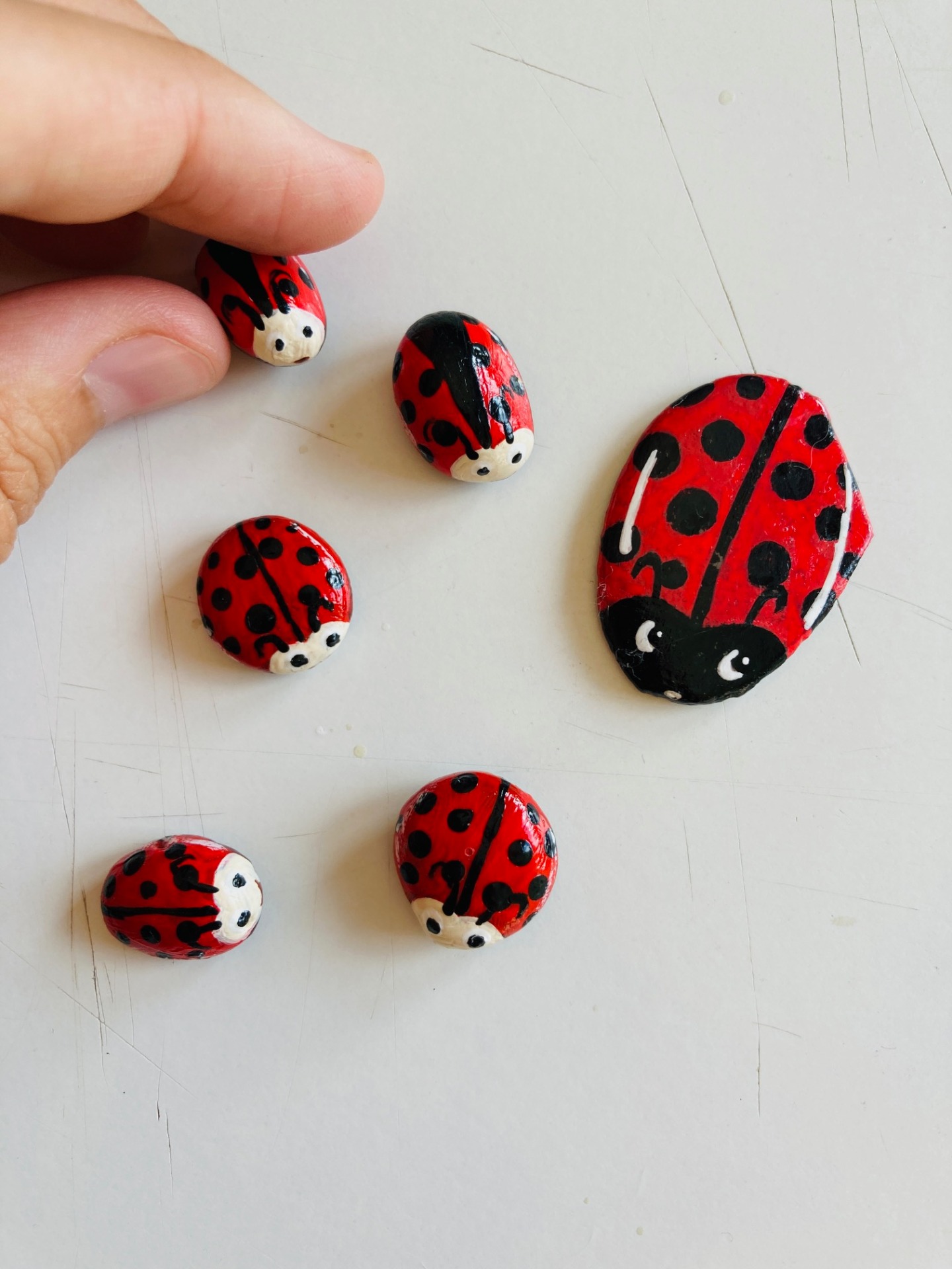 Pedras pintadas à mão com tinta acrílica. O tamanho das pedras varia entre 1 cm e 3 cm de comprimento. Podem ser utilizadas como extra para o jogo Era uma Vez.