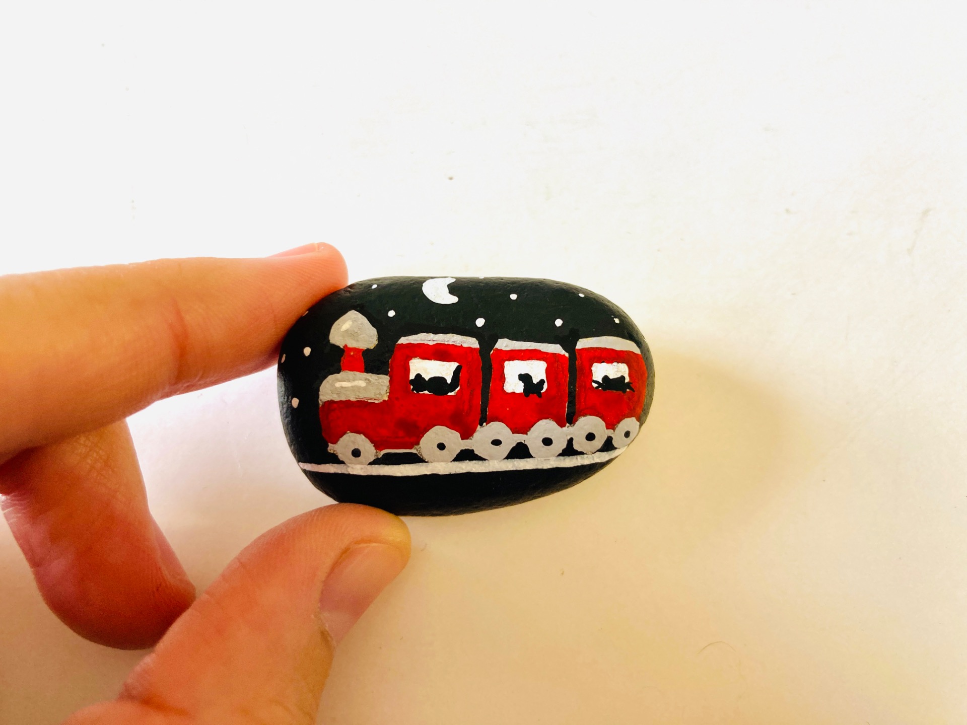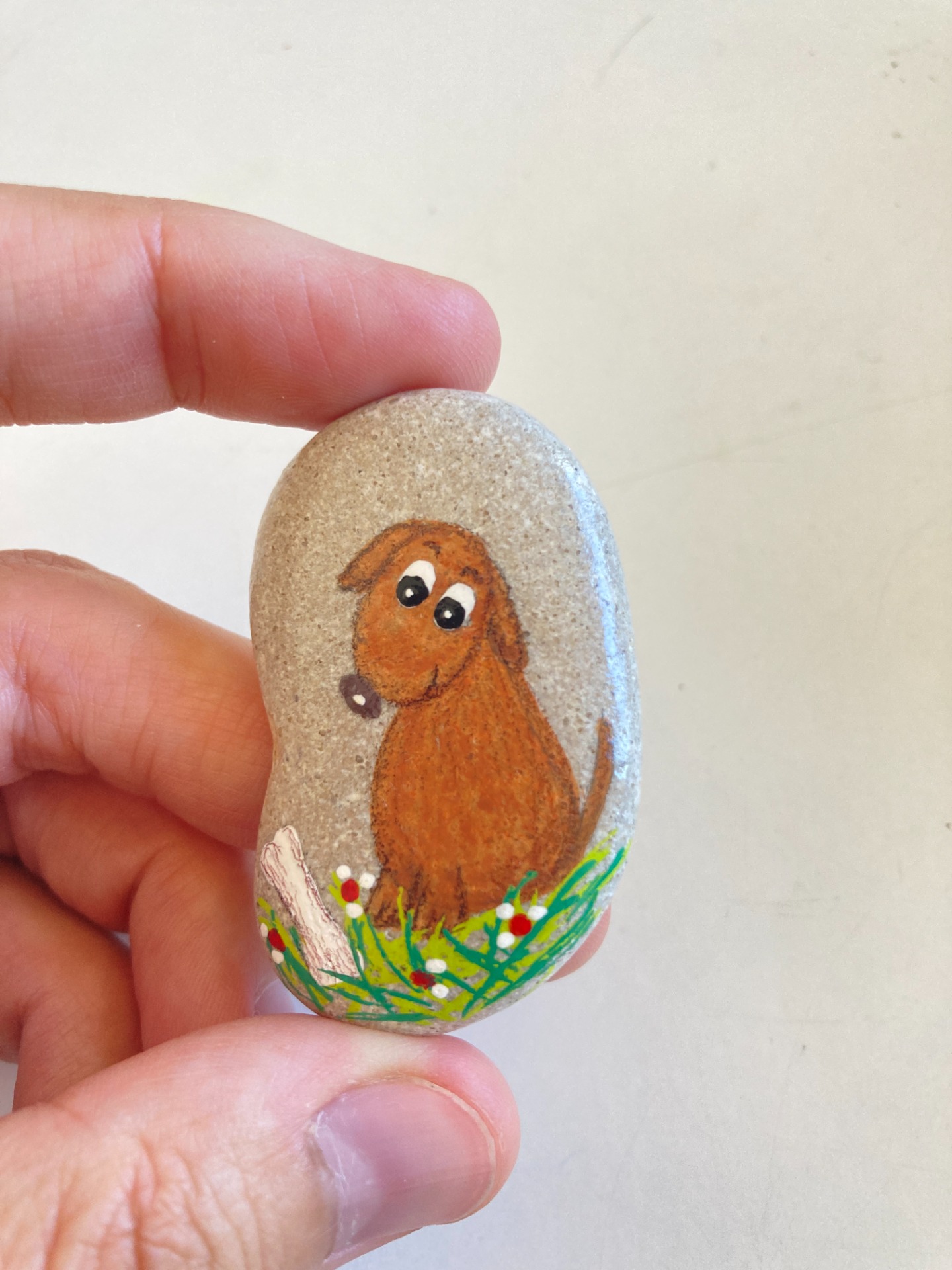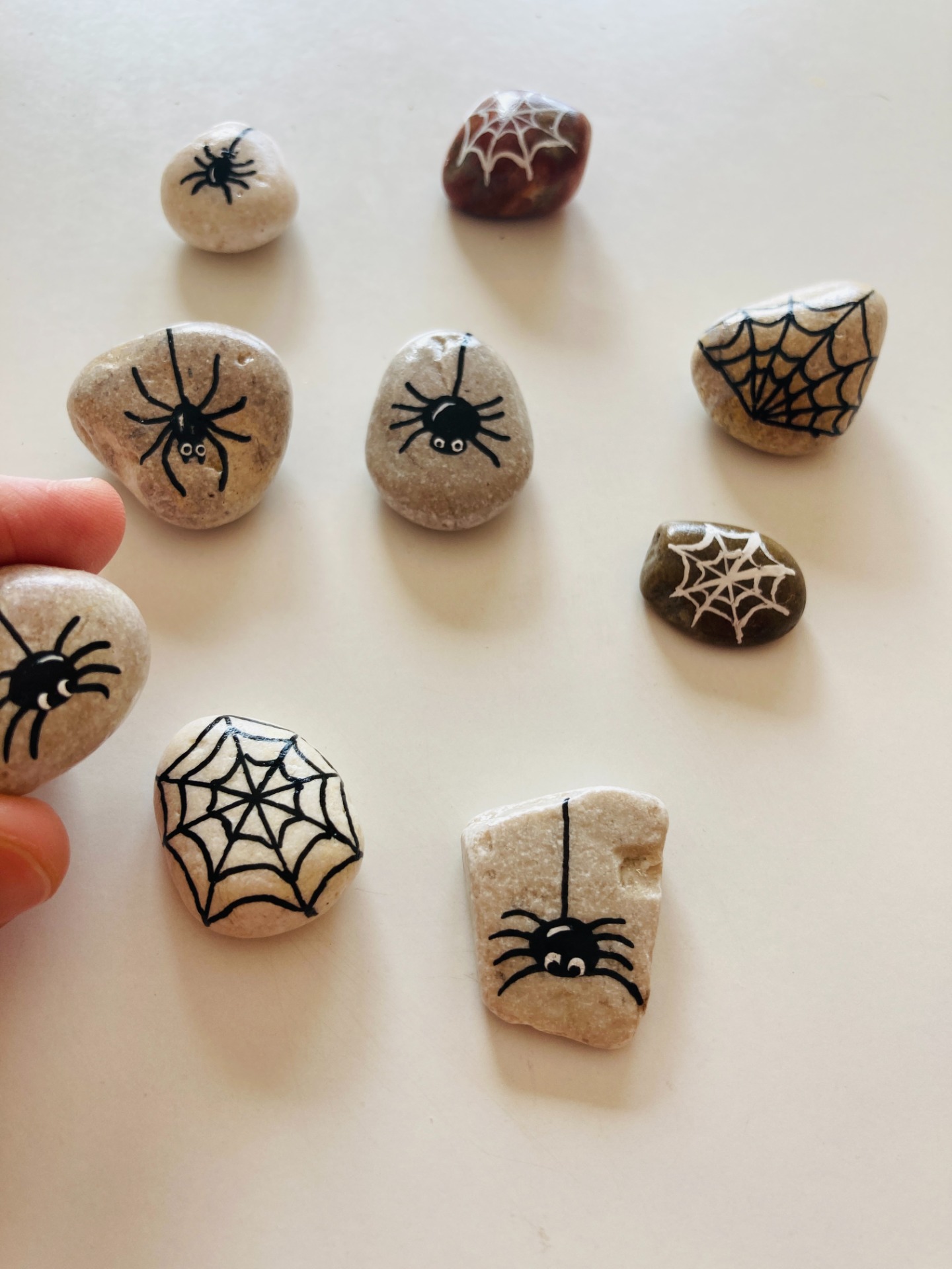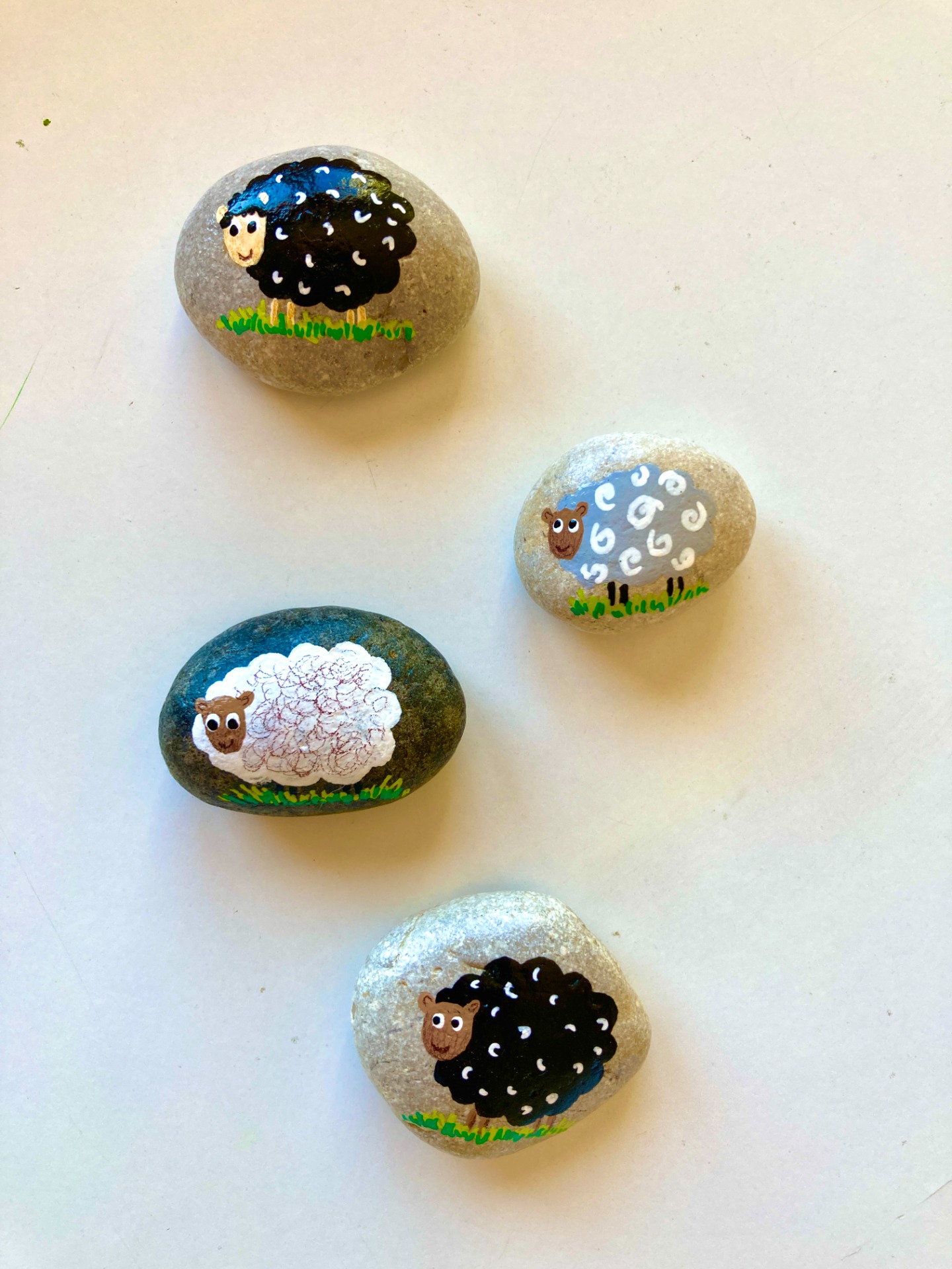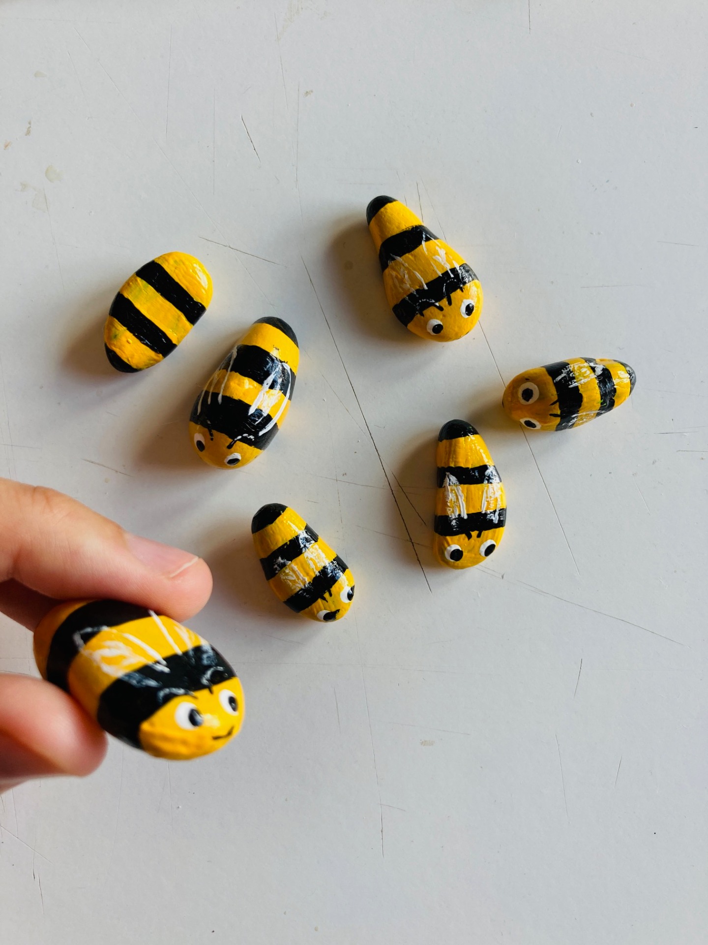 Pedras pintadas à mão com tinta acrílica. O tamanho das pedras varia entre 1 cm e 3 cm de comprimento. Podem ser utilizadas como extra para o jogo Era uma Vez.