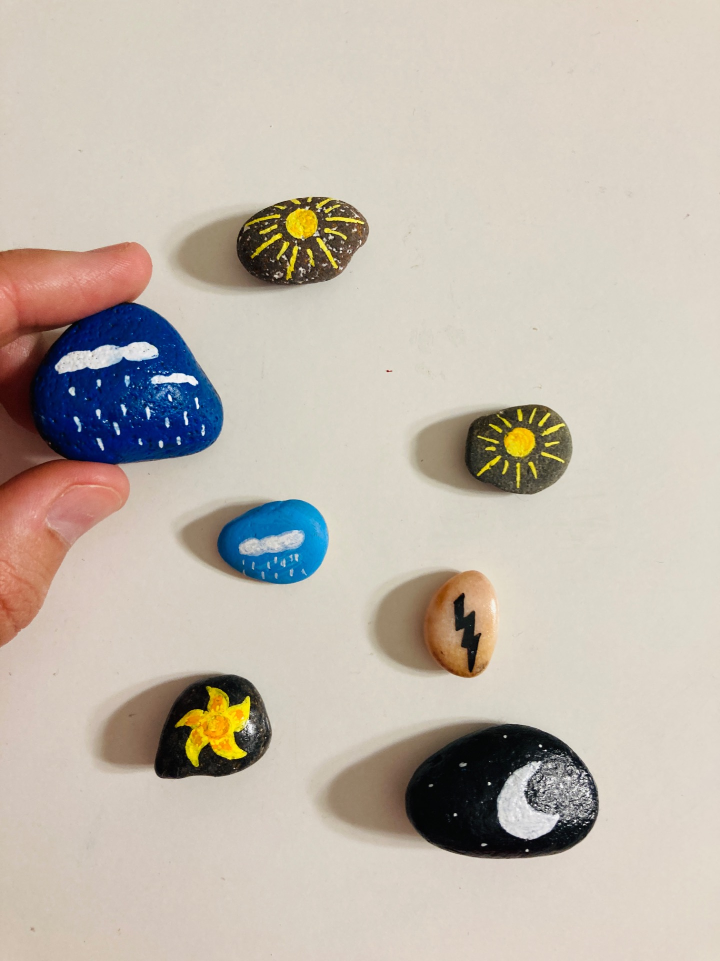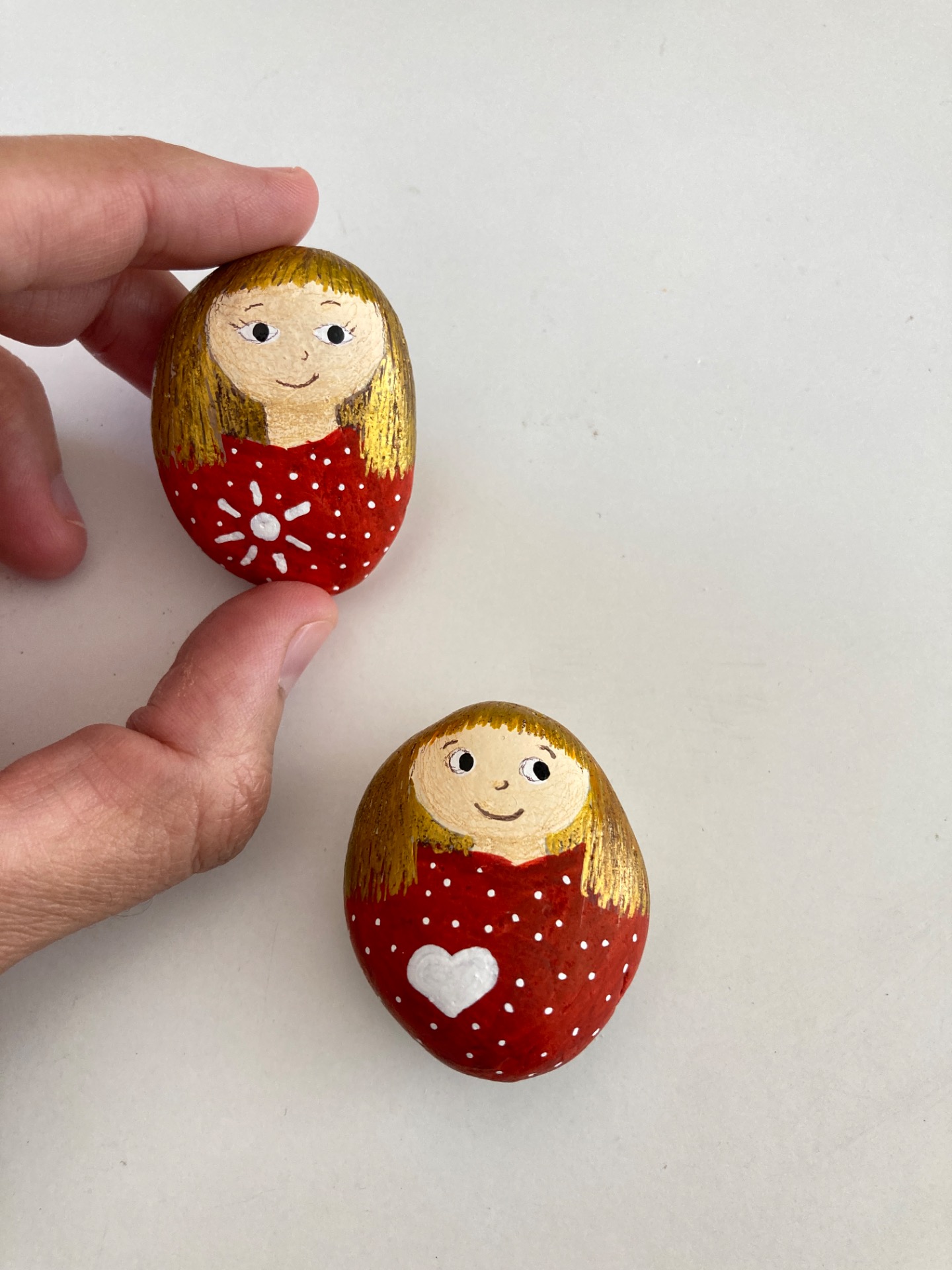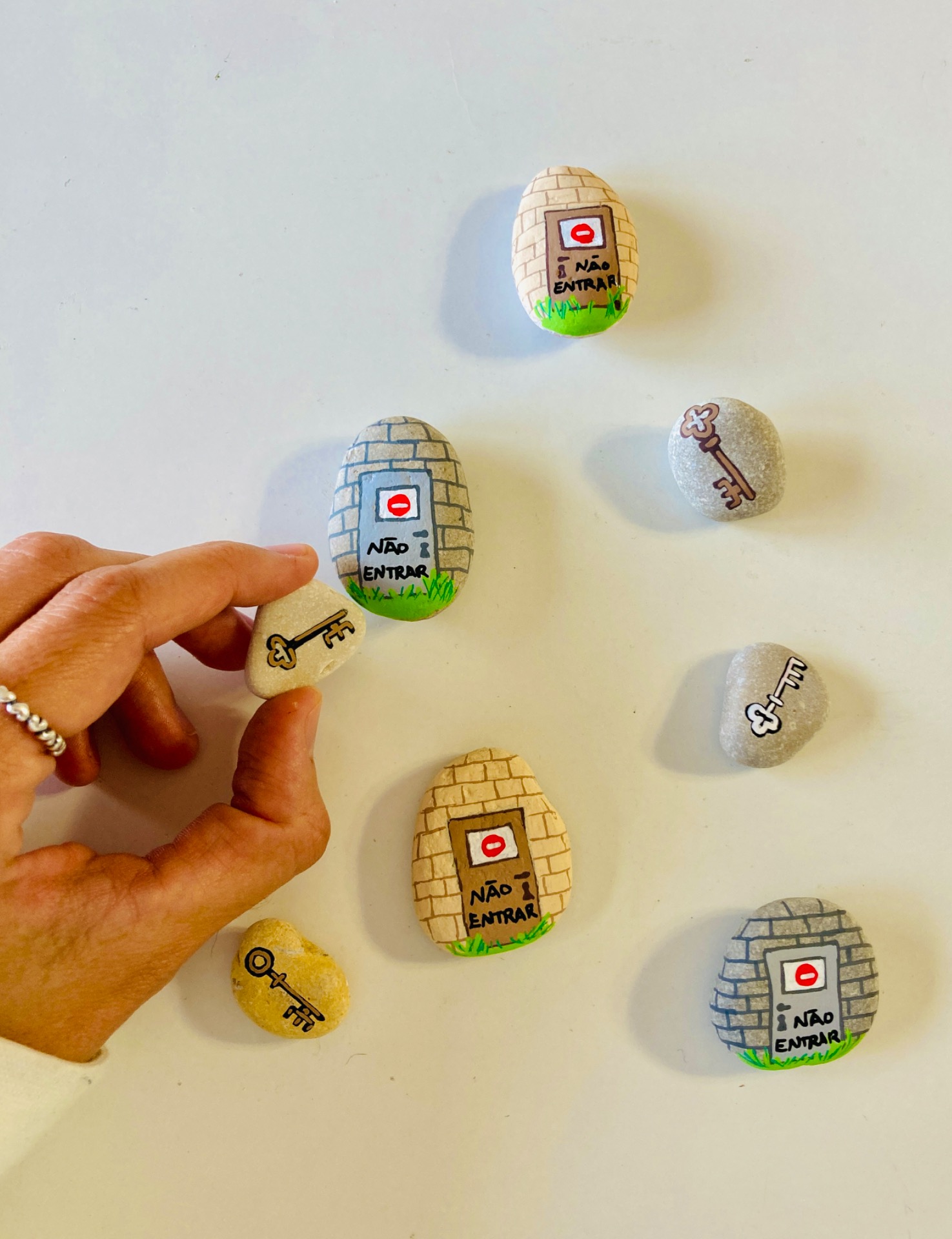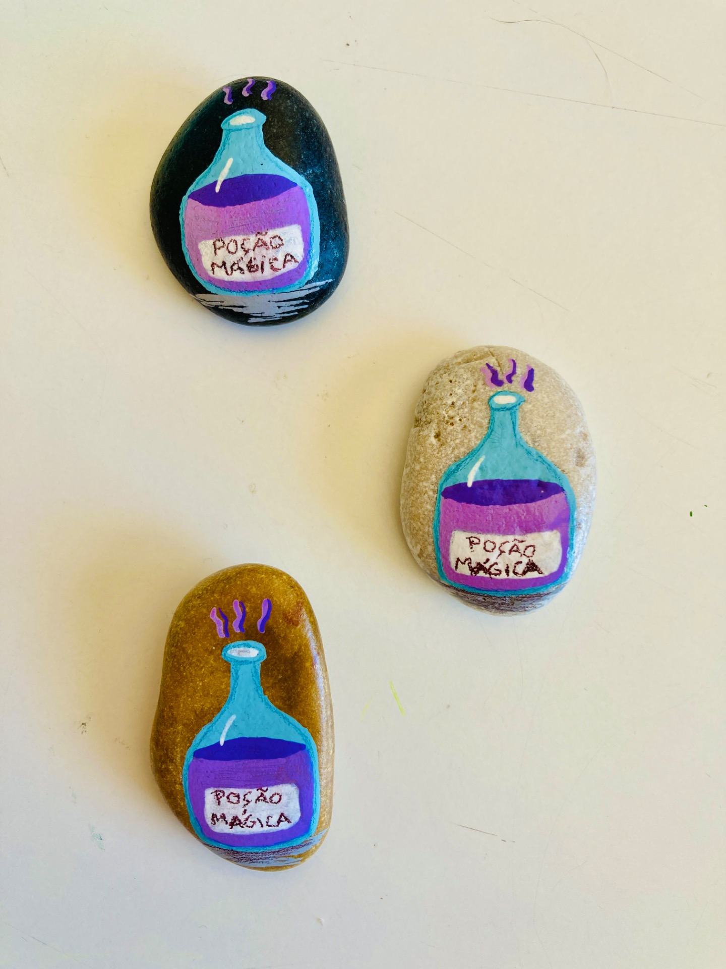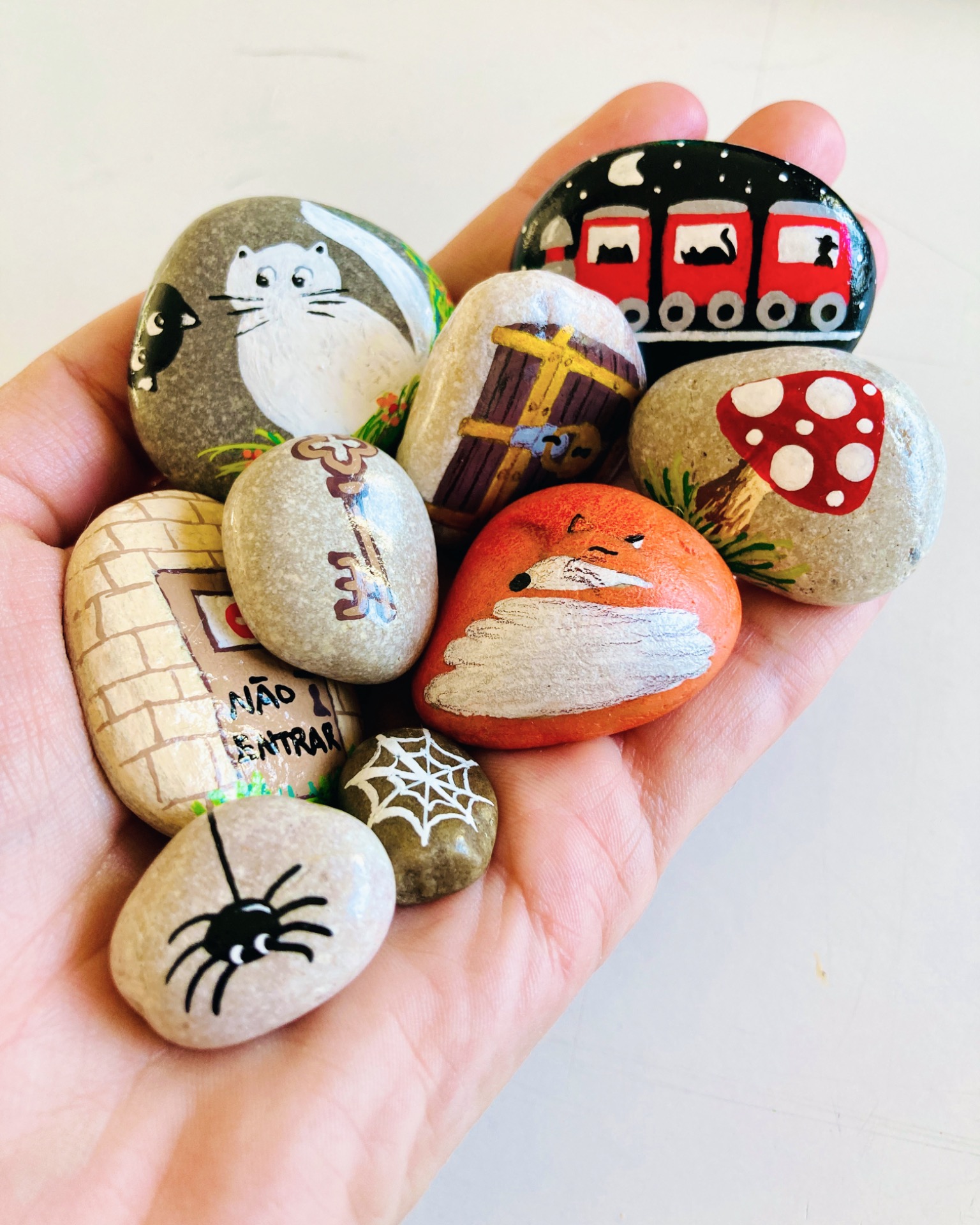 Pedras pintadas à mão com tinta acrílica, envernizadas. O tamanho das pedras varia entre 1 cm e 3 cm de comprimento. Podem ser utilizadas como extra para o jogo Era uma Vez.