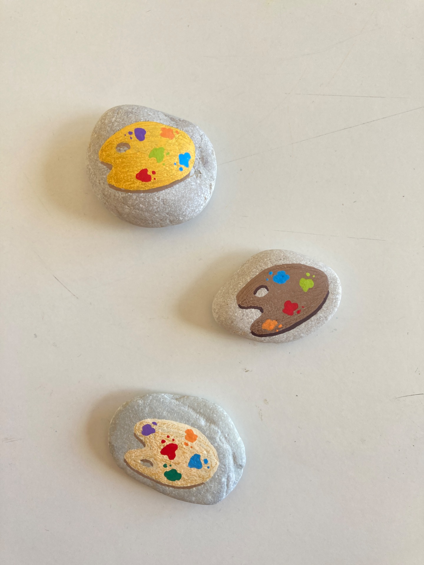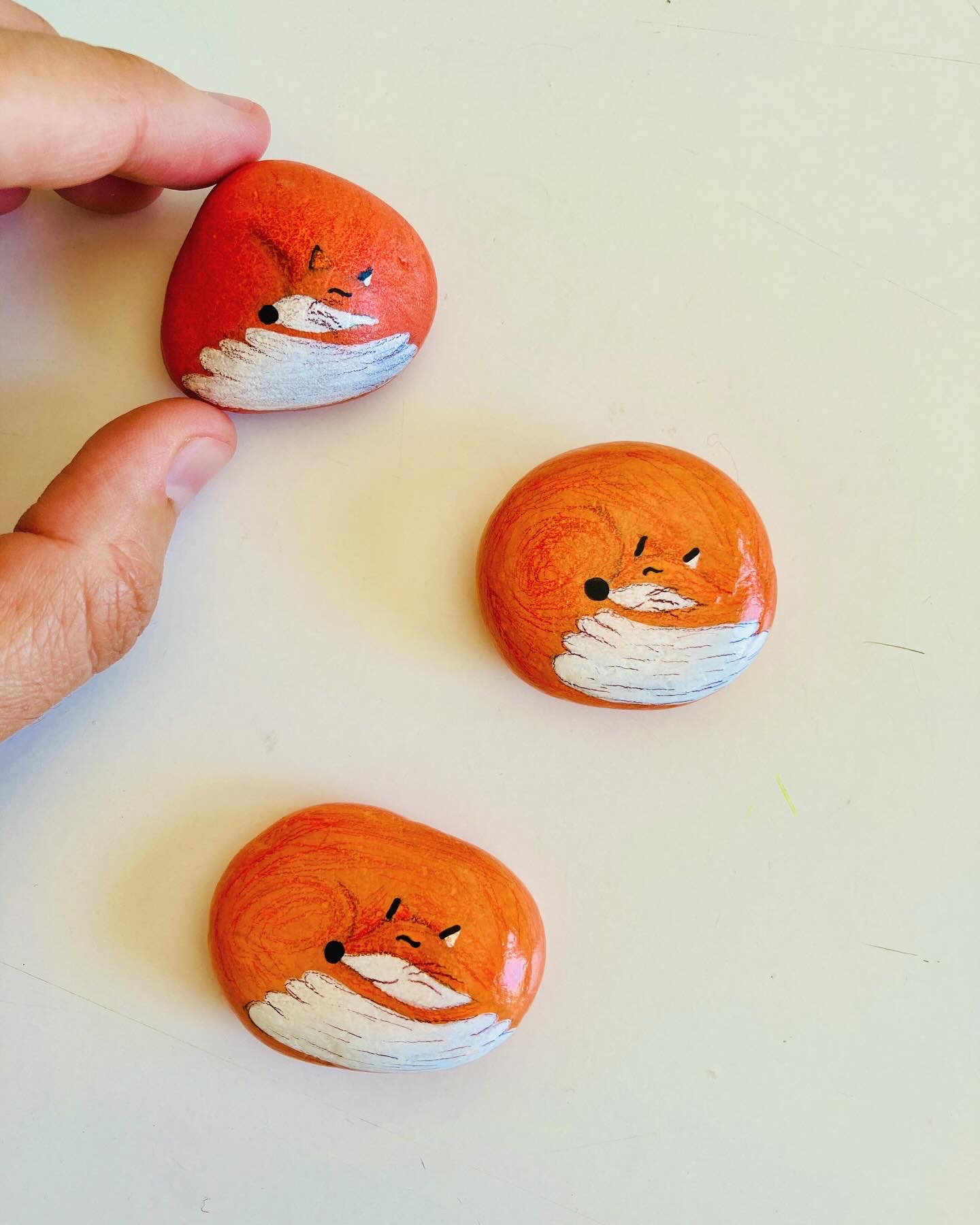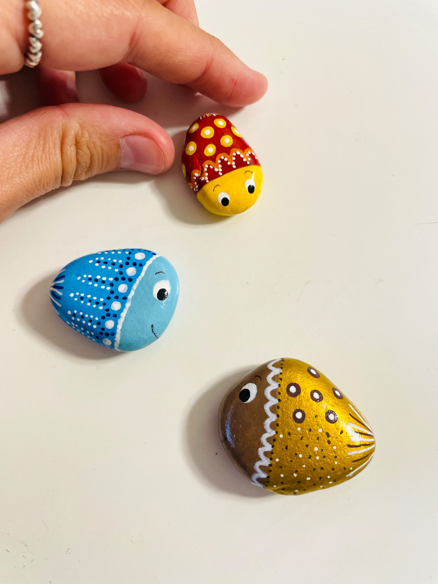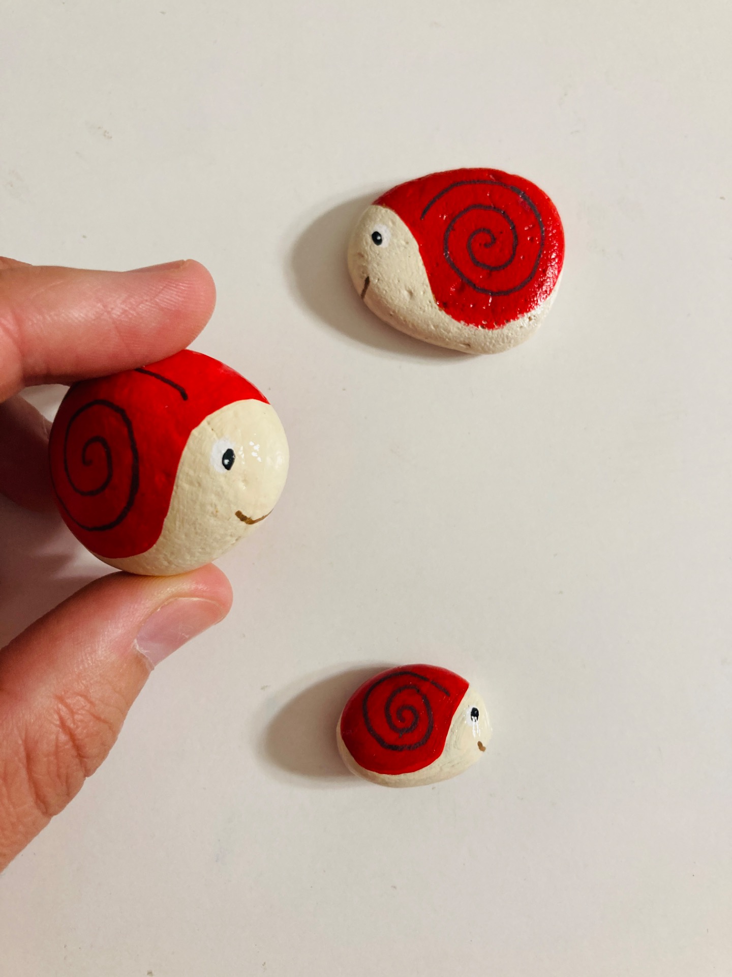 Pedras pintadas à mão com tinta acrílica, envernizadas. O tamanho das pedras varia entre 1 cm e 3 cm de comprimento. Podem ser utilizadas como extra para o jogo Era uma Vez.