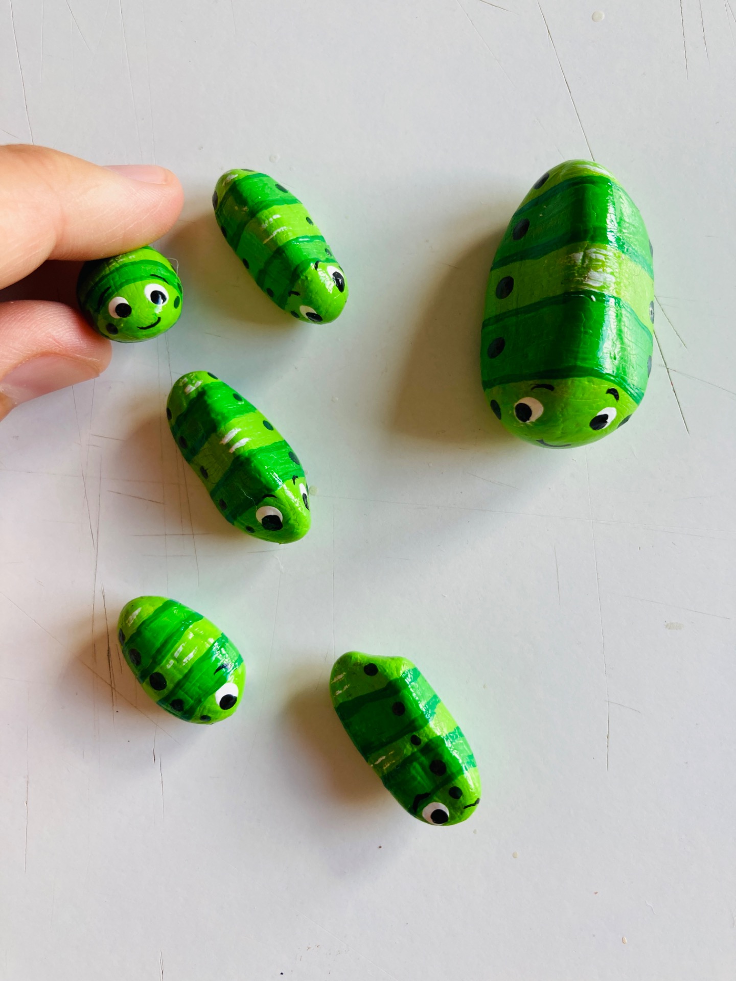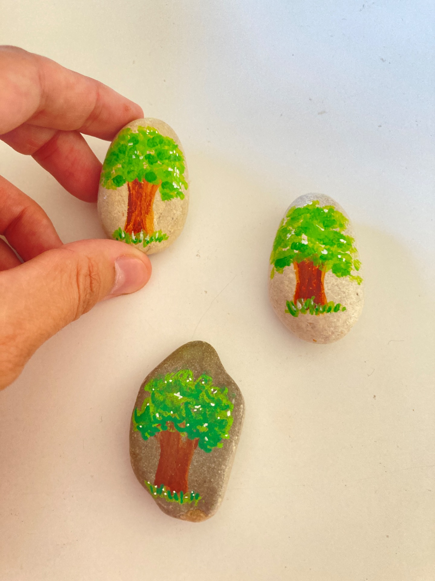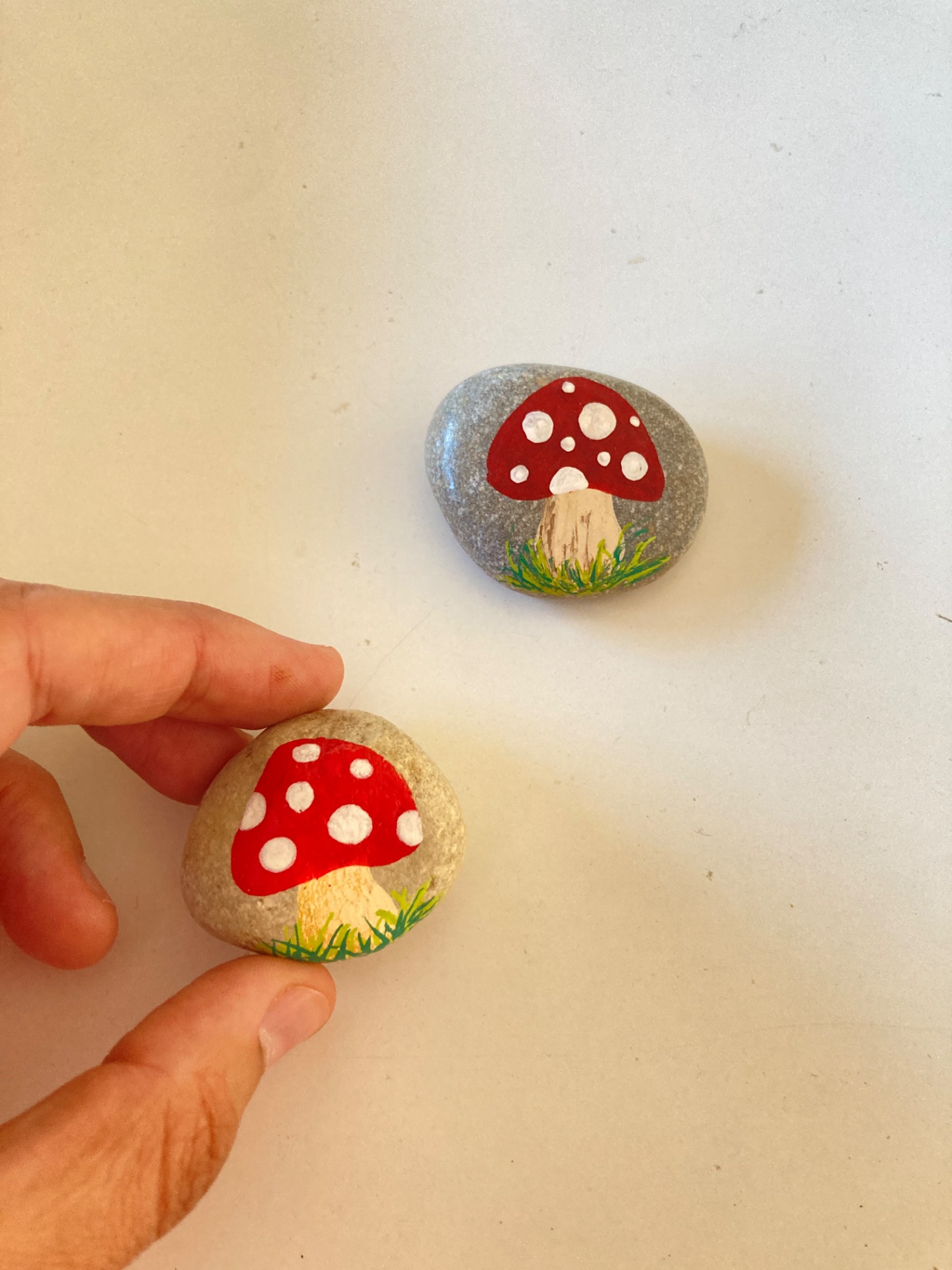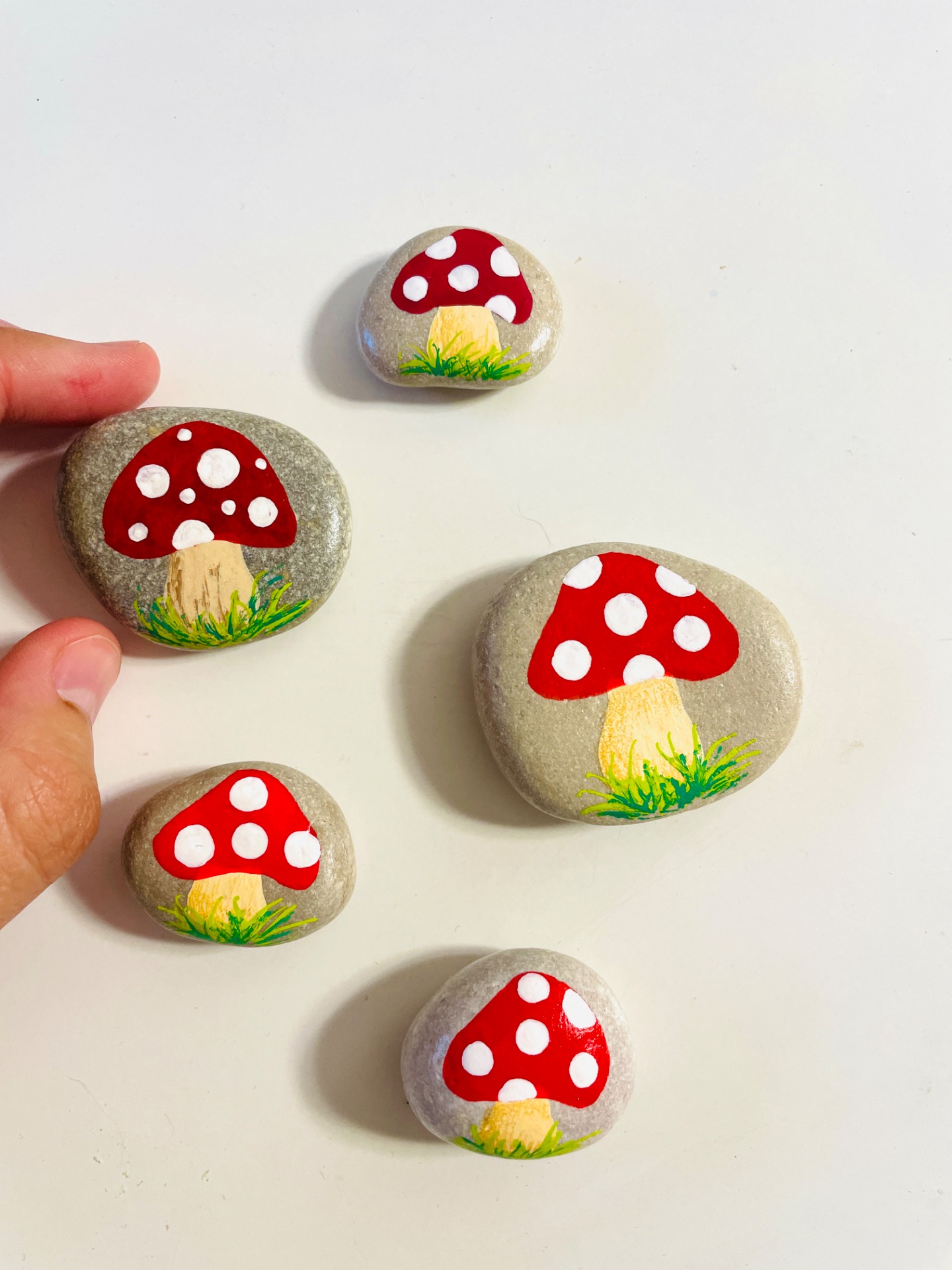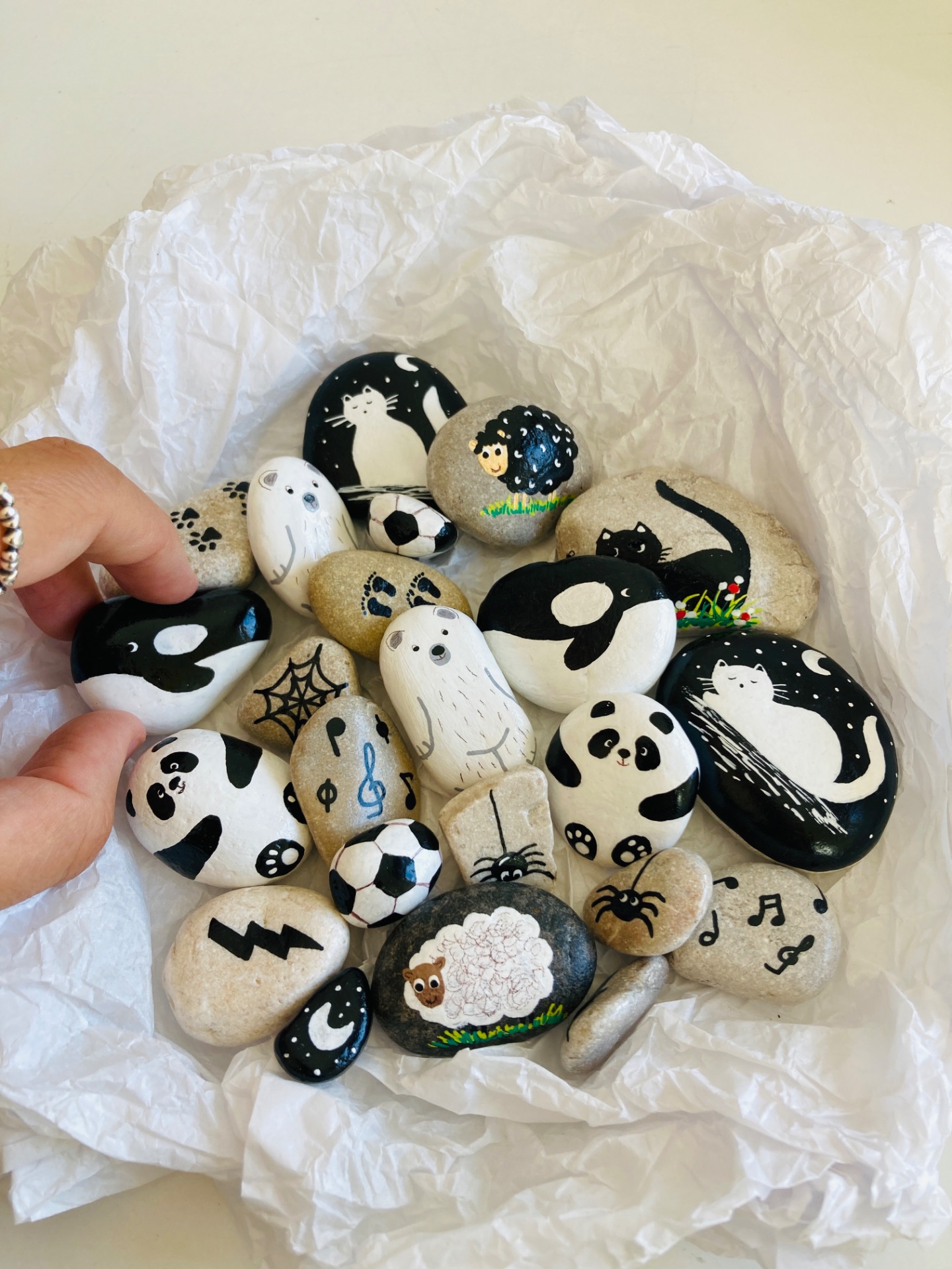 Pedras pintadas à mão com tinta acrílica, envernizadas. O tamanho das pedras varia entre 1 cm e 3 cm de comprimento. Podem ser utilizadas como extra para o jogo Era uma Vez.
