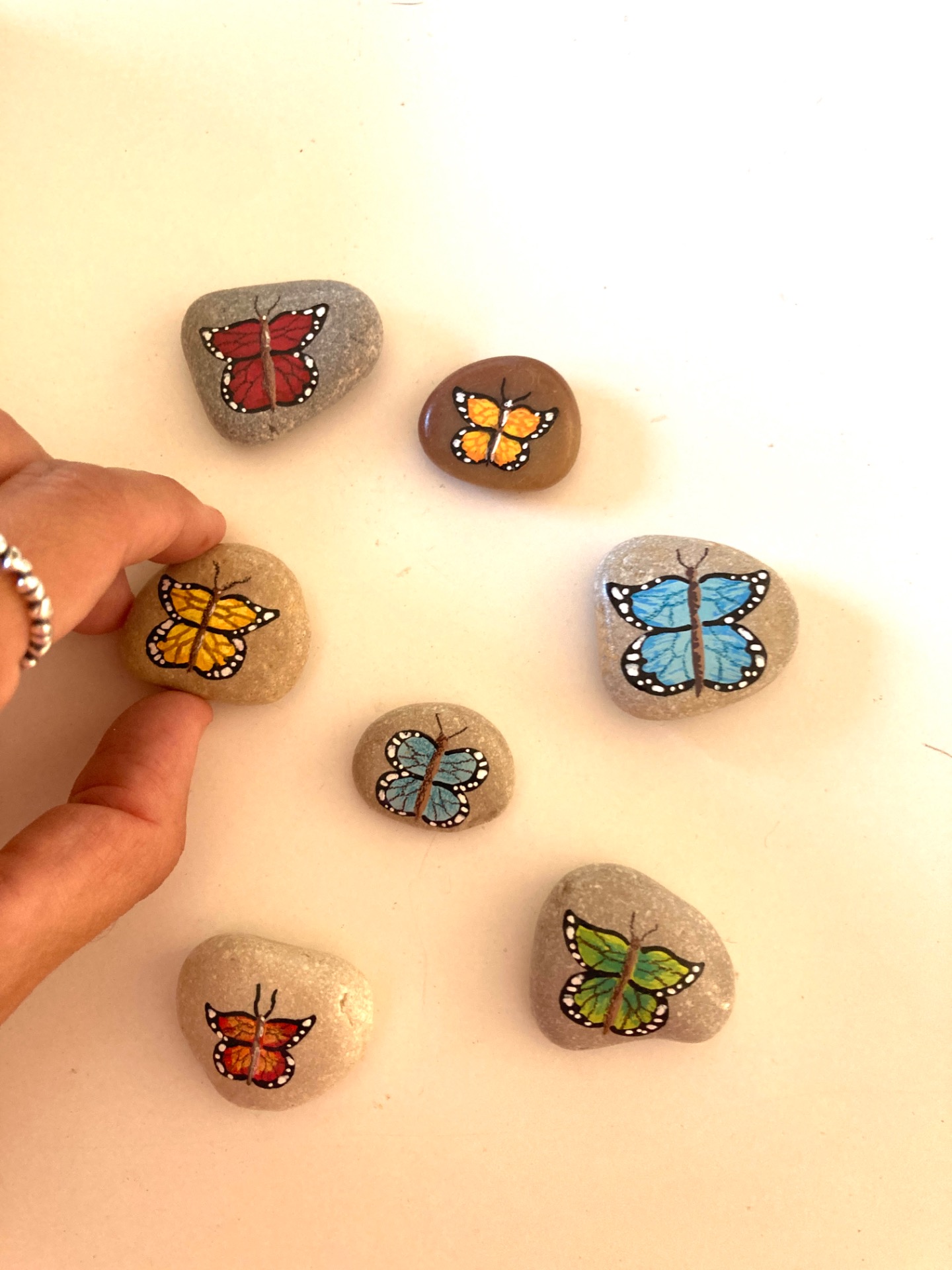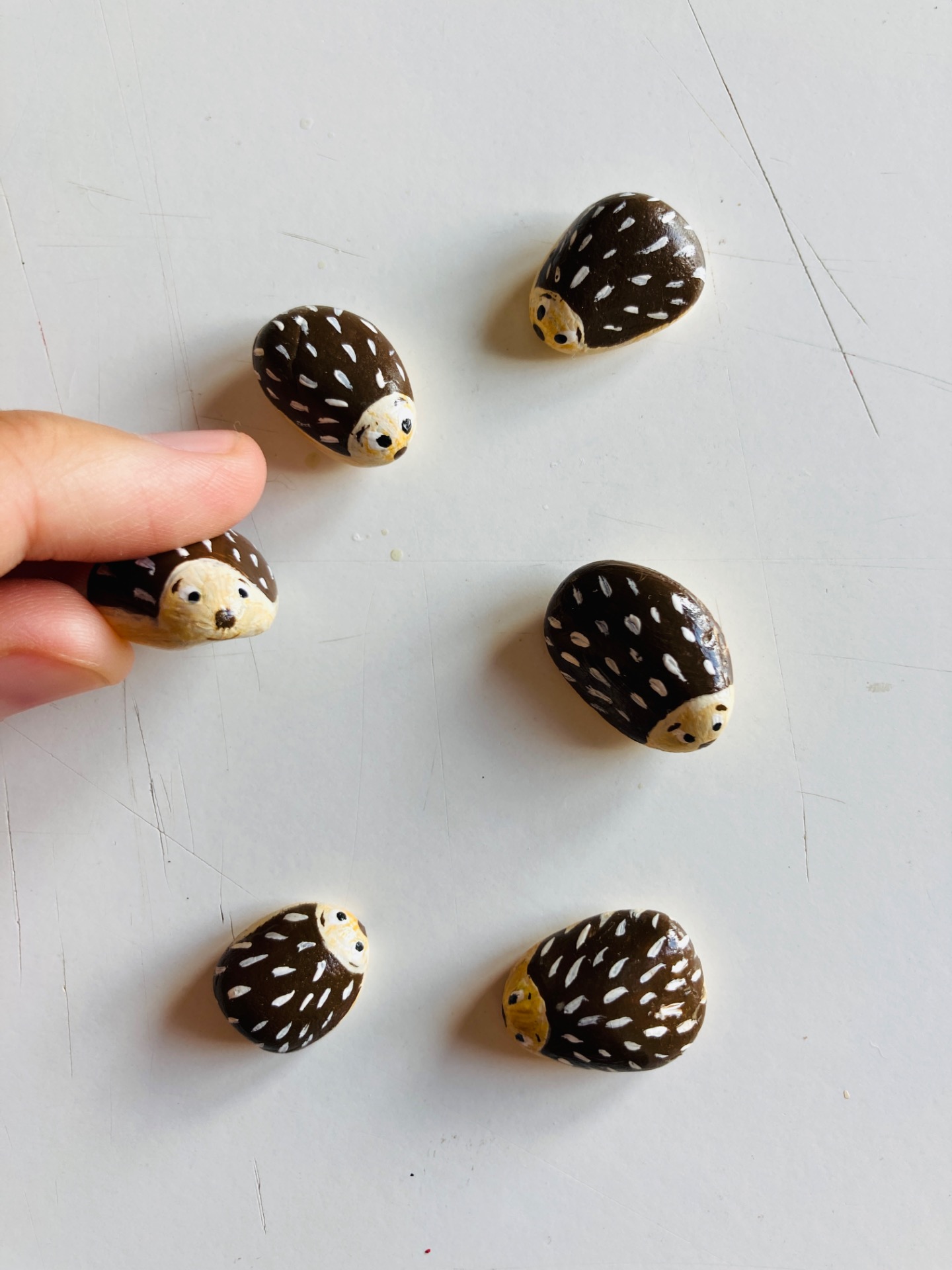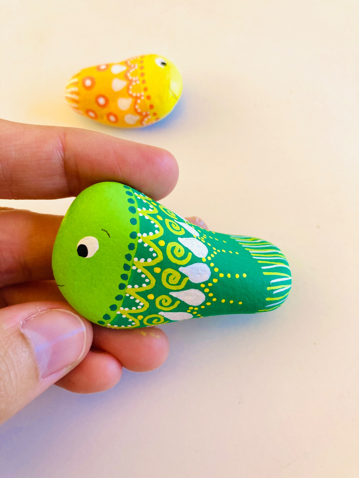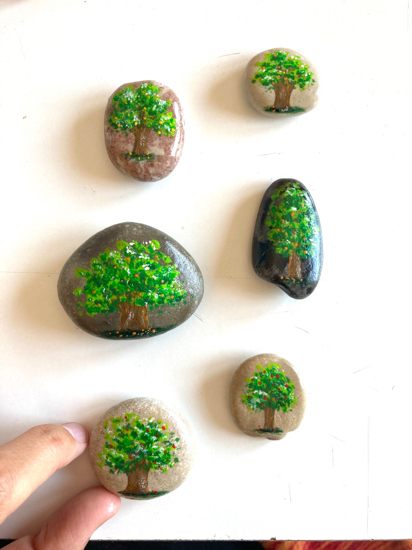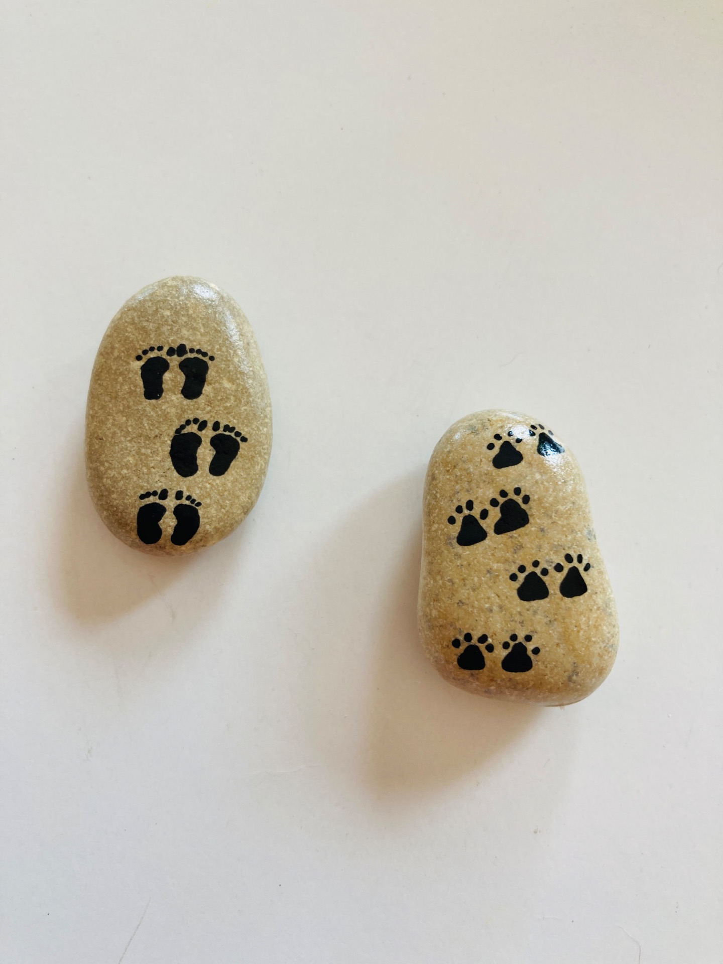 Pedras pintadas à mão com tinta acrílica, envernizadas. O tamanho das pedras varia entre 1 cm e 3 cm de comprimento. Podem ser utilizadas como extra para o jogo Era uma Vez.