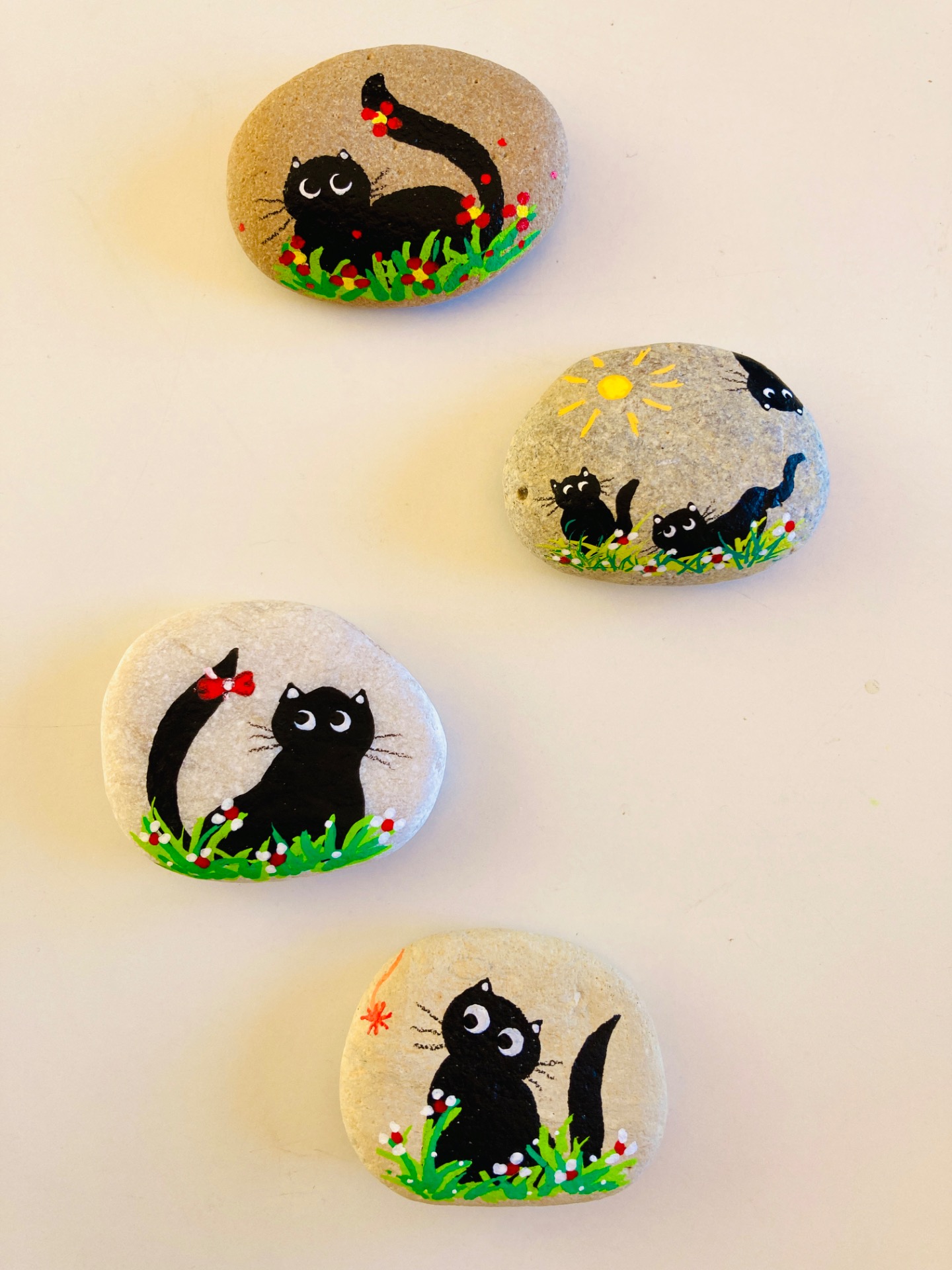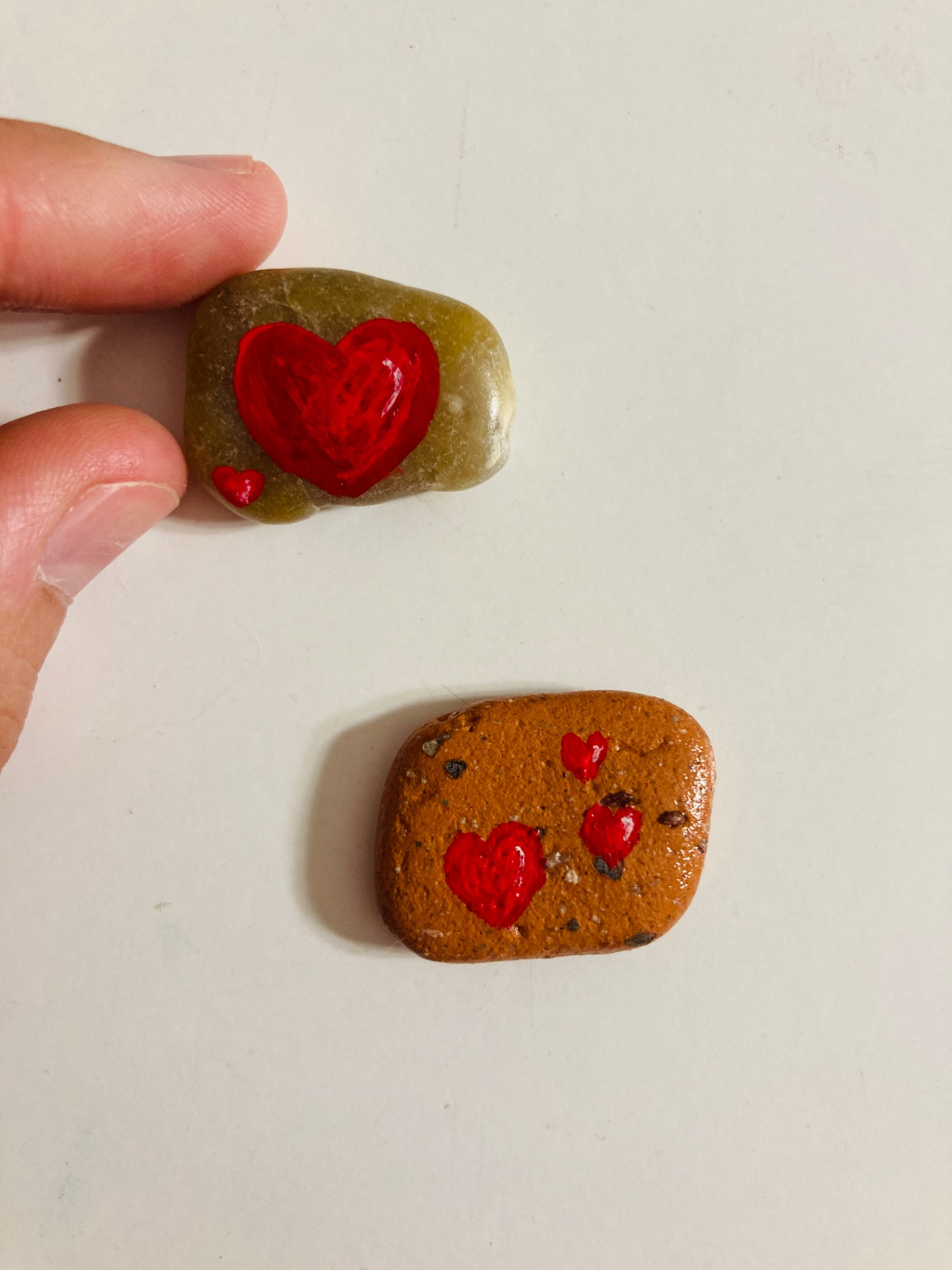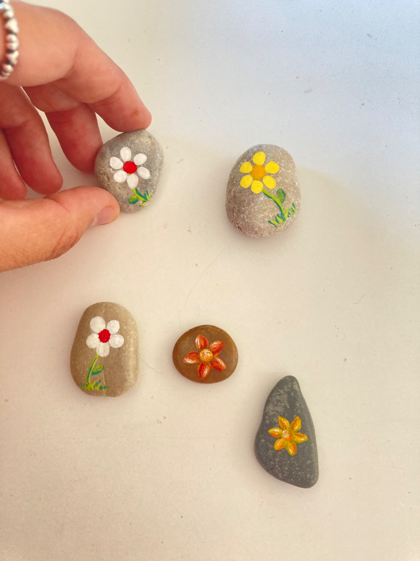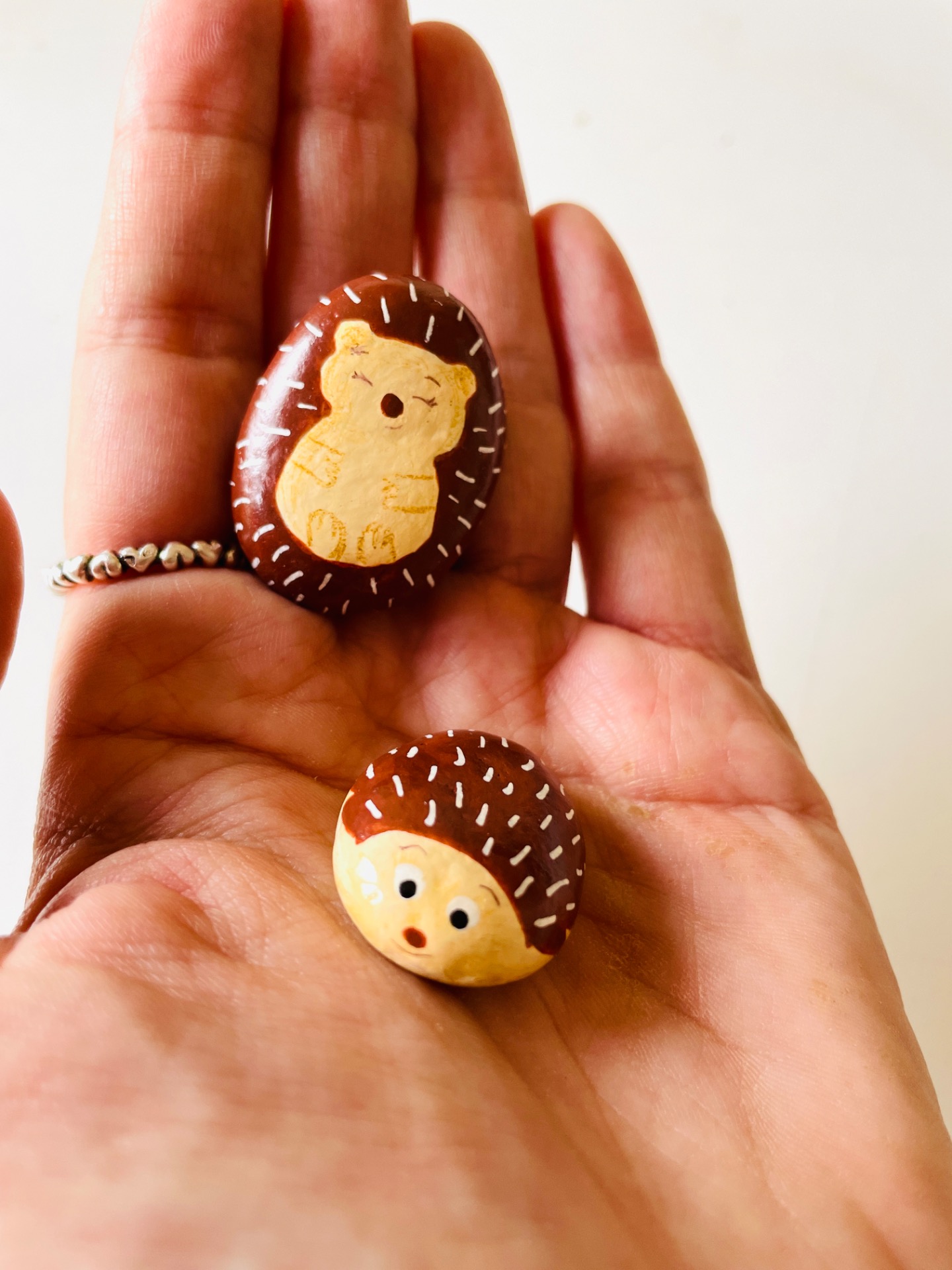 Pedras pintadas à mão com tinta acrílica, envernizadas. O tamanho das pedras varia entre 1 cm e 3 cm de comprimento. Podem ser utilizadas como extra para o jogo Era uma Vez.