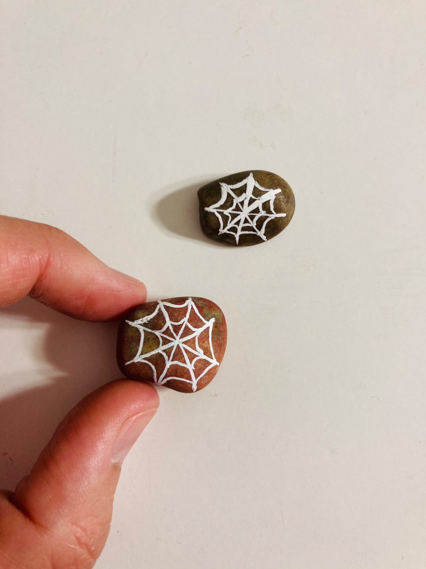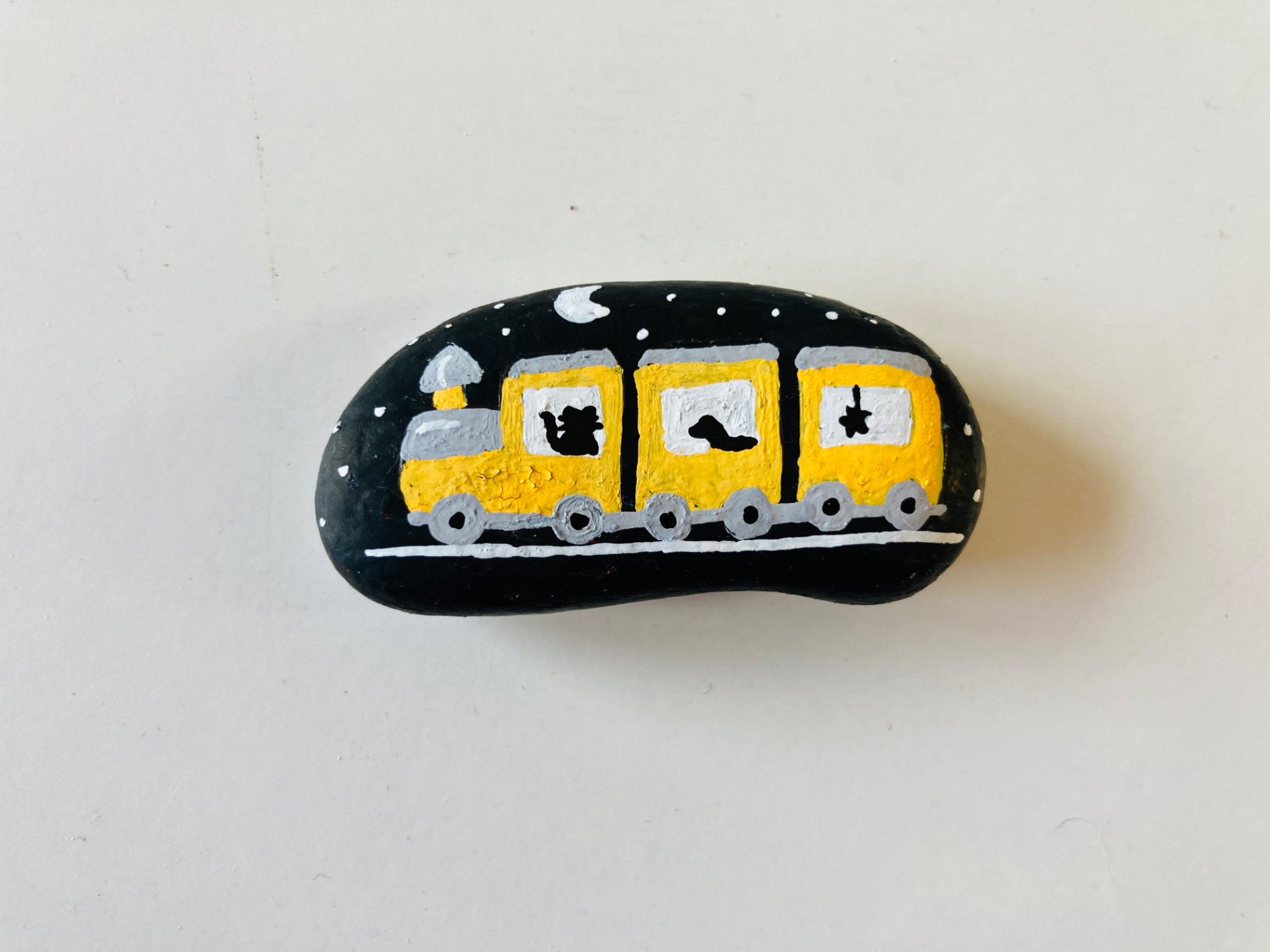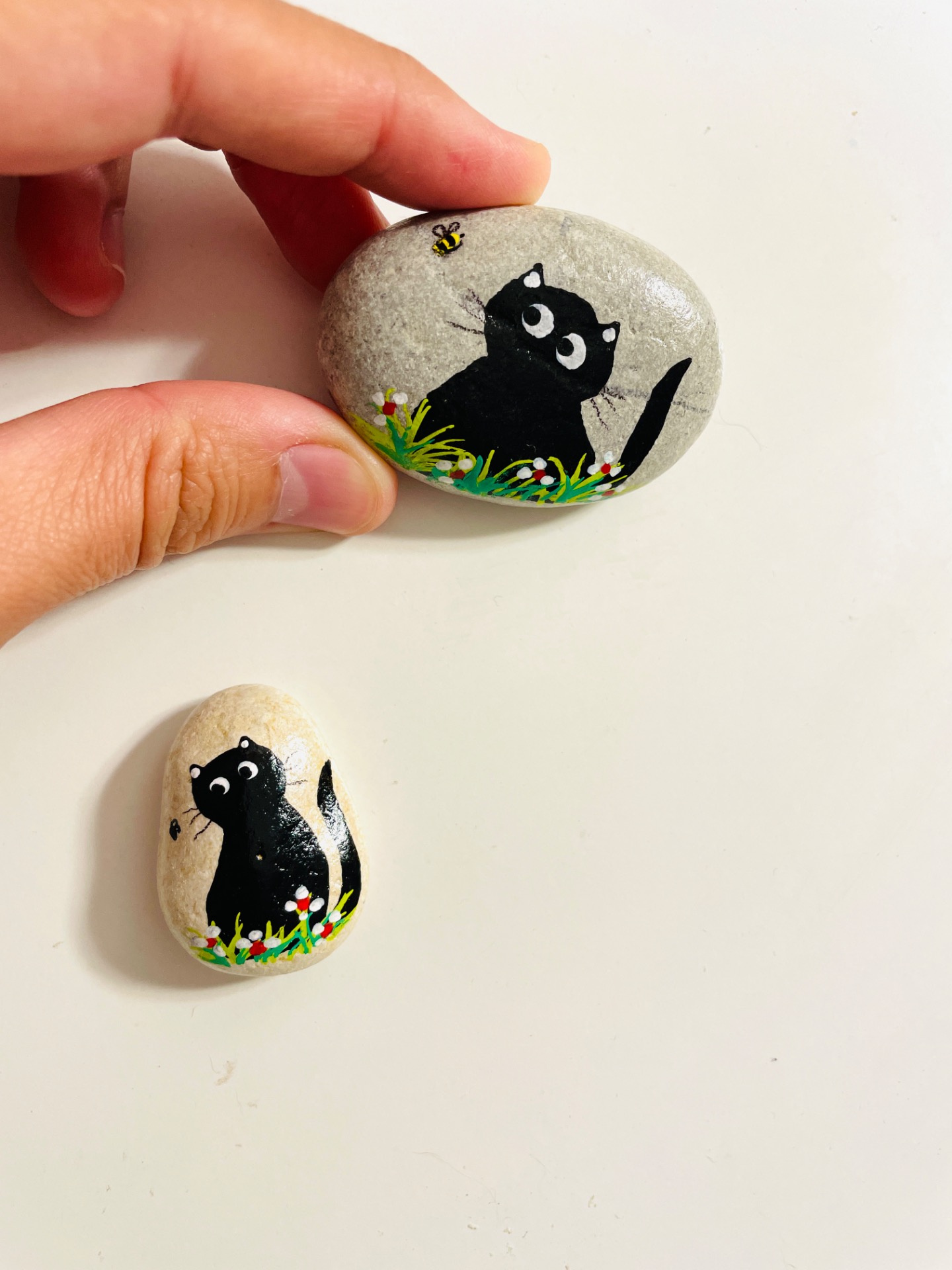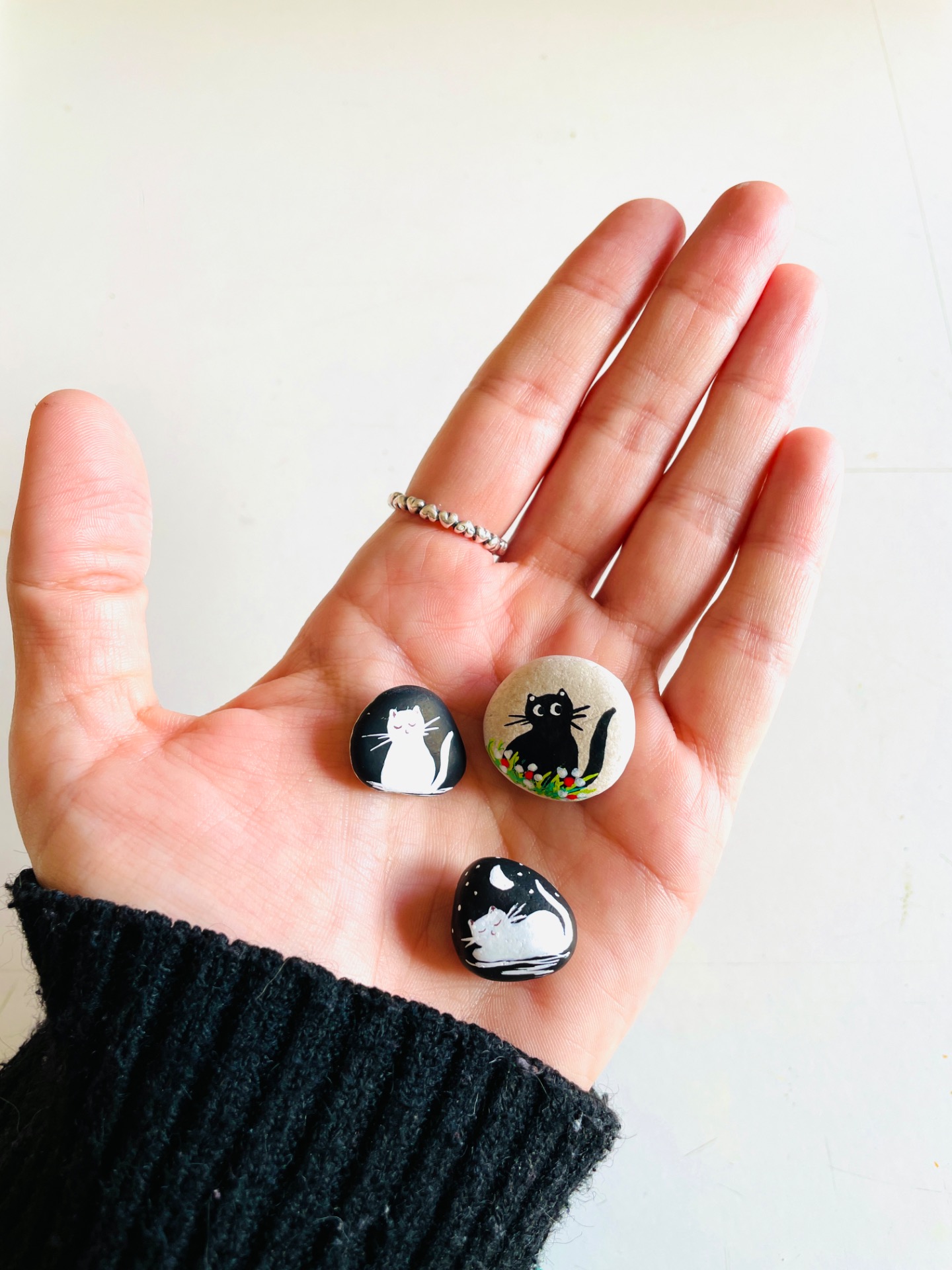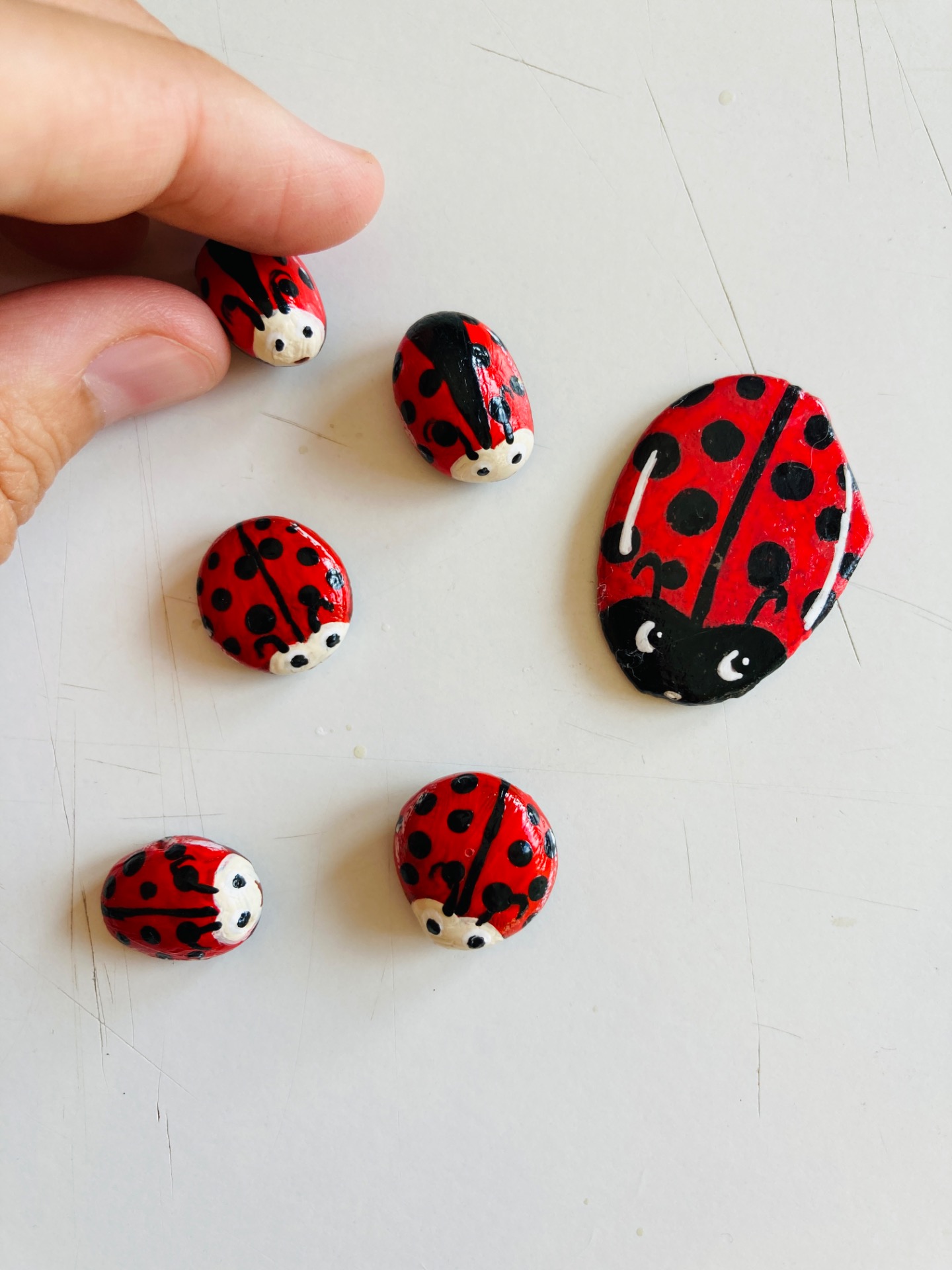 Pedras pintadas à mão com tinta acrílica, envernizadas. O tamanho das pedras varia entre 1 cm e 3 cm de comprimento. Podem ser utilizadas como extra para o jogo Era uma Vez.