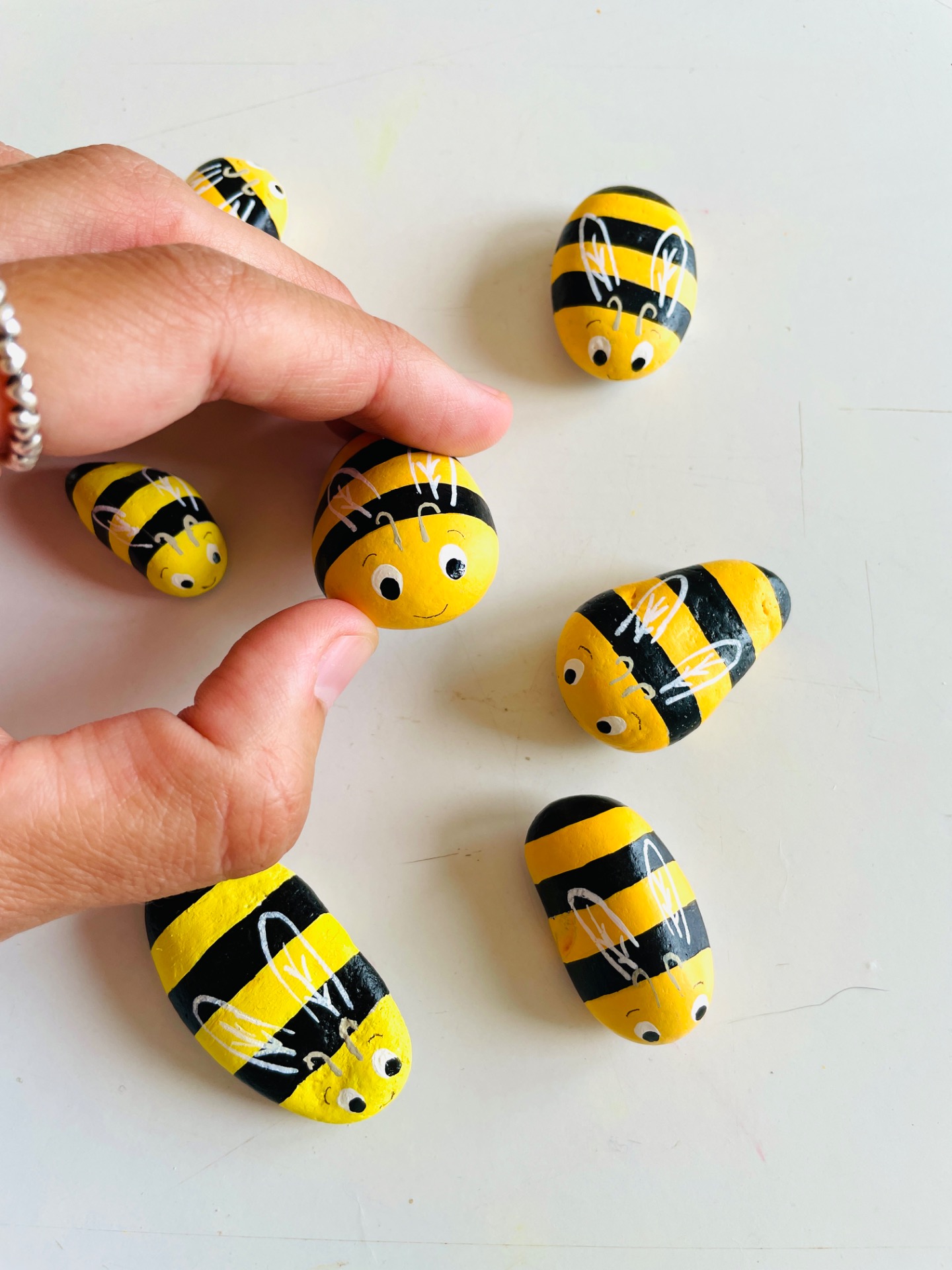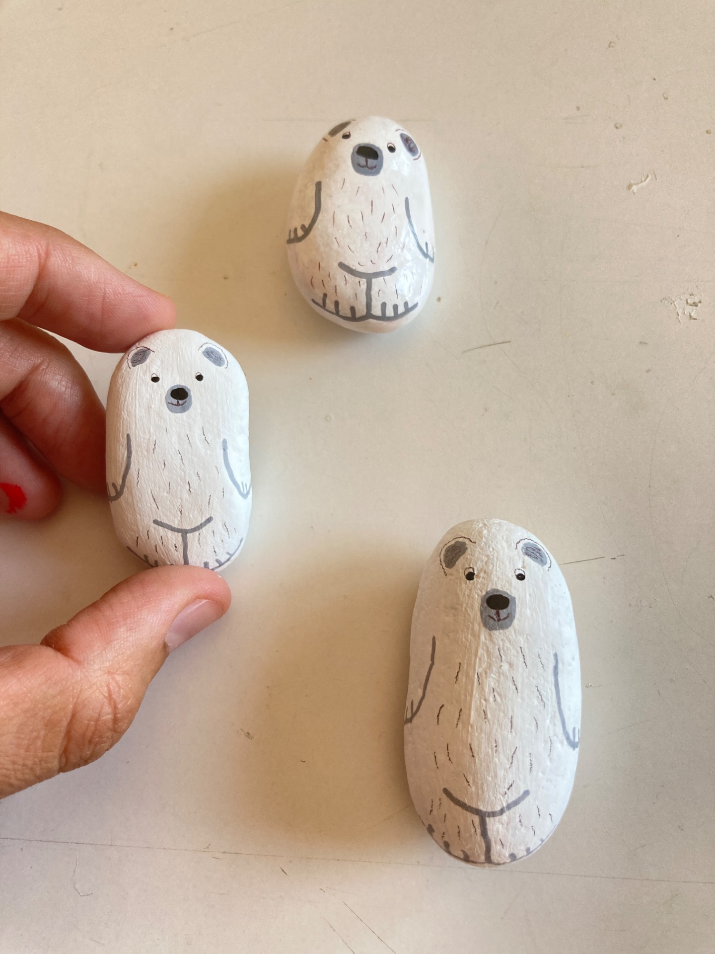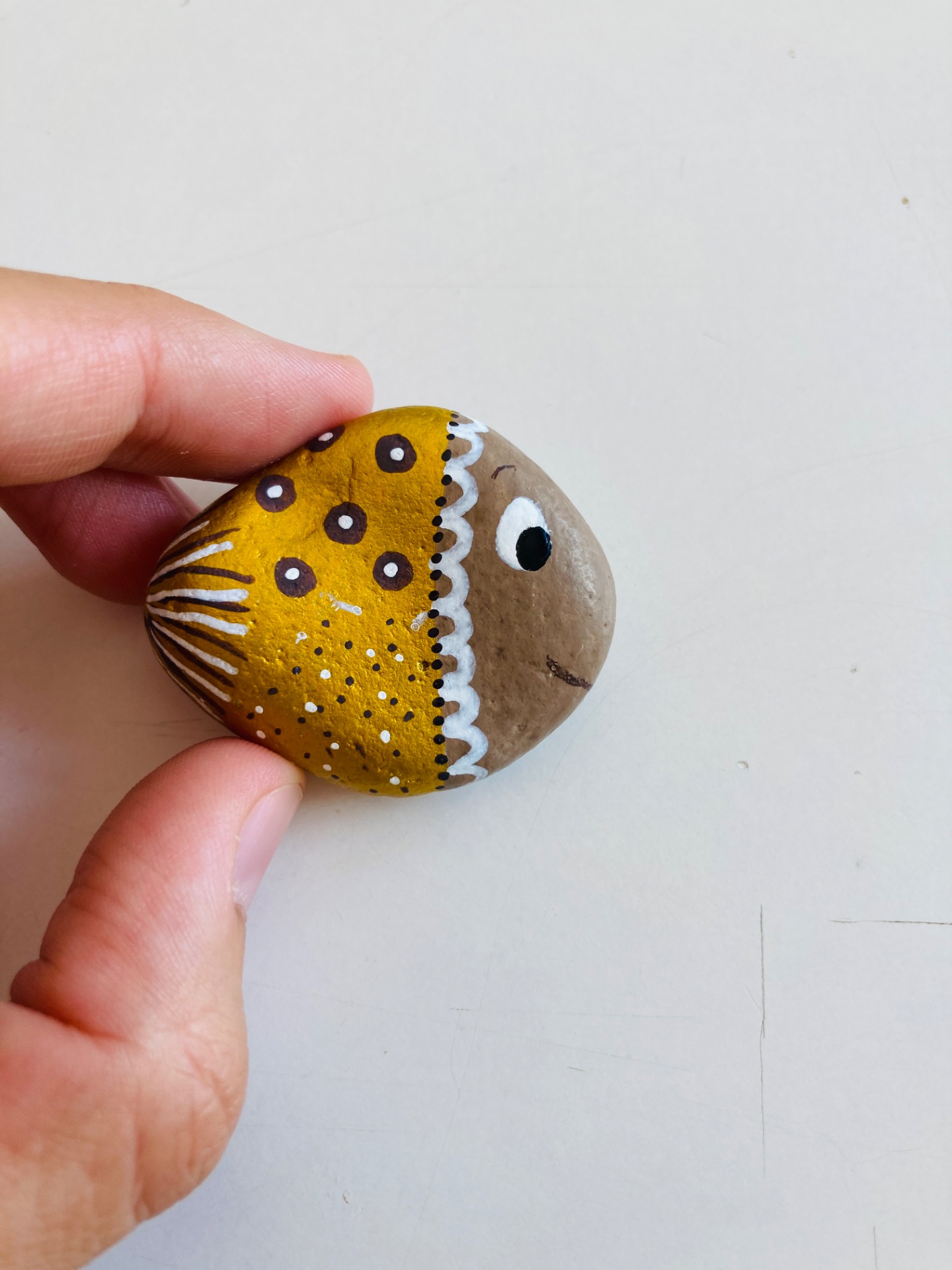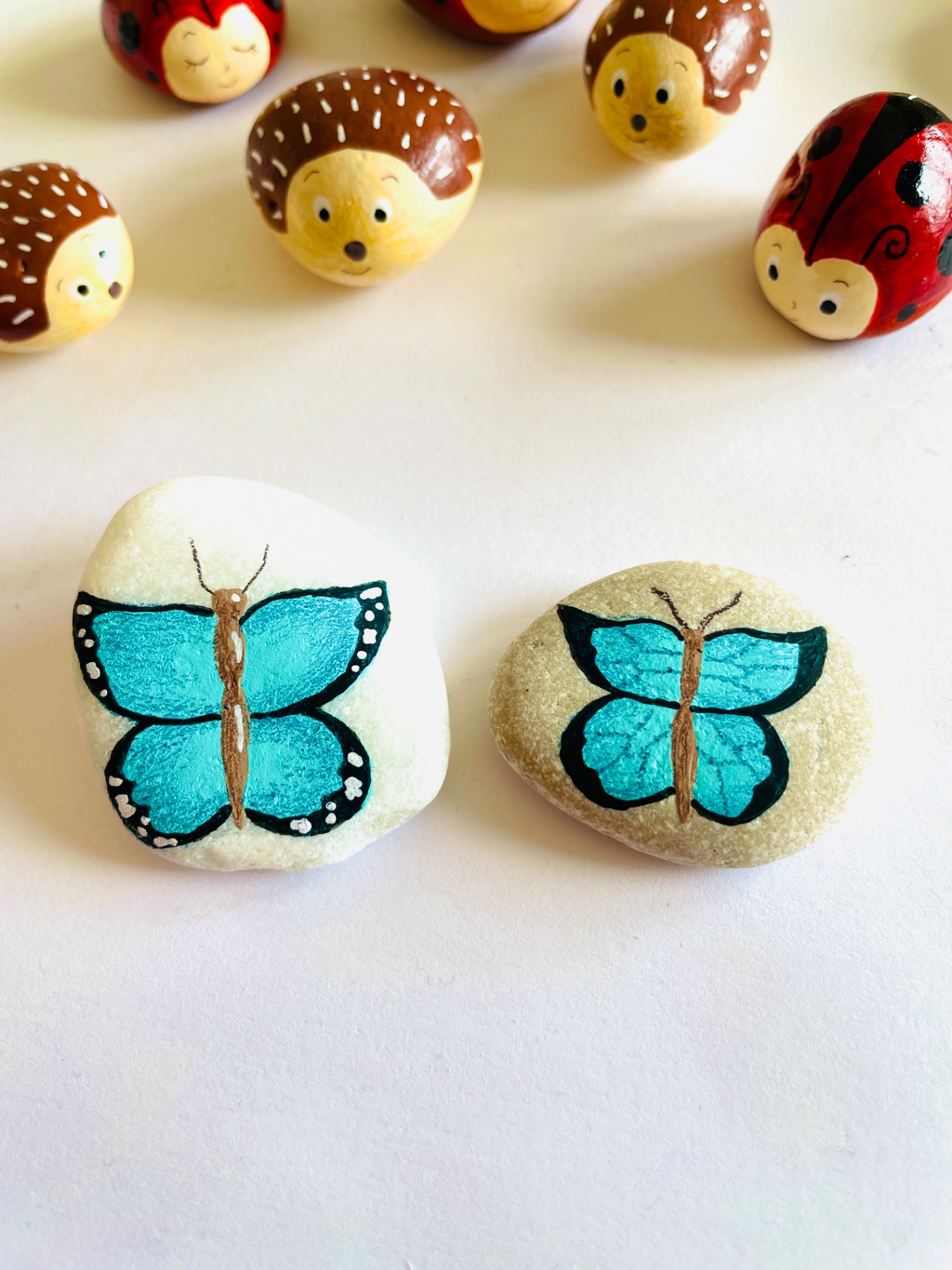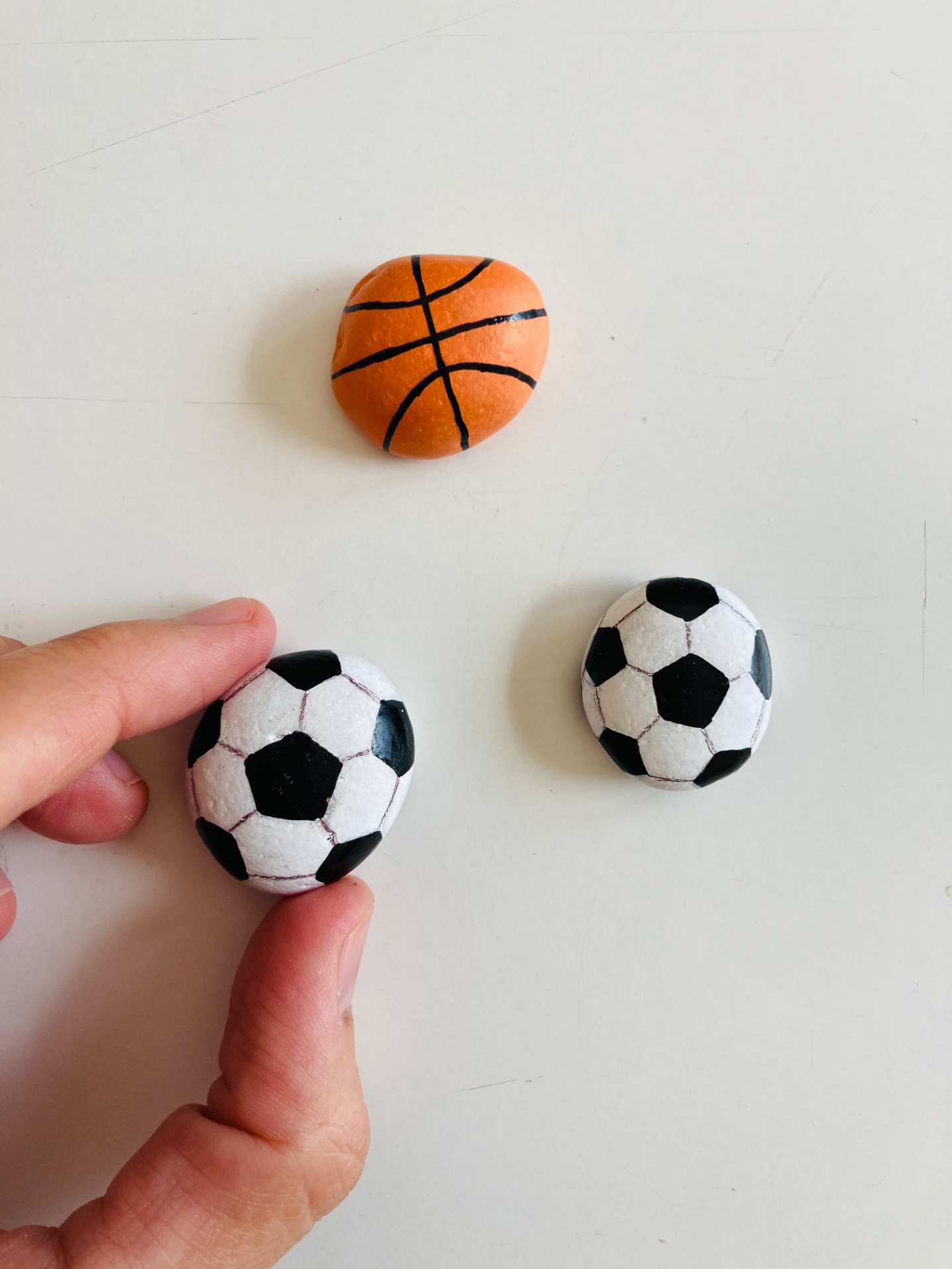 Pedras pintadas à mão com tinta acrílica, envernizadas. O tamanho das pedras varia entre 1 cm e 3 cm de comprimento. Podem ser utilizadas como extra para o jogo Era uma Vez.