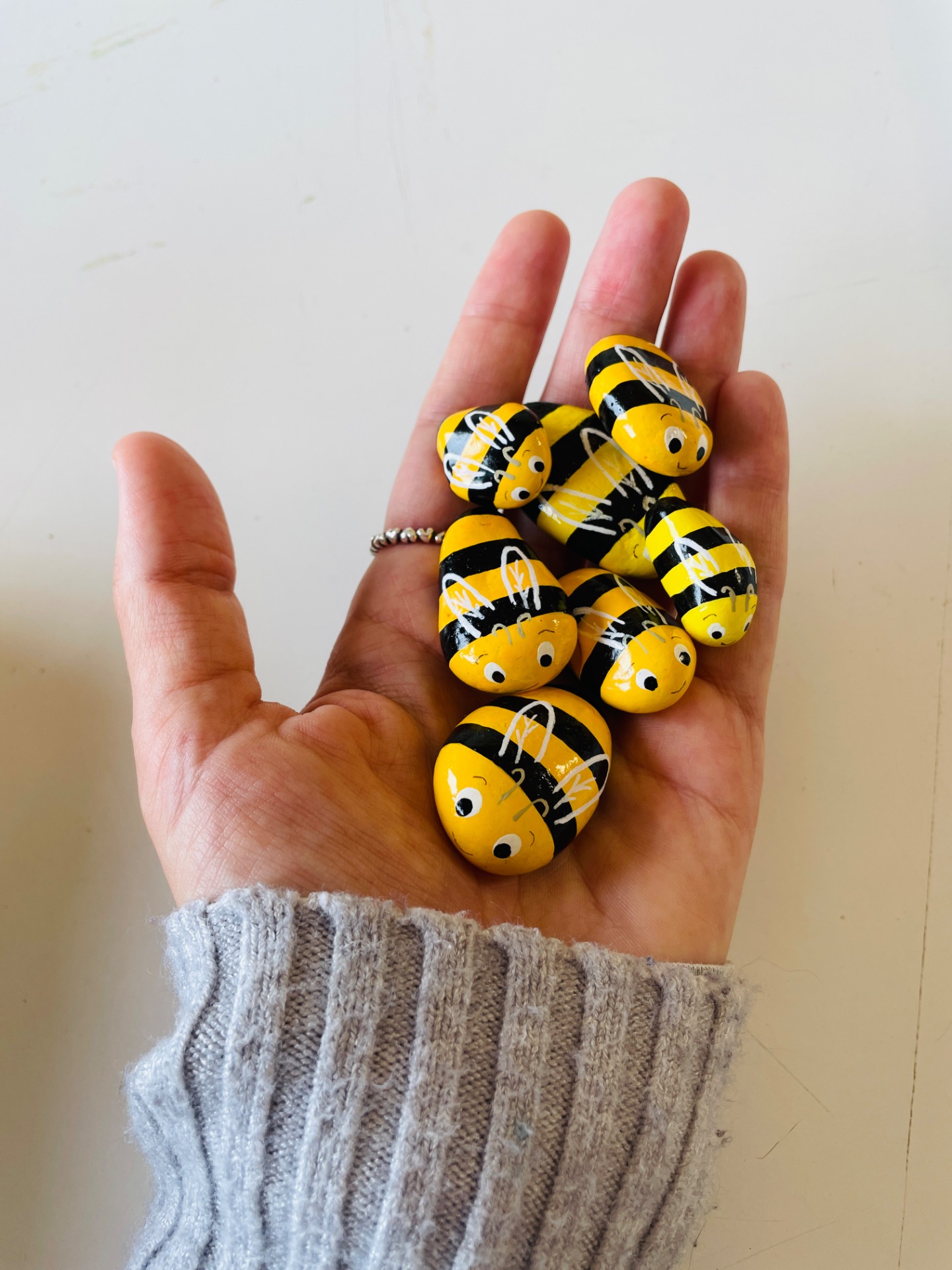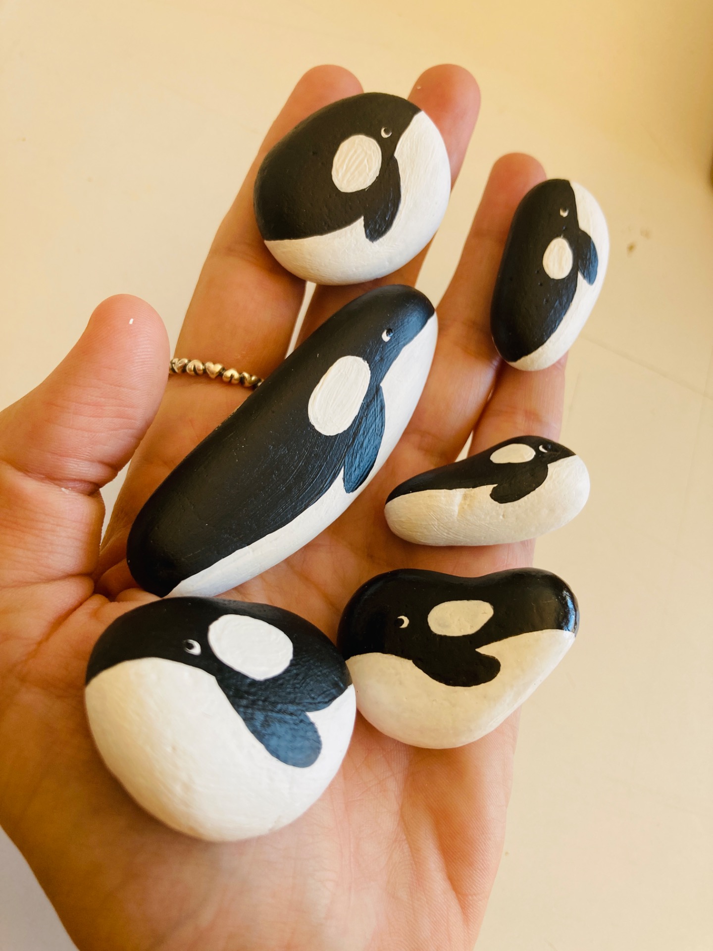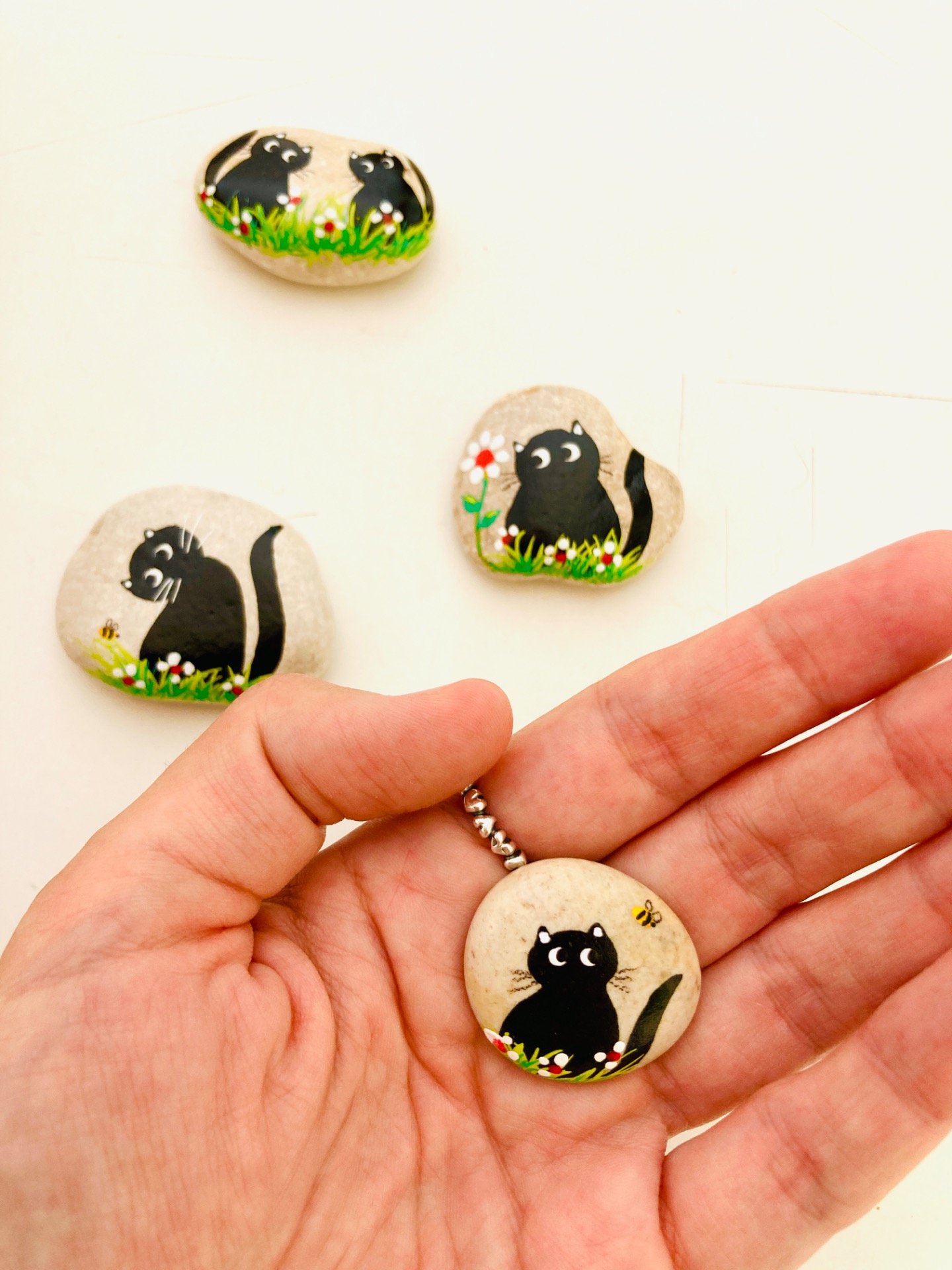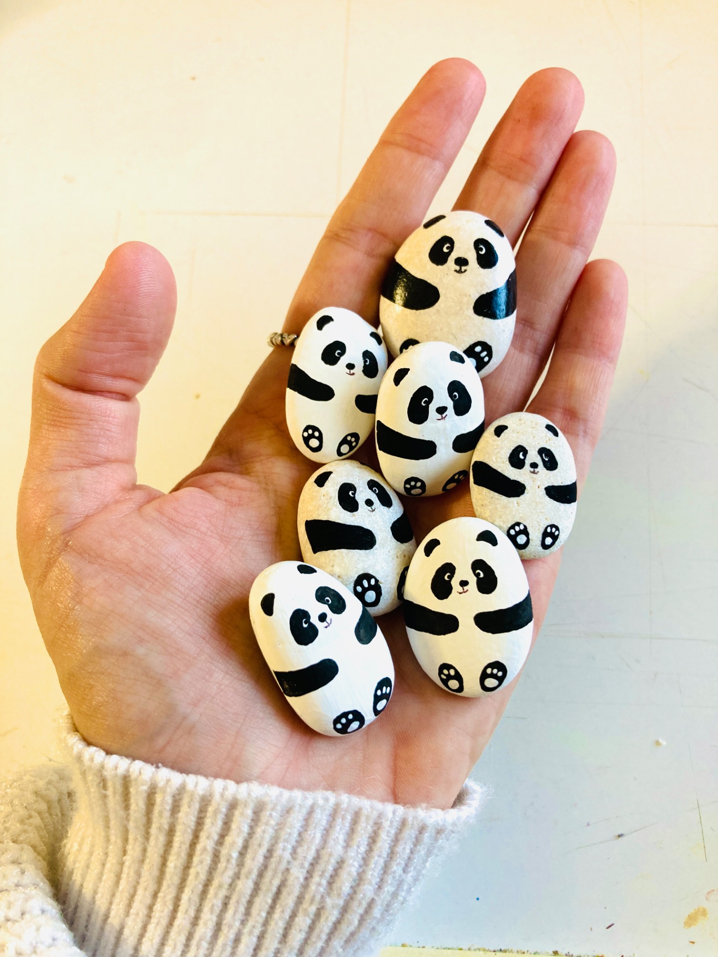 Pedras pintadas à mão com tinta acrílica, envernizadas. O tamanho das pedras varia entre 1 cm e 3 cm de comprimento. Podem ser utilizadas como extra para o jogo Era uma Vez.