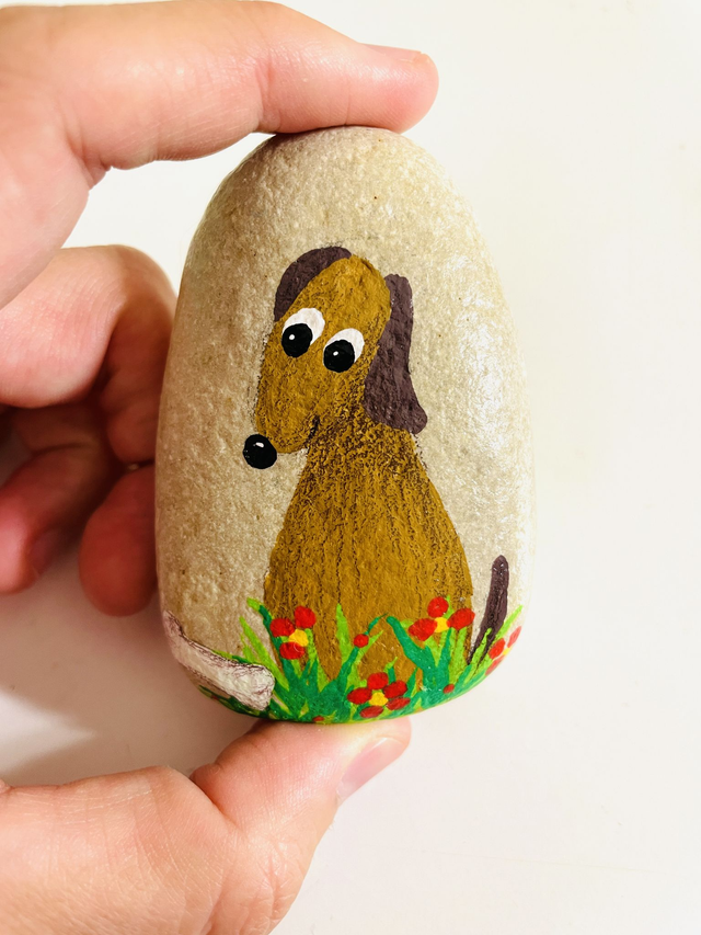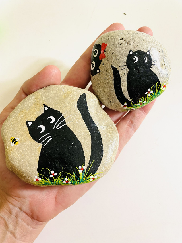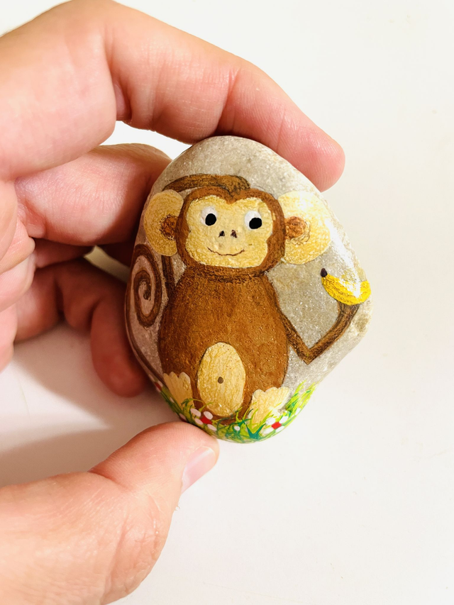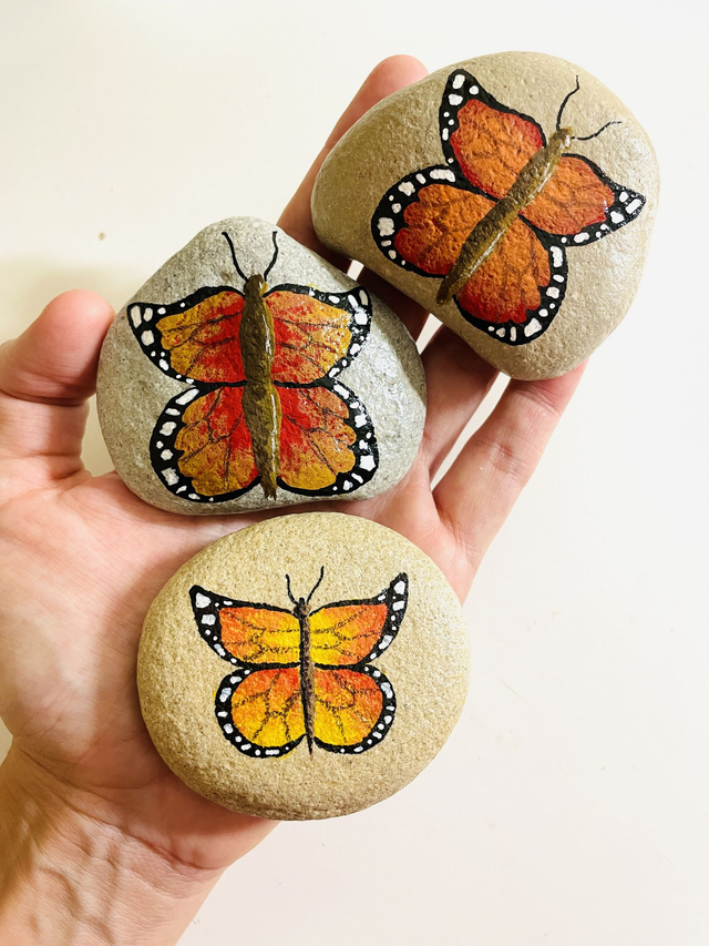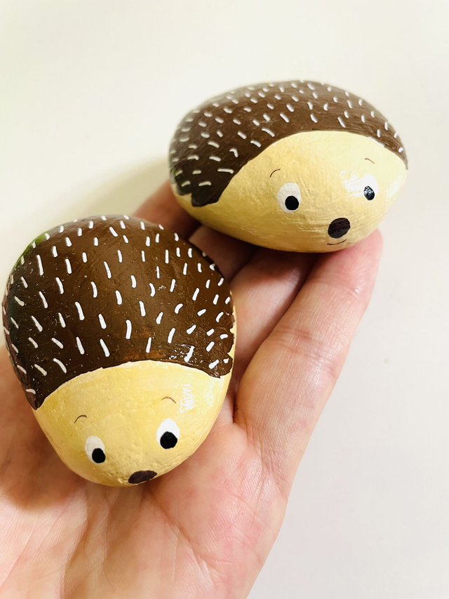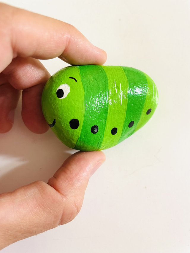 Pedra pintada à mão com tinta acrílica e envernizada, em saco de algodão. O tamanho das pedras varia entre 4 cm e 10 cm de comprimento.