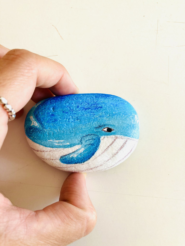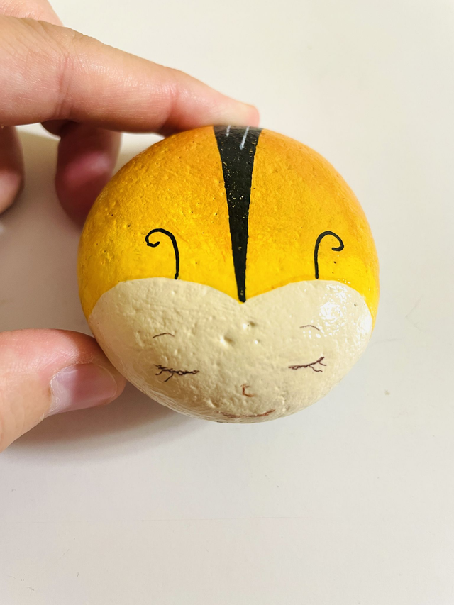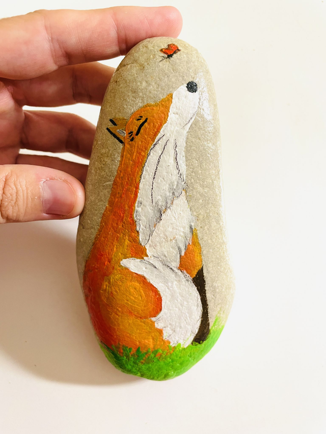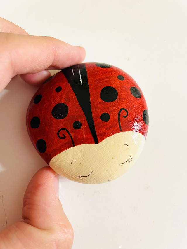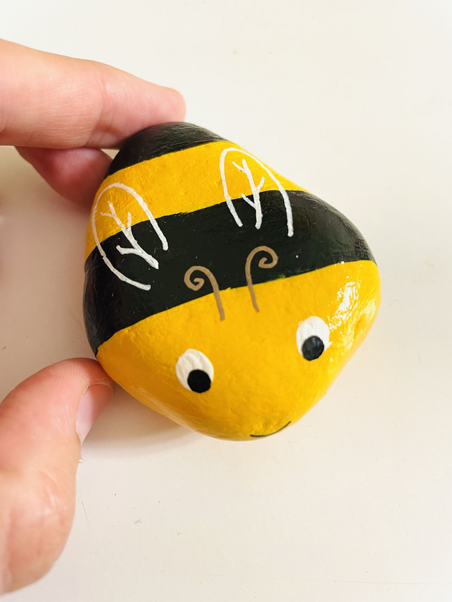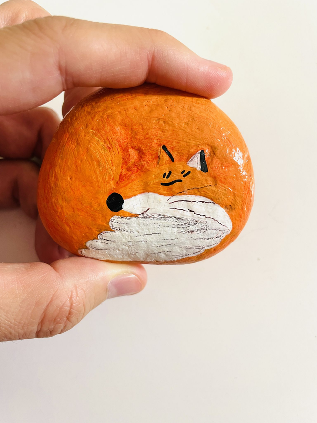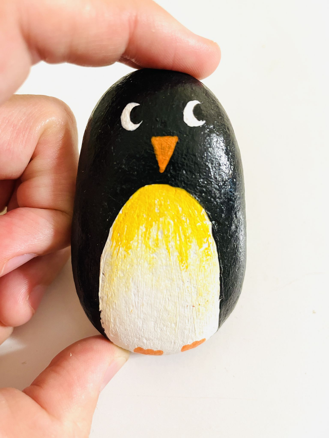 Pedra pintada à mão com tinta acrílica e envernizada, em saco de algodão. O tamanho das pedras varia entre 4 cm e 10 cm de comprimento.
