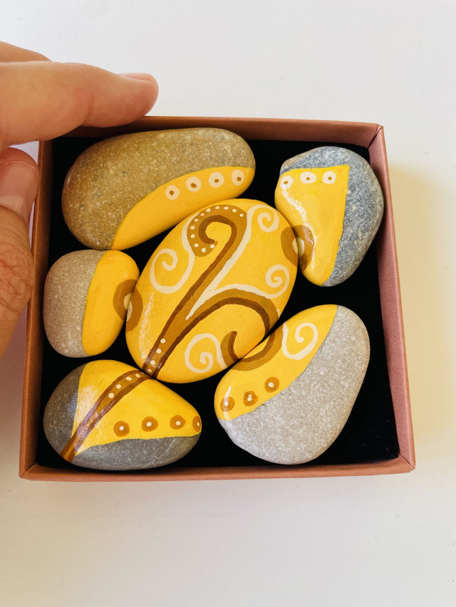 Caixa com seis pedras pintadas formando um puzzle de uma folha amarela e com uma frase escrita por baixo de cada pedra. As frases são poéticas, de amor próprio, de força e de esperança.
