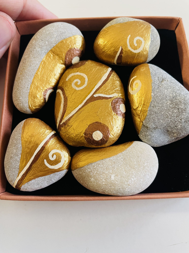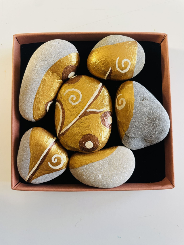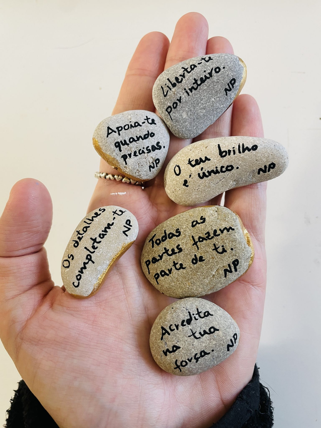 Caixa com seis pedras pintadas formando um puzzle de uma folha dourada e com uma frase escrita por baixo de cada pedra. As frases são poéticas, de amor próprio, de força e de esperança.