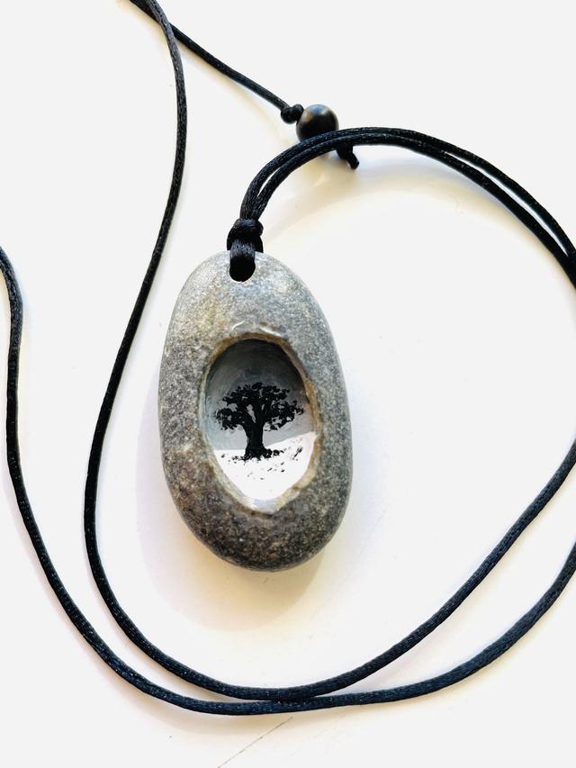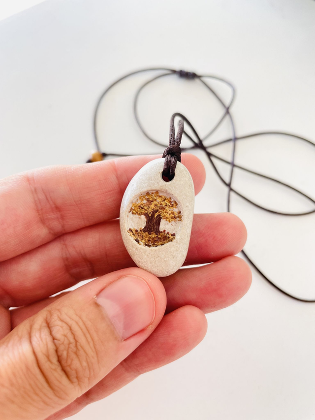 Colar com pedra esculpida e pintada à mão. Com um desenho de uma árvore escondida, como se guardasse um segredo de amor próprio. A parte de trás da pedra, tem escrita a frase "Aqui estou em paz".