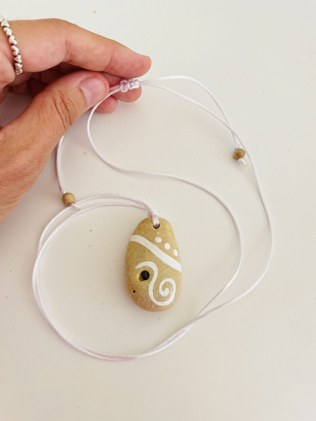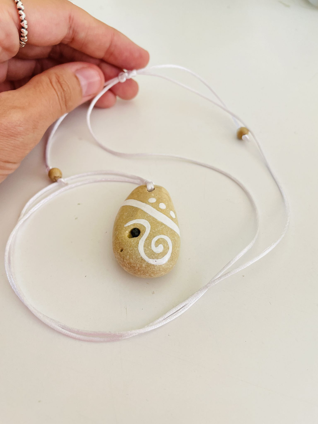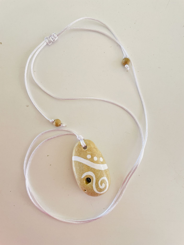 Colar com pintada à mão, artesanal. A pedra apanhada na praia tem uma pequena pedra escura escondida. O desenho envolve a pedra pequena, como uma brisa suave.
