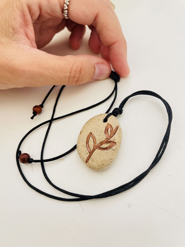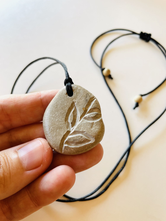 Colar com pedra esculpida e pintada à mão, artesanal. A pedra apanhada na praia é um pedaço desta terra onde vivemos. O desenho das folhas representa natureza, crescimento, vida.