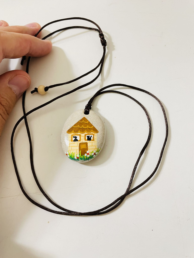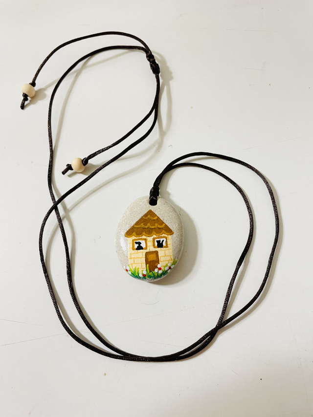 Colar com pedra pintada à mão. Com a ilustração de uma casa.