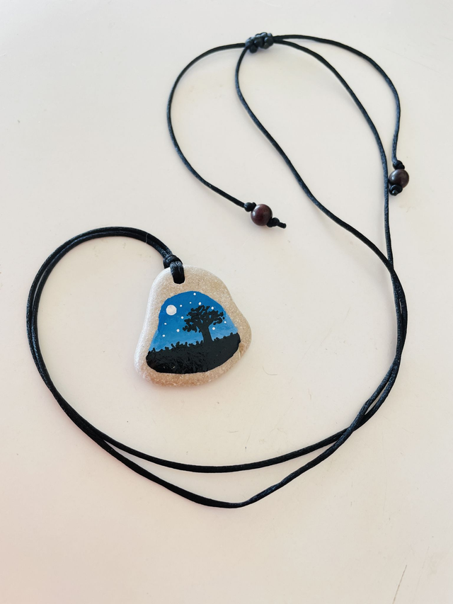 Colar com pedra pintada à mão. Com a ilustração de uma paisagem ao anoitecer.
