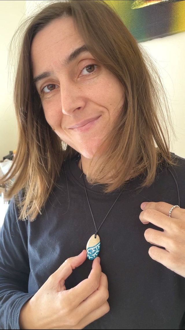 Colar com pedra pintada à mão. O desenho representa as raízes que nos ligam ao mundo e que nos unem uns aos outros. Esta é a nossa casa. E esta casa é de todos.