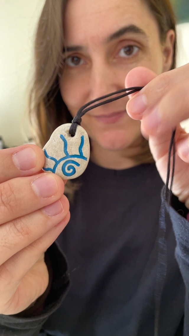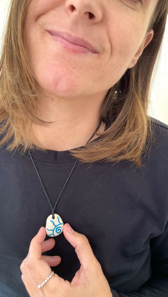 Colar com pedra ilustrada com um sol em tons de azul, pintada à mão. A pedra apanhada na praia é um pedaço desta terra onde vivemos. O sol aquece o corpo e a alma.