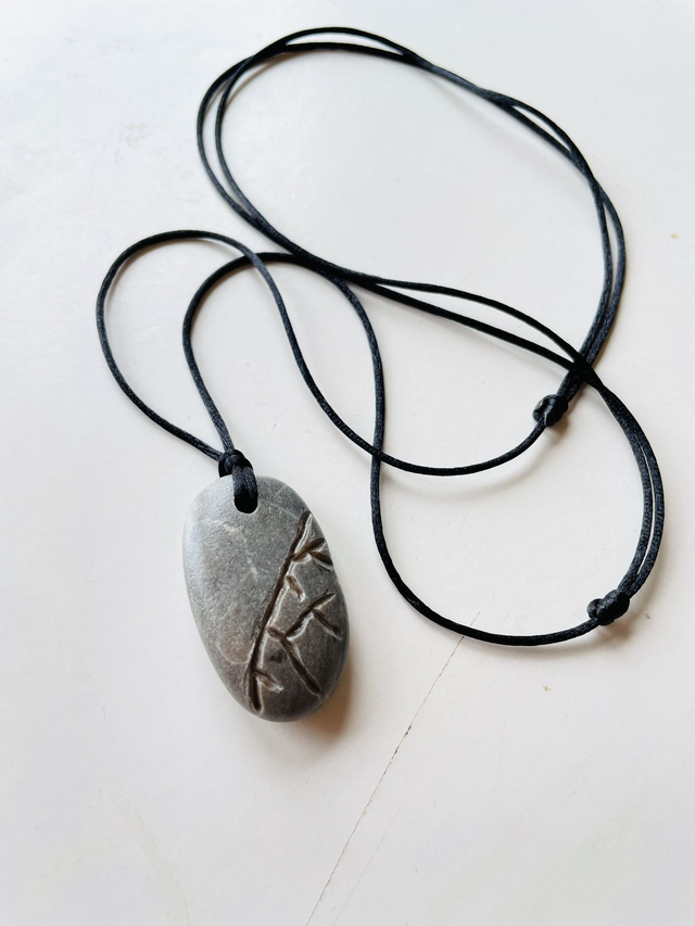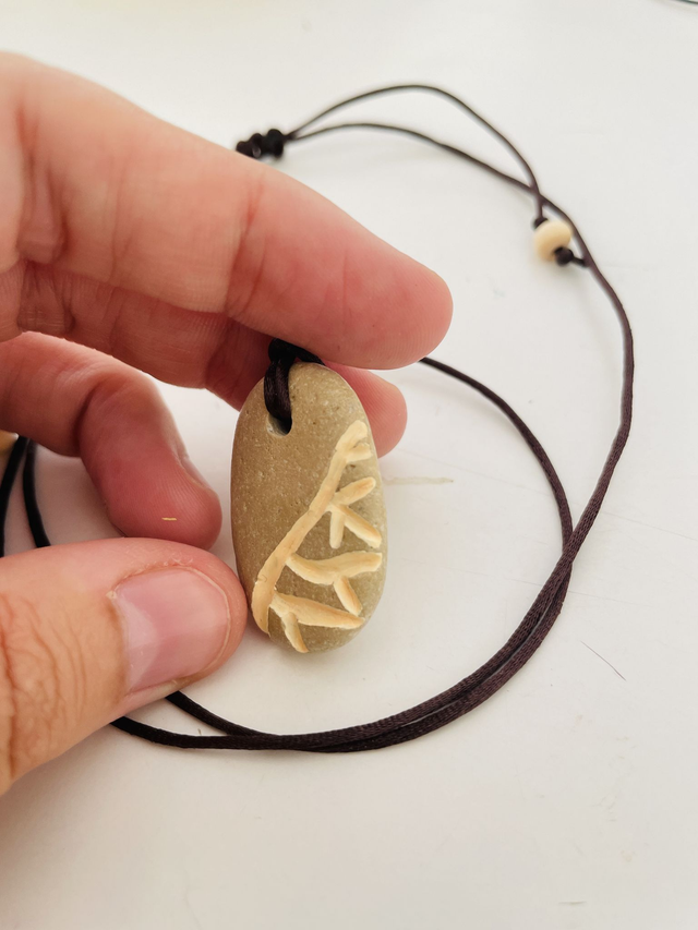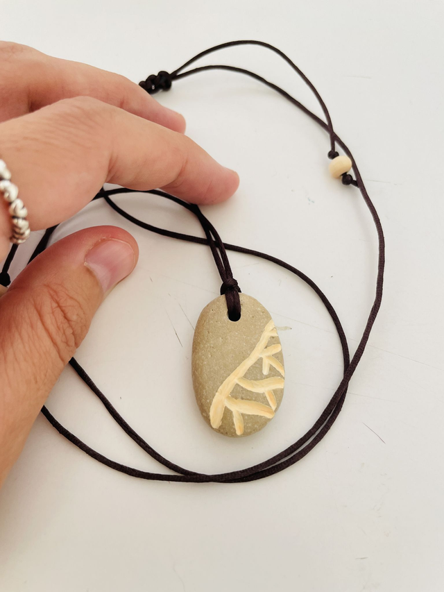 Colar com pedra esculpida. O desenho representa as raízes que nos ligam ao mundo e que nos unem uns aos outros. Esta é a nossa casa. E esta casa é de todos.