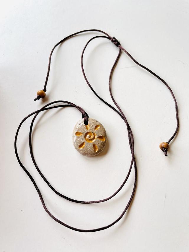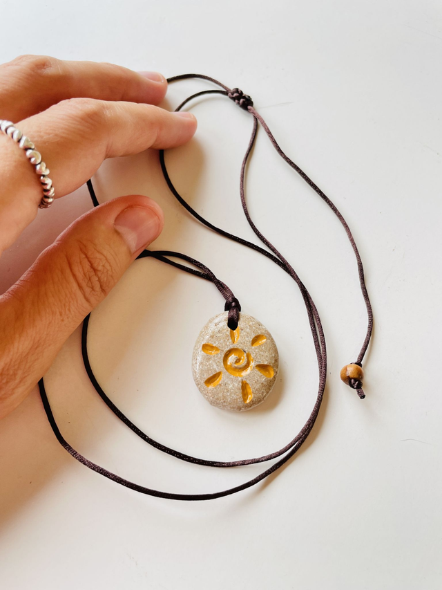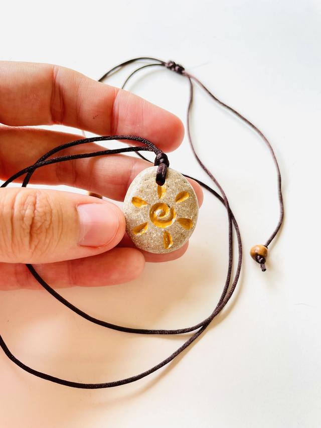 Colar com pedra esculpida e pintada à mão, artesanal. A pedra apanhada na praia é um pedaço desta terra onde vivemos. O sol aquece o corpo e a alma.
